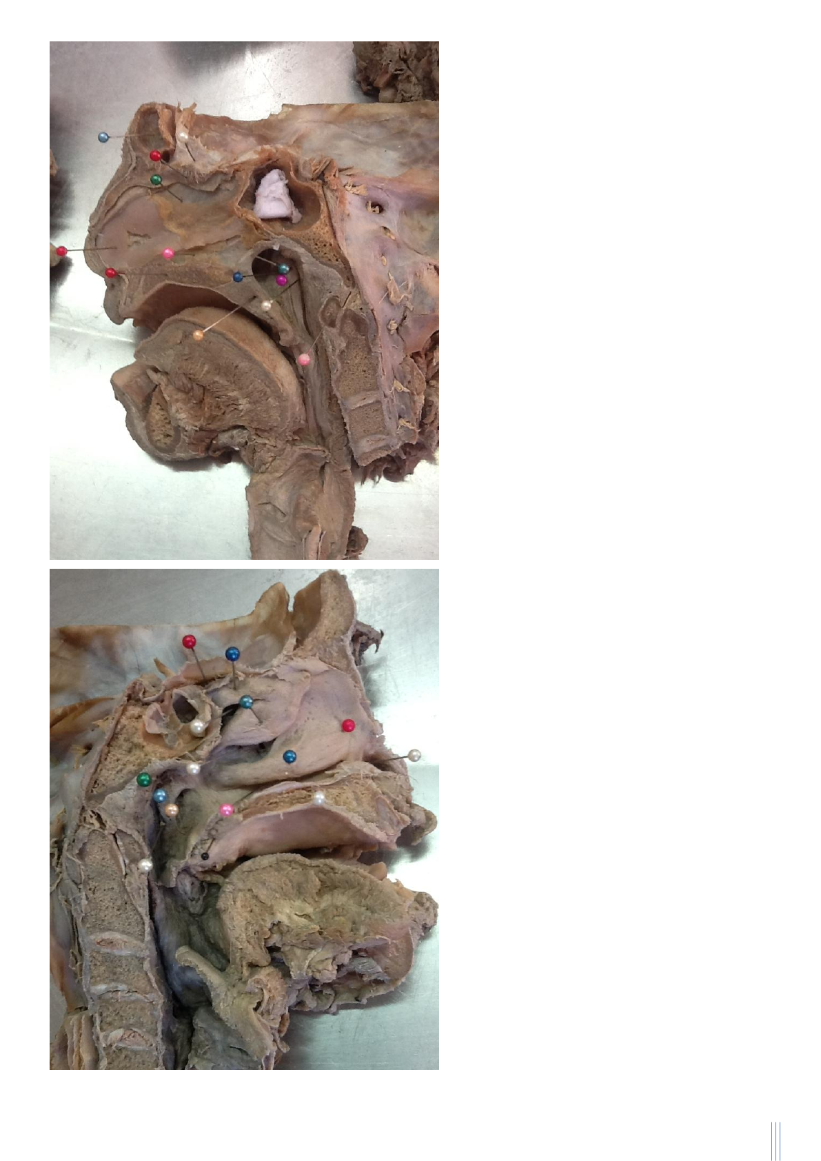 Azul metálico: Seio frontal Branco: Bulbo olfatório Vermelho Sup.: Nervos olfatórios Vermelho Méd.: Cartilagem do septo nasal Vermelho Inf.: Palato duro Verde Sup.: Lâmina perpendicular do Etmóide Rosa: Vômer Verde Inf.: Coanas Azul marinho: Tórus tubário Lilás: Óstio faríngeo da tuba auditiva Branco: Inf: Recesso faríngeo Rosa Inf.: Corpo anterior de Atlas Bege: Palato mole Papel: Seio esfenoidal Branco 1: Vestíbulo do nariz Branco 2: Palato duro Branco 3: Prega salpingofaríngea Branco 4: Meato médio Branco 5: Meato superior Rosa: Meato inferior Preto: Palato mole Vermelho Sup.: Recesso esfenoetmoidal Vermelho Inf.: Átrio do meato médio Azul marinho Sup.: Concha nasal superior Azul metálico Sup.: Concha nasal média Azul marinho Inf.: Concha nasal inferior Bege: Óstio faríngeo da tuba auditiva Azul metálico Inf.: Tórus tubário Verde: Recesso faríngeo Bege: Ligamento tireo-hióideo mediano Branco:Lâmina dir. da cartilagem tireóideo Vermelho: Ligamento cricotireóideo mediano Azul: Cartilagem cricóide Rosa: Cone elástico Verde: Cartilagens traqueais Azul: Epiglote Branco Lateral: Prega ariepiglótica direita Bege: Corno superior da cart. Tireóidea Vermelho Lateral: Cartilagem tireóidea Branco: Tubérculo corniculado Vermelho: Tubérculo cuneiforme Seta Azul: Parte membranosa da traqueia Azul metálico: Cartilagem epiglótica Verde: Cartilagem tireóidea Azul marinho: Cartilagem cricóidea Vermelho Sup.: Prega vestibular Vermelho Inf.: Prega vocal Rosa: Ventrículo da laringe Círculo azul: Vestíbulo da laringe Círculo verde: Região infraglótica Alfinetes (Brônquios lobulares, direito): Lilás: Anterior Azul Sup.: Apical Azul marinho: Posterior Vermelho: Lateral Azul: Medial Rosa: Superior Verde: Basilar medial Preto: Basilar posterior Azul: Basilar lateral Lilás: Anterior Esquerdo: Azul: Apicoposterior Preto: Anterior Vermelho: Lingular superior Branco: Lingular inferior Rosa metálico: Superior Lilás: Anterior Verde: Posterior Rosa: Lateral Amarelo: Medial ( A ponta dele está torta) Setas: Azul: Bifurcação da Traqueia(Carina) Amarelo: Brônquios principais Verde: Brônquios lobares superiores Lilás: Brônquio lobar médio Vermelho: Brônquio lobar inferior Laranja: Cartilagem traqueal Preto: Ligamento anular Pulmão Direito: Amarelo: Lóbulo Apical Vermelho: Lóbulo posterior Laranja: Lóbulo Anterior Seta Azul: Fissura oblíqua Seta verde: Fissura horizontal Lilás: Lóbulo Lateral Verde: Lóbulo Medial Preto: Lóbulo Superior Branco: Lóbulo basilar Lateral Azul: Lóbulo basilar Anterior Pulmão direito: Amarelo: Lóbulo Apical Vermelho: Lóbulo posterior Laranja: Lóbulo Anterior Verde: Lóbulo Medial Preto: Lóbulo superior Lilás: Lóbulo basilar medial Laranja: Lóbulo basilar posterior Azul: Lóbulo basilar anterior Branco: Lóbulo basilar lateral Pulmão esquerdo: Azul Sup.: Apicoposterior Preto Sup.: Anterior Azul inf.: Lingular superior Preto Inf.: Lingular inferior Vermelho: Basilar Anterior Verde: Basilar Lateral Seta preta: Superior Seta amarela: Fissura oblíqua Vermelho: Apicoposterior Rosa Pink: Anterior Rosa claro: Lingular superior Amarelo: Lingular inferior Círculo laranja: Superior Círculo Amarelo: basilar posterior Círculo vermelho: Basilar anterior Círculo preto: Basilar lateral