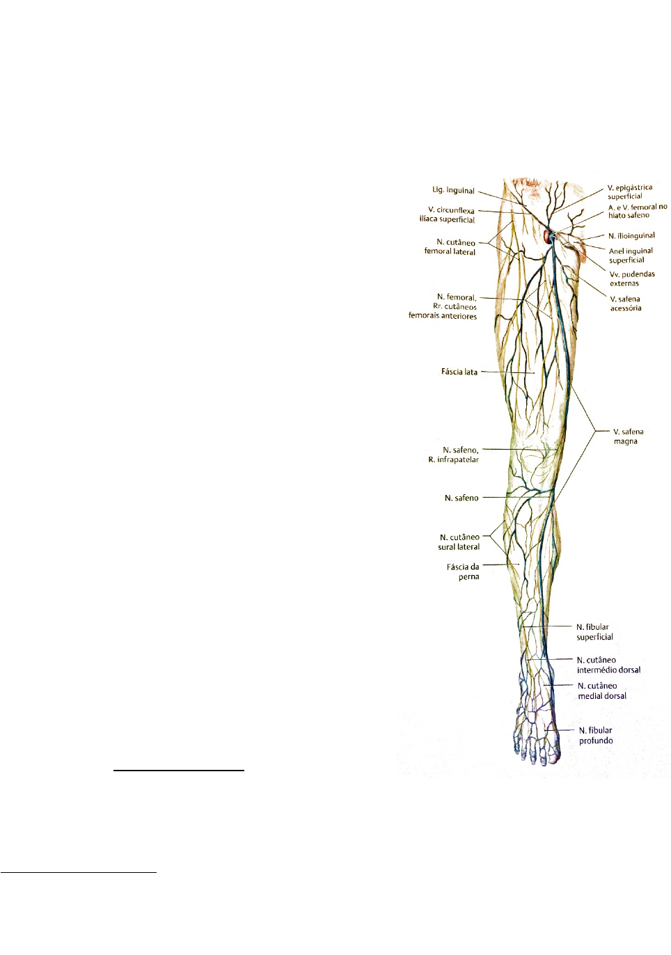 ANATOMIA Membros Inferiores Os membros superiores são muito diferentes dos membros inferiores. Os membros superiores são especializados na manipulação de ferramentas e instrumentos, enquanto que os membros inferiores são especializados em: 1) Sustentação do peso corporal; 2) Manutenção do equilíbrio (estabilidade postural); e 3) Locomoção. Então, exatamente por isso, por ter essa especificidade, os membros inferiores são acometidos mais frequentemente por processos traumáticos e degenerativos, sendo os principais: artrose, que é a degeneração da articulação até chegar a perder totalmente o movimento; fraturas; luxações; subluxações, rompimento de ligamentos, entre outros. Para entender as patologias dos membros inferiores, é preciso conhecer bem a anatomia dessa região. Tanto a anatomia normal quanto a patológica. Quando você lesiona um nervo, que grupo muscular vai deixar de funcionar? Quais irão predominar? Que tipo de marcha o indivíduo vai adotar se ficar com sequela? Teremos as respostas para essas perguntas quando conhecermos bem a anatomia da região. Na imagem ao lado temos uma visão da camada superficial do membro inferior. Pele e gordura foram retiradas, deixando-se exposta a fáscia muscular da coxa, denominada fáscia lata. A fáscia lata envolve a musculatura e dá a delimitação entre estruturas superficiais e profundas. Então, sobre a fáscia lata, é possível visualizar os nervos cutâneos: nervo cutâneo lateral da coxa e o nervo cutâneo anterior da coxa. Esses nervos cutâneos são nervos superficiais e são responsáveis pela sensibilidade da pele. Eles vão dar: · 20 · Sensibilidade geral; · Exteroceptiva; · Dor; · Tato; · Temperatura; e · Pressão. Além de sensitivos, esses nervos cutâneos são nervos motores viscerais. Ou seja, eles têm fibras do SNA simpático que vão para os músculos eretores do pelo para eriçar os pelos; vão para as glândulas sebáceas; e vão pra musculatura lisa dos vasos cutâneos. Sobre a fáscia lata também conseguimos visualizar as veias cutâneas. A veia safena magna é uma veia superficial que desemboca numa veia profunda. Na região superomedial da coxa, existe uma abertura na fáscia lata denominada hiato safeno ou fossa oval que vai dar passagem à veia safena magna, permitindo que ela desemboque na veia femoral, que é uma veia profunda. Essas estruturas citadas anteriormente (nervos e vasos cutâneos) são estruturas superficiais. Na imagem se seguir você vê o plexo nervoso que vai dar inervação de todo membro inferior, que é o plexo lombossacral ou plexo sacrolombar. A parte superior do plexo é lombar, enquanto que a parte inferior é sacral. O plexo lombossacral vai dar toda a inervação do membro inferior. Ele é um plexo formado pelos nervos espinhais que vão desde o L1 até S4. O S5 já não participa. Esse plexo lombossacral vai dar como nervos terminais mais importantes: · Nervo femoral Inerva a musculatura anterior da coxa. · Nervo obturatório Passa pelo forame obturatório e vai inervar o grupo medial dos músculos da coxa, que são músculos adutores; · Nervo isquiático Inerva a parte posterior da coxa, toda a perna e todo o pé. O nervo femoral é formado por fibras de L2 a L4. Importante lembrar que ele inerva a musculatura anterior da coxa. O nervo obturatório que inerva a musculatura medial, adutora, é formado por fibras de L2, L3 e L4. Pergunta: professor, qual que é formado por L2, L3 e L4, o femoral ou o obturatório? Resposta: Todos os dois. Tanto o obturatório quanto o femoral são formados por fibras de L2, L3 e L4. Temos nervinho importante que tem fibras de L1 e L2 denominado nervo genito-femoral. Esse nervo tem importância clínica, pois é capaz de transmitir dores do abdome para a coxa, não todas as dores mas muitas delas. Ou seja, uma dor na coxa pode significar um problema dentro do abdome que está sendo refletido, se irradiando na coxa. A parte sacral do plexo lombossacral, ilustrada na imagem acima, vai de L4 até S4. Perceba que L4 participa tanto da parte lombar quanto da parte sacral. O nervo isquiático – que inerva a parte posterior da musculatura da coxa, toda musculatura da perna e toda musculatura do pé – é o nervo mais importante da parte sacral. Ele é formado por fibras que vem de L4, L5, S1, S2 e S3. O nervo isquiático é o nervo mais calibroso do corpo humano, pois é formado por contribuições de cinco nervos espinhais. Observe na imagem acima que o nervo isquiático é formado por duas partes: essa que está em verde e essa que está em amarelo. A parte verde é a parte fibular comum do nervo isquiático. Ela é menos calibrosa e mais lateral. A parte em amarelo, mais robusta, é a parte tibial do nervo isquiático. Próximo ao joelho, no terço inferior da coxa, o nervo isquiático vai se dividir exatamente nesses dois nervos, o nervo fibular comum e o nervo tibial. Outro nervo importante é o nervo pudendo, formado por fibras de S2, S3 e S4. Ele inerva a musculatura e estruturas do períneo. É esse nervo que é anestesiado quando se faz a episiotomia durante o parto, facilitando a saída do neném. Formado por fibras de S4 e S5 temos o nervo coccígeo, você tem um plexo pequeno que é o plexo coccígeo. Juntamente com o pudendo, esse plexo participa da inervação do períneo. No membro inferior, envolvendo toda a musculatura da coxa, temos a fáscia lata. Ela é contínua com a fáscia da perna na porção mais distal da coxa e é continua também com fáscia glútea, na região proximal. A fáscia envolve toda a musculatura e atua como uma espécie de contenção muscular. A fáscia lata possui uma abertura na região súpero-medial da coxa, uma espécie de fenda, que é chamada de hiato safeno (ou fossa oval). Essa abertura permite à veia safena mergulhar nesse hiato para desembocar em uma veia profunda, a veia femoral. A região lateral da fáscia lata é mais espessa e esse espessamento lateral recebe 