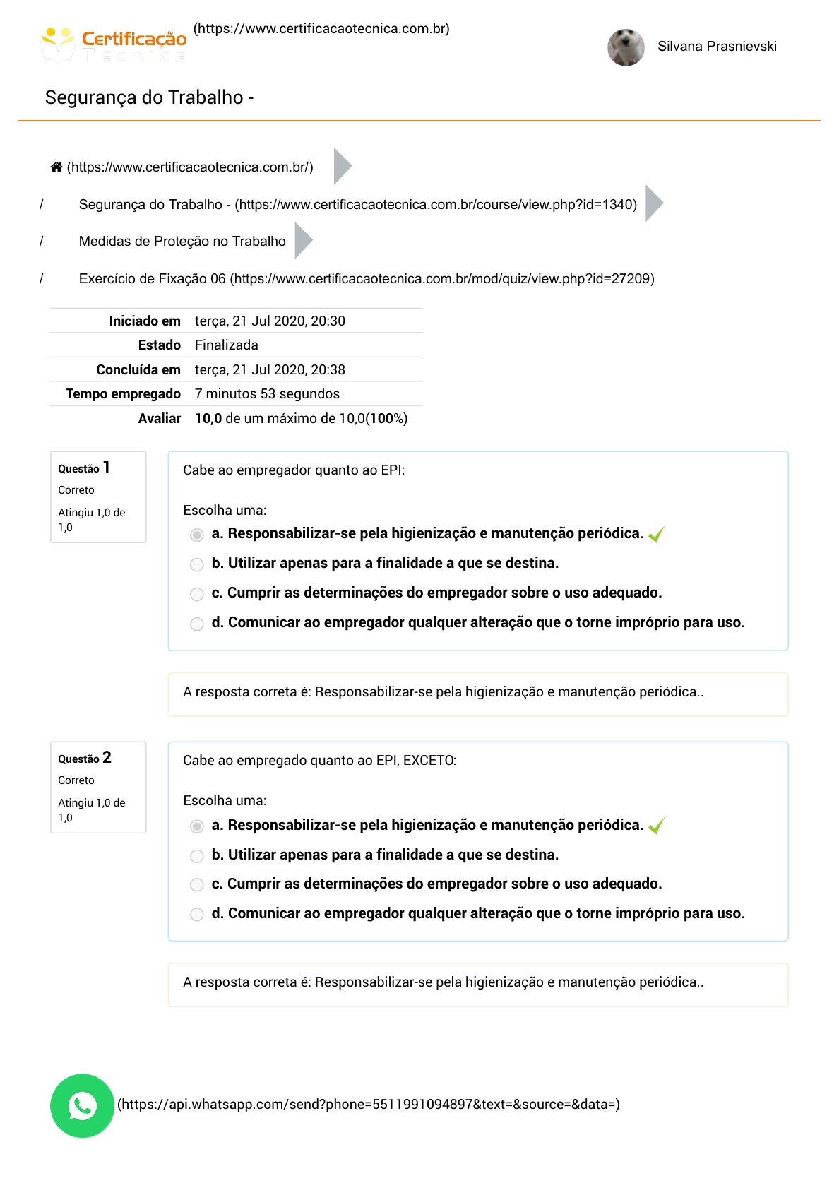 / (https://www.certificacaotecnica.com.br) Silvana Prasnievski Segurança do Trabalho - Questão 1 Correto Atingiu 1,0 de 1,0 Questão 2 Correto Atingiu 1,0 de 1,0 / / / Iniciado em terça, 21 Jul 2020, 20:30 Estado Finalizada Concluída em terça, 21 Jul 2020, 20:38 Tempo empregado 7 minutos 53 segundos Avaliar 10,0 de um máximo de 10,0(100%) Cabe ao empregador quanto ao EPI: Escolha uma: a. Responsabilizar-se pela higienização e manutenção periódica. b. Utilizar apenas para a finalidade a que se destina. c. Cumprir as determinações do empregador sobre o uso adequado. d. Comunicar ao empregador qualquer alteração que o torne impróprio para uso. A resposta correta é: Responsabilizar-se pela higienização e manutenção periódica.. Cabe ao empregado quanto ao EPI, EXCETO: Escolha uma: a. Responsabilizar-se pela higienização e manutenção periódica. b. Utilizar apenas para a finalidade a que se destina. c. Cumprir as determinações do empregador sobre o uso adequado. d. Comunicar ao empregador qualquer alteração que o torne impróprio para uso. A resposta correta é: Responsabilizar-se pela higienização e manutenção periódica.. (https://www.certificacaotecnica.com.br/) Segurança do Trabalho - (https://www.certificacaotecnica.com.br/course/view.php?id=1340) Medidas de Proteção no Trabalho Exercício de Fixação 06 (https://www.certificacaotecnica.com.br/mod/quiz/view.php?id=27209) (https://api.whatsapp.com/send?phone=5511991094897&text=&source=&data=) https://www.certificacaotecnica.com.br/ https://www.certificacaotecnica.com.br/ https://www.certificacaotecnica.com.br/course/view.php?id=1340 https://www.certificacaotecnica.com.br/mod/quiz/view.php?id=27209 https://api.whatsapp.com/send?phone=5511991094897&text=&source=&data= / Questão 3 Correto Atingiu 2,0 de 2,0 Questão 4 Correto Atingiu 2,0 de 2,0 Questão 5 Correto Atingiu 2,0 de 2,0 São exemplos de EPI para proteção respiratória, EXCETO: Escolha uma: a. Respirador purificador de ar b. Respirador de fumo c. Respirador de fuga d. Respirador de adução de ar A resposta correta é: Respirador de fumo. São exemplos de EPI para proteção dos membros inferiores: Escolha uma: a. Creme protetor de segurança para proteção dos membros superiores contra agentes químicos b. Manga de segurança para proteção do braço e do antebraço contra agentes cortantes e perfurantes. c. Meia de segurança para proteção dos pés contra baixas temperaturas. d. Braçadeira de segurança para proteção do antebraço contra agentes cortantes. A resposta correta é: Meia de segurança para proteção dos pés contra baixas temperaturas.. "A empresa é obrigada a fornecer aos empregados, gratuitamente, EPI adequado ao risco, em perfeito estado de conservação e funcionamento, nas seguintes circunstâncias, EXCETO:_____" Escolha uma: a. Sempre que as medidas de ordem geral não ofereçam completa proteção contra os riscos de acidentes do trabalho ou de doenças profissionais e do trabalho. b. Enquanto as medidas de proteção coletiva estiverem sendo implantadas. c. Para atender a situações de emergência. d. Enquanto as medidas de proteção individual estiverem sendo implantadas. A resposta correta é: Enquanto as medidas de proteção individual estiverem sendo implantadas.. (https://api.whatsapp.com/send?phone=5511991094897&text=&source=&data=) https://api.whatsapp.com/send?phone=5511991094897&text=&source=&data= / Questão 6 Correto Atingiu 1,0 de 1,0 Questão 7 Correto Atingiu 1,0 de 1,0 "Nas empresas desobrigadas a constituir SESMT, cabe ao empregador selecionar o EPI adequado ao risco, mediante orientação de profissional tecnicamente habilitado, ouvida a CIPA ou, na falta desta, o _______________ e trabalhadores usuários. Preenche corretamente a lacuna:_____" Escolha uma: a. Técnico em Segurança do Trabalho b. Engenheiro de Segurança do Trabalho c. Designado d. Presidente da CIPA A resposta correta é: Designado. São exemplos de EPI para proteção do tronco: Escolha uma: a. Manga de segurança para proteção do braço e do antebraço contra agentes cortantes e perfurantes. b. Manga de segurança para proteção do braço e do antebraço contra choques elétricos. c. Manga de segurança para proteção do braço e do antebraço contra agentes abrasivos e escoriantes. d. Colete à prova de balas de uso permitido para vigilantes que trabalhem portando arma de fogo, para proteção do tronco contra riscos de origem mecânica. A resposta correta é: Colete à prova de balas de uso permitido para vigilantes que trabalhem portando arma de fogo, para proteção do tronco contra riscos de origem mecânica.. (https://api.whatsapp.com/send?phone=5511991094897&text=&source=&data=) https://api.whatsapp.com/send?phone=5511991094897&text=&source=&data=