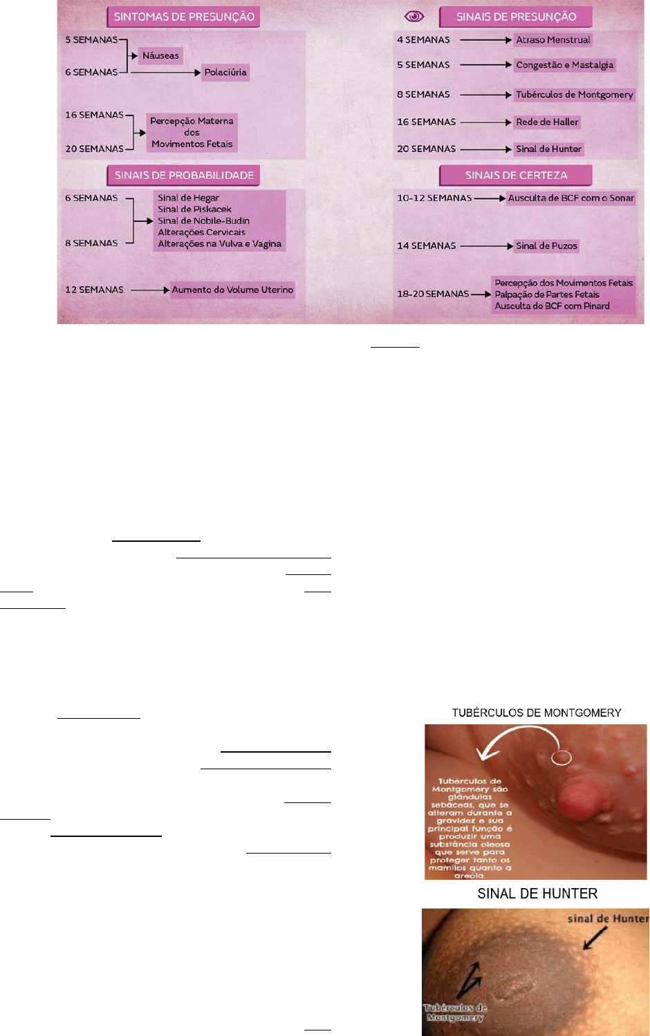 Cássia Mendes Ataide - UFMS DIAGNÓSTICO DE GRAVIDEZ Os achados na gravidez podem ser divididos em sinais de Presunção, Probabilidade e Certeza: Presunção: náuseas e vômitos, poliaciúria, nictúria (volume de urina noturna maior que a diurna), sialorreia, alterações de apetite (aumento, perversão), pirose, aversão a odores, lipotimia, tonturas, varizes, sonolência, alterações psiquiátricas (irritabilidade, labilidade emocional), atraso menstrual em até 14 dias, Cloasma gravídico/Máscara gravídica (manchas provocadas pelo aumento da produção de melanina circundando parte da testa, ao redor do naris, bochecha e lábio superior), linha nigra (pigmentação da linha alba), estrias, Sinal de Halban (aumento da lanugem nos limites do couro cabeludo), Tubérculos de Montgomery (glândulas sebáceas hipertrofiadas nas aréolas), rede de Haller (aumento da vascularização venosa da mama), Sinal de Hunter (hipopigmentação da aréola primária e aparecimento da aréola secundária com limites imprecisos). Probabilidade: atraso menstrual maior que 14 dias, amolecimento do colo uterino percebido pelo toque (semelhante à consistência labial) a partir de 6 semanas de gestação, Sinal de Hegar (amolecimento do istmo uterino feito durante o toque bimanual, o qual é semelhante à separação do corpo da cérvice), Sinal de Piskacek (assimetria uterina à palpação), Sinal de Nobile-Budin (percepção pelo toque do preenchimento do fundo de saco pelo útero gravídico – útero se tona globoso), Sinal de Osiander (percepção do pulso da arteria vaginal ao toque vaginal), Sinal de Jacquemier (coloração violácea do meato urinário e da vulva – entre 8 e 12 semanas), Sinal de Klunge (coloração violácea da vagina – entre 8 e 12 semanas), alterações muco-cervicais (o muco torna-se viscoso, mais espesso e não se cristaliza), aumento do volume uterino (o útero aumenta de tamanho em cerca de 1 cm por semana após 4 semanas de gestação). Certeza: ausculta de batimentos cardiofetais com estetoscópio de Pinard (a partir de 20 semanas) ou sonar (de 10 a 12 semanas), percepção de partes e movimentos fetais pelo examinador (palpação abdominal consegue perceber os movimento do feto de 18 a 20 semanas), Sinal de Puzos (rechaço fetal uterino - durante o exame bimanual um discreto impulso no útero, por meio do fundo de saco anterior, deslocará o feto no líquido amniótico para longe do dedo do examinador; a tendência do retorno do feto faz com que ele seja novamente palpável. SINAIS → Atraso menstrual: sinal cardinal Superior a 10-14 dias → Alterações cutâneas: estria, cloasma (melasma) gravídico, linha nigra, sinal de Halban (aumento da lanugem que aparece nos limites do couro cabeludo) → Alterações mamárias: congestão e dor (5ª semana); aréolas primárias tornam-se mais pigmentadas e surgem projeções secundárias representadas por glândulas mamárias acessórias e sebáceas hipertrofiadas denominadas “Tubérculos de Montgomery” (8ª s); colostro e aumento da vascularização venosa chamada “rede de Haller” (16ª s); aumento da pigmentação dos mamilos, que torna os limites imprecisos - “sinal de Hunter” (20ª s) Cássia Mendes Ataide - UFMS → Alterações uterinas: inicia nas primeiras semanas o aumento do diâmetro anteroposterior do útero → 12ªs palpável acima da sínfise púbica; 16ªs entre a sínfise e a cicatriz umbilical; 20ª s atinge cicatriz umbilical; 40ªs no apêndice xifoide → Sinal de Hartman: sangramento que ocorre 7-8 dias após a fecundação devido à implantação do blastocisto que se inicia no 6° dia → Alterações no muco cervical: secreção com redução da concentração de sódio devido à progesterona, não assumindo a imagem microscópica em “folhas de samambaia” → Sinais ligados ao desenvolvimento uterino Sinal de Hegar: entre a 6ª e 8ª semana, o útero assume consistência elástica e amolecida, sobretudo Regra de Goodel: amolecimento do colo uterino percebido ao toque vaginal → consistência semelhante à labial Sinal de Osiander: percepção do pulso da artéria vaginal ao toque vaginal Sinal de Hozapfel: peritônio torna-se rugoso Sinal de Piskacek: assimetria uterina à palpação → o sítio de implantação ovular torna-se amolecido e abaulado em comparação ao restante do útero Sinal de Nobile-Budin: percepção do preenchimento do fundo de saco vaginal pelo útero gravídico, através do toque bimanual → Sinais ligados às alterações da tonalidade da mucosa vulvar e vaginal Sinal de Jacquemier ou Chadwick: coloração violácea da mucosa vulvar, do vestíbulo e meato urinário Sinal de Kluge: tonalidade violácea da mucosa vaginal → BCF: a partir de 10 semanas com o sonar e 20 semanas com o pinard → Percepção de partes e movimentos fetais: a partir de 18-20 semanas é possível a identificação de segmentos Sinal de Puzos: detecta o rechaço fetal intrauterino a partir da 14ª semana → um impulso no útero durante o toque vaginal produz o deslocamento do feto no líquido amniótico para longe do dedo do examinador DIAGNÓSTICO LABORATORIAL Dosagem de Gonadotrofina Coriônica Humana (hCG) Cerca de 1 semana após a fertilização, o trofoblasto, implantado no endométrio, passa a produzir hCG em quantidades crescentes → encontrado no plasma ou urina materna DIAGNÓSTICO CLÍNICO São sintomas referidos na gestação inicial: náuseas, vômitos, sialorreia, aumento da sensibilidade álgica mamária, polaciúria, nictúria, distensão abdominal, constipação intestinal (progesterona), fadiga, tonteiras, sonolência, desejos alimentares, perversão do apetite (PICA), labilidade emocional, dor hipogástrica do tipo cólicas, aversão a odores, pirose e alterações das acuidades auditiva e visual. DIAGNÓSTICO ULTRASSONOGRÁFICO Via transabdmonial ou transvaginal (USGTV) Cássia Mendes Ataide - UFMS Manobra de Leopold-Zweifel: essa manobra tem intuito de deter