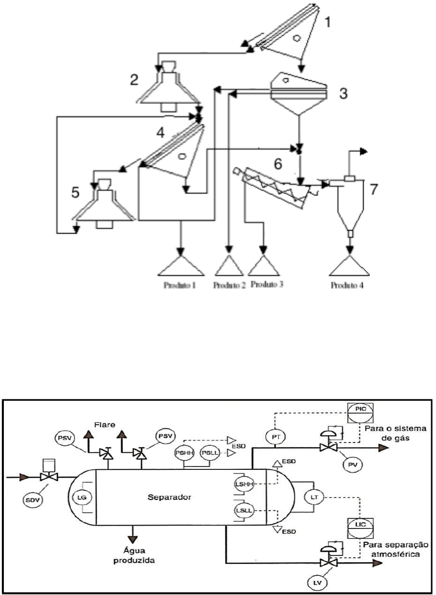 Automação e Controle – Eng. de Produção – Prof. Marco Aurélio S. Birchal 1ª Lista de exercícios – Instrumentação 1) Represente o fluxograma simplificado de um processo com dois reatores com agitação. No primeiro, R-01, o produto é transportado por bombeamento, para o reator R-02, seguindo para uma coluna de destilação, em que o produto de topo é reciclado e o de fundo segue para um tanque de estocagem. 2) Identifique os equipamentos e descreva o processo do seguinte fluxograma. 3) Elabore um fluxograma que contemple a área 03 de um processo, que possui um reator com alimentação de matéria-prima, cujo produto siga para um processo de filtração, com condição de refluxo. O filtrado segue para secagem em spray dryer, em que o produto é recolhido e segue para um silo de estocagem e o ar, com finos carreados, segue para um ciclone, cujo produto de topo é descarregado na atmosfera e o de fundo realimentado (reciclagem) no secador spray. 4) Descreva os instrumentos e malhas de controle do P&ID NOTA: ESD (Emergency Shutdown System) e SDV (Shutdown Valve) não fazem parte do sistema de controle de processo, mas do sistema de desligamento de emergência (ou sistema de intertravamento de segurança). Não fazem parte da norma ISA 5.1