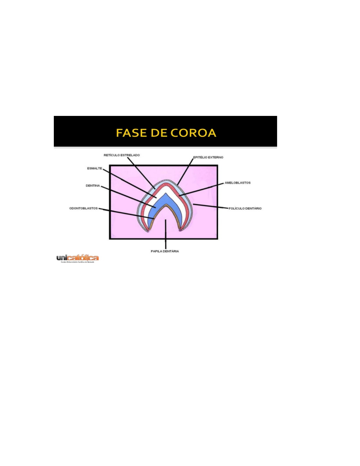 HISTOLOGIA E EMBRIOLOGIA FASE DE COROA E RAIZ. Fase de coroa ou campânula avançada: Acontece a redução da proliferação do órgão do esmalte e começa a fase de histodiferenciação e morfogênese avançado. A lâmina dentária se separa do germe dentário e o espaço que era preenchido por essa lâmina dentária pode dar origem a uma estrutura chamada de canais gobernaculares. Canais gobernaculares: é formado a partir de células epiteliais da lâmina. - Nessa fase de coroa ocorre a chamada indução recíproca: • As células do estrato intermediário induzem as do epitélio interno a inversão da polaridade e formam pré-ameloblastos (células cilindricas) • Pré- ameloblastos induzem as células da papila dentária e formam pré- odontoblastos. • Pré- odontoblastos iniciam a 1° camada de matriz da dentina, chamada dentina do manto (colágeno III) que não estará mineralizada. • A dentina do manto induz, através da polarização, a formação de ameloblastos que vão depositar a primeira camada de esmalte. Risogênese: Ocorre a proliferação da alça cervical: bainha epitelial de hertwig + diafragma epitelial. As células da bainha vão induzir células da papila a se diferenciarem em odontoblastos para a deposição de dentina radicular. O diafragma epitelial que determina o número de raizes dos dentes. A fragmentação da bainha radicular gera os restos epiteliais de malassez. Periodontogênese: A formação do periodonto (cemento, ligamento periodontal e osso alveolar) ocorro simultaneamente a formação da raiz.