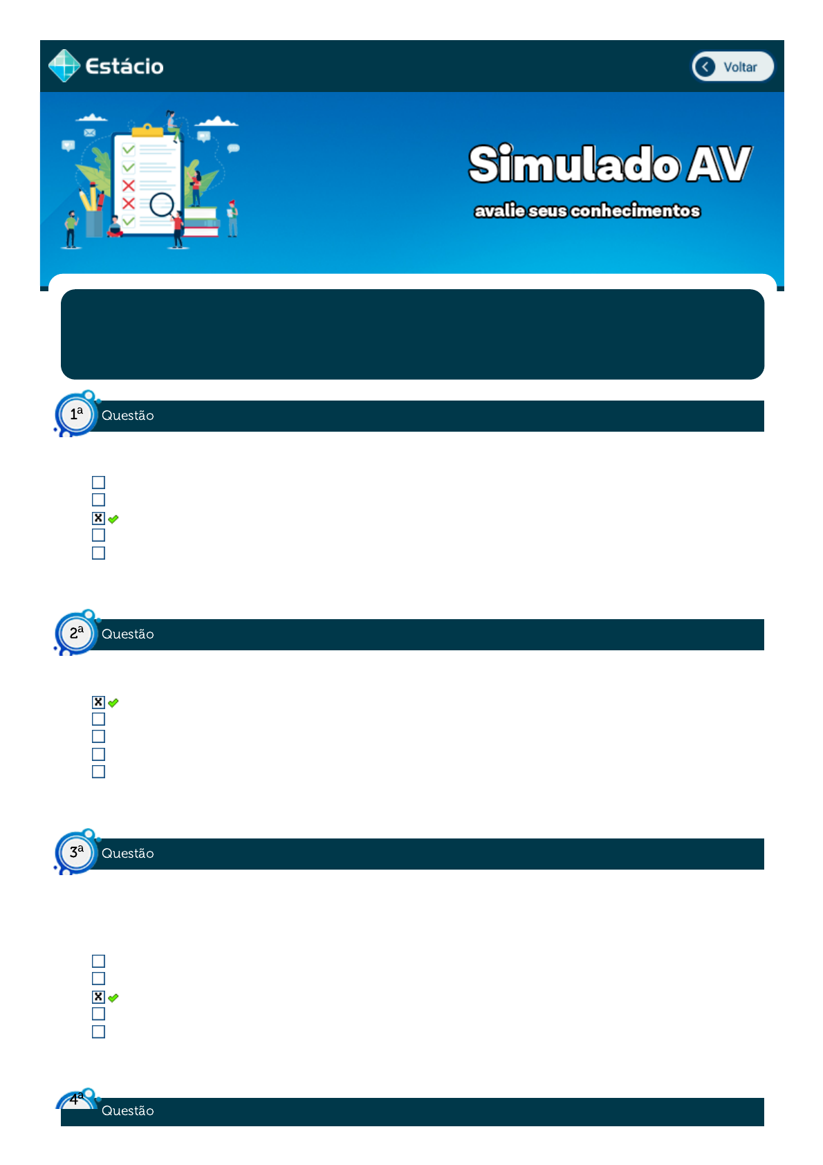 24/05/2021 Estácio: Alunos https://simulado.estacio.br/alunos/ 1/3 Disc.: ANÁLISE COMBINATÓRIA Aluno(a): ELISANGELA NUNES BATISTA 202009129919 Acertos: 10,0 de 10,0 24/05/2021 Acerto: 1,0 / 1,0 Quantos pares ordenados poderão ser montados com os elementos do conjunto A = {0, 1, 2, 3, 4, 5}? 64 15 36 24 42 Respondido em 24/05/2021 10:17:00 Acerto: 1,0 / 1,0 De quantas maneiras podemos grupar todas as letras da palavra ARARUAMA? 840 880 820 800 860 Respondido em 24/05/2021 10:02:07 Acerto: 1,0 / 1,0 Numa mesa circular com 10 lugares sentarão o presidente de uma empresa, seu diretor de finanças à sua direita, seu diretor de planejamento à sua esquerda, e os demais 7 diretores em qualquer dos lugares da mesa. De quantas maneiras distintas essa mesa poderá ser organizada para uma reunião com todos os seus lugares ocupados? 720 181440 5040 40320 362880 Respondido em 24/05/2021 10:04:01 Acerto: 1,0 / 1,0 Questão1 a Questão2 a Questão3 a Questão 4a https://simulado.estacio.br/alunos/inicio.asp javascript:voltar(); 24/05/2021 Estácio: Alunos https://simulado.estacio.br/alunos/ 2/3 Quantas palavras de duas letras distintas podem ser formadas com as vogais do nosso alfabeto? 10 30 25 15 20 Respondido em 24/05/2021 10:04:59 Acerto: 1,0 / 1,0 Numa urna encontramos 10 bolas brancas, 8 azuis e 5 verdes. De quantas maneiras podemos retirar 3 bolas de uma mesma cor? 400 67200 64 1771 186 Respondido em 24/05/2021 10:06:50 Acerto: 1,0 / 1,0 Analise as afirmativas abaixo: Encontramos afirmativas corretas somente em: I e III I, II e III II e III I e II I Respondido em 24/05/2021 10:07:51 Acerto: 1,0 / 1,0 Qual o número de termos no desenvolvimento da sétima potência de (x+a) 7 termos 4 termos 8 termos 5 termos 6 termos Respondido em 24/05/2021 10:09:38 Gabarito Questão5 a Questão6 a Questão7 a 24/05/2021 Estácio: Alunos https://simulado.estacio.br/alunos/ 3/3 Comentado Acerto: 1,0 / 1,0 O coeficiente de x6 do desenvolvimento de (2x - 3)8 será: 28 2268 1792 252 16128 Respondido em 24/05/2021 10:11:01 Acerto: 1,0 / 1,0 Seja (x + y + z)4. Considerando (4,0,0) uma solução. Marque a alternativa que indica o termo que ela fornece. x5 4x4 x4 x3 2x4 Respondido em 24/05/2021 10:15:37 Acerto: 1,0 / 1,0 Um fruteiro está vendendo maças, laranjas, peras e mangas. João pretende comprar duas frutas para se lanche. De quantas maneiras João poderá efetuar essa compra? 8 10 20 12 16 Respondido em 24/05/2021 10:13:40 Questão8 a Questão9 a Questão10 a javascript:abre_colabore('38403','226497242','4609093791');
