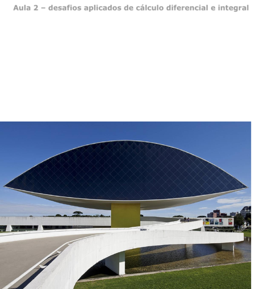 1 Aula 2 – desafios aplicados de cálculo diferencial e integral Museu Oscar Niemeyer e a integral definida O Museu Oscar Niemeyer, em Curitiba-PR, foi inaugurado em 2002 e inicialmente foi batizado de Museu Novo e desde sempre foi conhecido como Museu do Olho. Em 2003, com a mudança do governo estadual, foi rebatizado com o nome em homenagem ao famoso arquiteto que o projetou. Curiosamente, o mesmo arquiteto havia sido responsável pelo projeto do prédio que abrigava uma escola até ser remodelada e transformada em museu, que recebeu outro prédio independente da obra já existente, tão arrojado que surpreendeu a todos os arquitetos da época, tamanho o desafio e inovação que foram propostos e executados, conforme aparece na Fig. 1: Figura 1: Vista frontal do “olho”. Museu Oscar Niemeyer. "Era um prédio construído 40 anos atrás, suspenso em pilotis, com vãos de 30 e 60 metros e as fachadas cegas como a iluminação zenital adotada permitia. Era tão leve e atualizado que surgiu a ideia de transformá-lo num museu de arte. E isso explica o grande salão projetado, solto no ar, com 70m de comprimento e 30m de largura. As rampas de acesso indispensáveis, e o novo museu a exibir com sua forma diferente os milagres que o concreto armado oferece à arquitetura contemporânea." NIEMEYER, O. Minha Arquitetura, Rio de Janeiro: Revan, 2004. p. 290. 2 Como percebemos neste trecho escrito pelo próprio Oscar Niemeyer, as dimensões do que ele chama de “grande salão suspenso”, o “olho”, são 70 m de comprimento e 30 de altura. Quanto à parte curvilínea, que gera o formato de olho, a distância entre os pontos mais baixo e mais alto possui aproximadamente 18 m, sendo que a reta que separa as duas curvas parabólicas encontra-se a 14 m do ponto mais alto e a 4 m do ponto mais baixo. Essas dimensões foram utilizadas para fazer a representação, em escala apropriada, conforme aparece na Fig. 2. Os pontos marcados na curva que contorna o “olho” foram nomeados de A a N. Repare que percorrendo os pontos A, B, C, D, E, F, G e H, contornamos a parte côncava para baixo enquanto percorrendo os pontos H, I, J, K, L, M, N, A, percorremos o contorno da curva côncava para cima. 3 1ª QUESTÃO Escreva, na tabela abaixo, as coordenadas aproximadas desses dois conjuntos de pontos. Pontos da curva superior Coordenada x Coordenada y A B C D E F G H Pontos da curva inferior Coordenada x Coordenada y H I J K L M N A Pontos da curva superior: A(0; 0), B(10; 6,8), C(20; 11,4), D(30; 13,6), E(40; 13,6), F(50;1,4), G(60; 6,8), H(70; 0). Pontos da curva inferior: H(70; 0), I(60; –2), J(50; –3,1), K(40; –3,9), L(30; –3,9), M(20; –3,1), N(10; –2), A(0 ;0). 4 2ª QUESTÃO Utilize uma planilha eletrônica e realize um ajuste de curvas para obter as funções quadráticas, cujos gráficos representam os contornos superior e inferior do “olho”. Para isso, siga os seguintes passos: 1º passo: Utilizando os dados da tabela que foi preenchida na 1ª questão, construa o gráfico de dispersão. Cole a imagem do gráfico de dispersão nesse espaço. Figura 3: Gráfico de dispersão dos pontos amostrais do contorno do “olho” do Museu Oscar Niemeyer. 5 2º passo: Agora, usando outro recurso estudado na disciplina “Cálculo Diferencial”, insira a linha de tendência para obter as funções quadráticas que se ajustam aos conjuntos aos dois conjuntos de pontos anteriormente citados (parte superior e parte inferior da curva do “olho”), ou seja, construa o gráfico de dispersão dos pontos amostrais do contorno do “olho” do Museu Oscar Niemeyer, com ajuste de curvas. Cole a imagem do gráfico de dispersão, com ajuste de curvas, nesse espaço. Figura 4: Gráfico de dispersão dos pontos amostrais do contorno do “olho” do Museu Oscar Niemeyer, com ajuste de curvas. 6 3º passo: Escreva, as funções que modelam os contornos superior e inferior. Função do contorno superior: Função do contorno inferior: De acordo com os resultados de todo o processo anteriormente citado, temos, agora, as funções que modelam os contornos superior (y = –0,00114x2 + 0,795x) e inferior (y = 0,0032x2 – 0,2233x). 7 3ª QUESTÃO Calcule a integral definida dessas duas funções, no intervalo de 0 a 70, que nos dá uma ideia da área ocupada pela superfície do “olho” do Museu Oscar Niemeyer. Apresente, obrigatoriamente, todos os cálculos necessários. Assim, podemos dizer que a área superficial do “olho” do museu é: A = 1817,41 + |–181,22| = 1998,63 m2, aproximadamente (pois usando um ajuste de curvas para obtenção das funções, sendo que as ordenadas dos pontos foram determinadas por observação, o que está sujeito a erros de precisão). Área = ( ) 7070 3 2 2 2 0 0 0,00114 0,795 0,00114 0,795 130,34 1947,75 1817,41 m 3 2 x x x x dx − − + = + =− + = e ( ) 7070 3 2 2 2 0 0 0,0032 0,2233 0,0032 0,2233 365,87 547,09 181,22 m 3 2 x x x x dx − = − = − =− 8 4ª QUESTÃO Admita que você seja o engenheiro responsável por uma reforma na superfície do “olho” do Museu Oscar Niemeyer. Sendo assim, deverá escolher um tipo de vidro para ser utilizado nessa reforma. Faça uma pesquisa, na internet, sobre o tipo de vidro que irá utilizar e o correspondente preço por m². Em seguida, calcule o custo total, em reais, dessa reforma, com base na área calculada na 3ª questão. Tipo de vidro: Preço por m²: Custo total:
