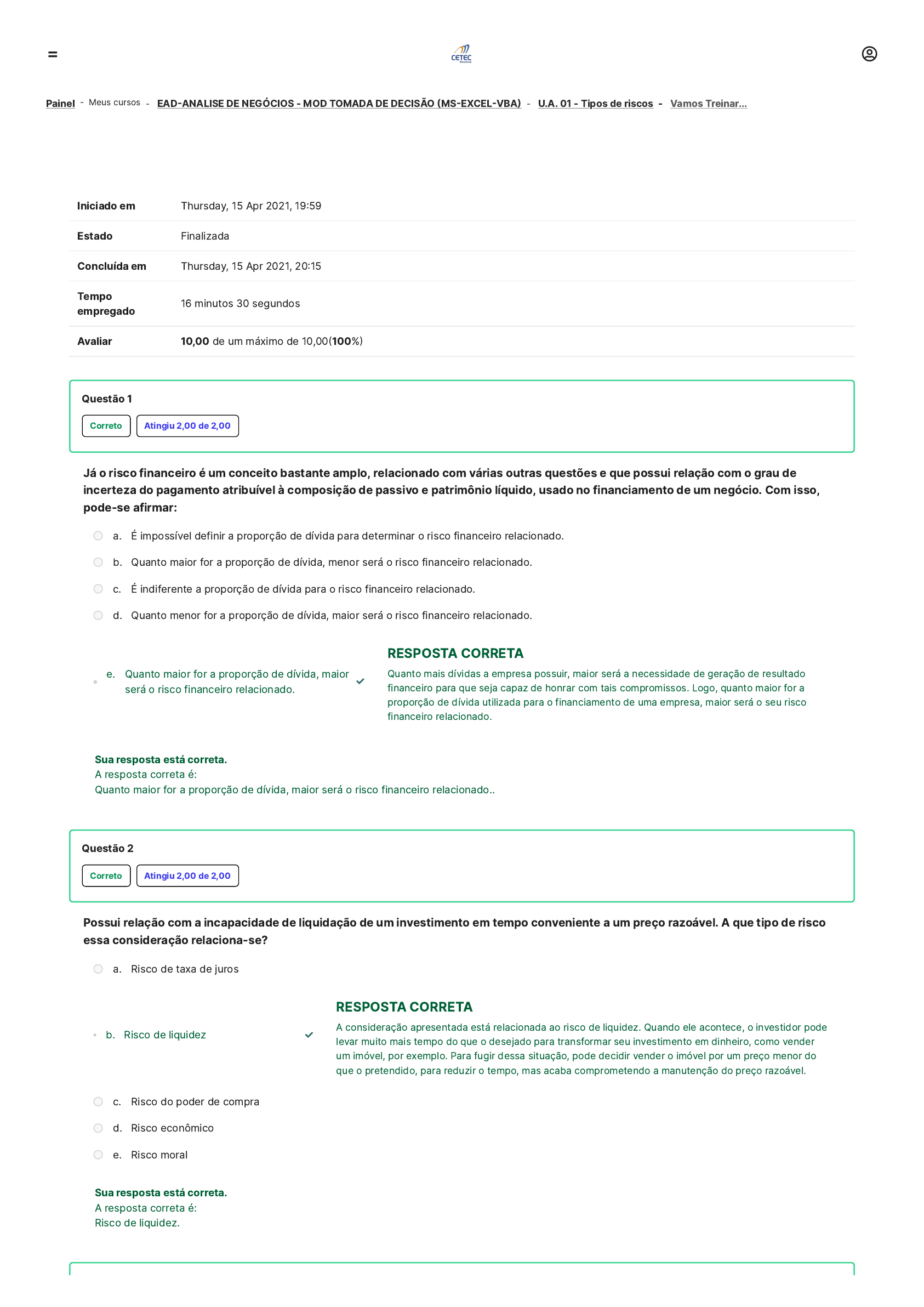 15/04/2021 Vamos Treinar...: Revisão da tentativa https://ava.etep.edu.br/mod/quiz/review.php?attempt=21572&cmid=24150 1/3 Iniciado em Thursday, 15 Apr 2021, 19�59 Estado Finalizada Concluída em Thursday, 15 Apr 2021, 20�15 Tempo empregado 16 minutos 30 segundos Avaliar 10,00 de um máximo de 10,00�100%� Questão 1 Correto Atingiu 2,00 de 2,00 Já o risco financeiro é um conceito bastante amplo, relacionado com várias outras questões e que possui relação com o grau de incerteza do pagamento atribuível à composição de passivo e patrimônio líquido, usado no financiamento de um negócio. Com isso, pode-se afirmar: a. É impossível definir a proporção de dívida para determinar o risco financeiro relacionado. b. Quanto maior for a proporção de dívida, menor será o risco financeiro relacionado. c. É indiferente a proporção de dívida para o risco financeiro relacionado. d. Quanto menor for a proporção de dívida, maior será o risco financeiro relacionado. e. Quanto maior for a proporção de dívida, maior será o risco financeiro relacionado. RESPOSTA CORRETA Quanto mais dívidas a empresa possuir, maior será a necessidade de geração de resultado financeiro para que seja capaz de honrar com tais compromissos. Logo, quanto maior for a proporção de dívida utilizada para o financiamento de uma empresa, maior será o seu risco financeiro relacionado. Sua resposta está correta. A resposta correta é: Quanto maior for a proporção de dívida, maior será o risco financeiro relacionado.. Questão 2 Correto Atingiu 2,00 de 2,00 Possui relação com a incapacidade de liquidação de um investimento em tempo conveniente a um preço razoável. A que tipo de risco essa consideração relaciona-se? a. Risco de taxa de juros b. Risco de liquidez RESPOSTA CORRETA A consideração apresentada está relacionada ao risco de liquidez. Quando ele acontece, o investidor pode levar muito mais tempo do que o desejado para transformar seu investimento em dinheiro, como vender um imóvel, por exemplo. Para fugir dessa situação, pode decidir vender o imóvel por um preço menor do que o pretendido, para reduzir o tempo, mas acaba comprometendo a manutenção do preço razoável. c. Risco do poder de compra d. Risco econômico e. Risco moral Sua resposta está correta. A resposta correta é: Risco de liquidez. - Meus cursos - - - Painel EAD�ANALISE DE NEGÓCIOS - MOD TOMADA DE DECISÃO �MS�EXCEL�VBA� U.A. 01 - Tipos de riscos Vamos Treinar... https://ava.etep.edu.br/my/ https://ava.etep.edu.br/course/view.php?id=46 https://ava.etep.edu.br/course/view.php?id=46§ion=2 https://ava.etep.edu.br/mod/quiz/view.php?id=24150 https://ava.etep.edu.br/ 15/04/2021 Vamos Treinar...: Revisão da tentativa https://ava.etep.edu.br/mod/quiz/review.php?attempt=21572&cmid=24150 2/3 Questão 3 Correto Atingiu 2,00 de 2,00 O ambiente de risco é bastante complexo, sendo composto por diversos tipos de riscos. Entre estes, está o risco do poder de compra, também conhecido como risco de _________, possuindo forte relação com a flutuação de preços, afinal, quanto ____________ estiverem os preços, __________ será o poder de compra. Qual das alternativas a seguir completa corretamente a frase? a. crédito; mais alto; menor b. inflação; mais baixo; menor c. inflação; mais altos; menor RESPOSTA CORRETA O risco do poder de compra é também conhecido como risco de inflação, uma vez que o poder de compra é diretamente afetado por ela. Em função disso, quando a inflação está em alta, os preços tendem a subir, e assim reduzir o poder de compra, ocasionando esse tipo de risco. d. inflação; mais altos; maior e. liquidez; mais altos; menor Sua resposta está correta. A resposta correta é: inflação; mais altos; menor. Questão 4 Correto Atingiu 2,00 de 2,00 As fontes de risco podem ser diversas e afetar um investimento de forma individual ou combinada. Entre as fontes, está o risco econômico, sobre o qual é verdadeiro afirmar: a. É totalmente independente da atividade principal do negócio. b. Afeta os sócios e investidores diretos, mas não impacta os detentores de dívida da empresa. c. Consiste no grau de incerteza associado aos rendimentos de um investimento e à sua capacidade em pagar os retornos prometidos ou esperados. RESPOSTA CORRETA O risco econômico, também conhecido como risco do negócio, está intimamente ligado à atividade principal do mesmo e à sua capacidade de gerar resultado antes da função financeira. Em outras palavras, consiste no grau de incerteza associado aos rendimentos de um investimento e sua capacidade em pagar os retornos prometidos ou esperados. Entre estes, estariam os juros, o valor principal e também os dividendos que seriam devidos aos investidores, afetando tanto os sócios quanto os detentores de dívida da empresa. d. Consiste na incerteza sobre a capacidade do negócio em pagar pelo capital de terceiros (principal e juros), mas não inclui o pagamento de dividendos. e. Ocorre depois da função financeira. Sua resposta está correta. A resposta correta é: Consiste no grau de incerteza associado aos rendimentos de um investimento e à sua capacidade em pagar os retornos prometidos ou esperados.. Questão 5 Correto Atingiu 2,00 de 2,00 Está relacionado ao não pagamento de uma obrigação na data acordada, por uma das partes integrantes de um contrato ou uma operação. Essa definição corresponde a qual dos riscos apresentados a seguir? a. Risco do poder de compra b. Risco moral c. Risco de crédito RESPOSTA CORRETA A possibilidade de, em um contrato, uma das partes não cumprir com obrigações assumidas refere-se ao risco de crédito. Nessa situação, uma das partes deixa de realizar os pagamentos devidos nas datas acordadas para o vencimento da respectiva obrigação, fazendo com a outra parte, que pode estar contando com o ingresso daquele recurso para cobertura de outros compromissos, fique exposta às consequência