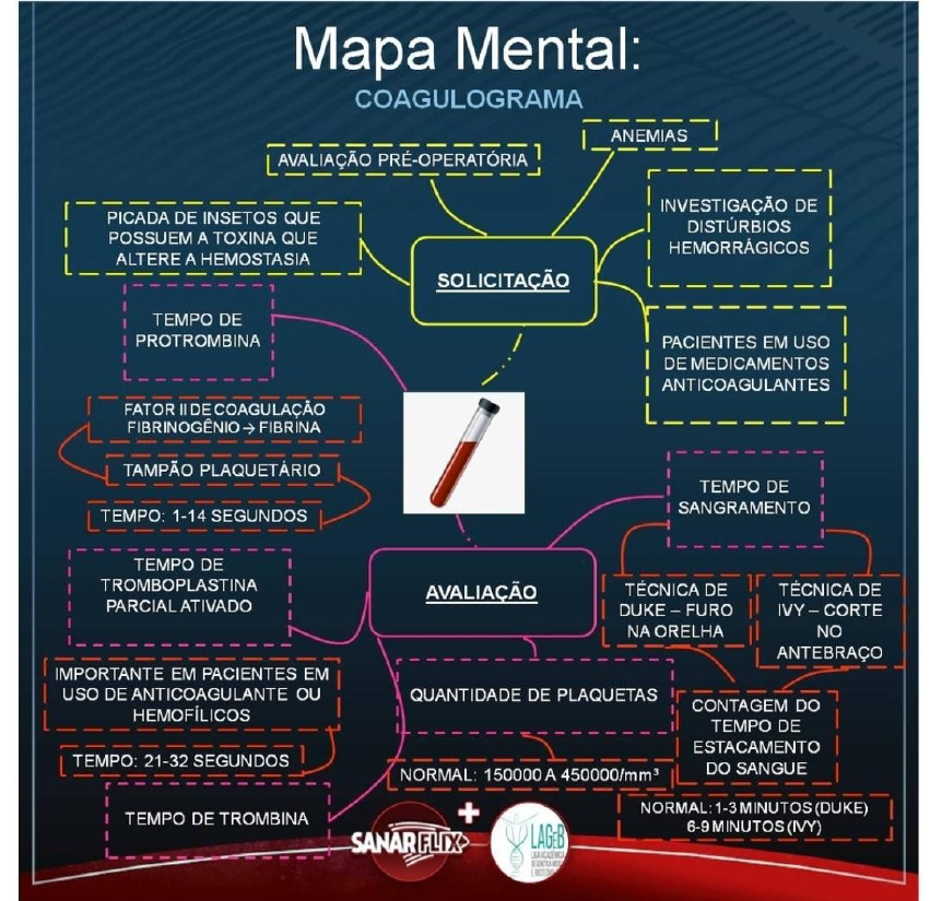 Anexo Mapa Mental Fonte: https://www.sanarmed.com/mapa-mental-de-coagulograma-ligasConforme pesquisas em sites voltados à enfermagem, notamos, de uma forma mais objetiva para entendermos. Através deste mapa mental, na enfermagem, podemos seguir uma linha de pensamentos para a realização deste exame laboratorial, pois conforme solicitado na clínica médica, existem várias possibilidades na coleta de exames, tanto para fins investigatórios para alguma patologia ou para o pré-cirurgico.