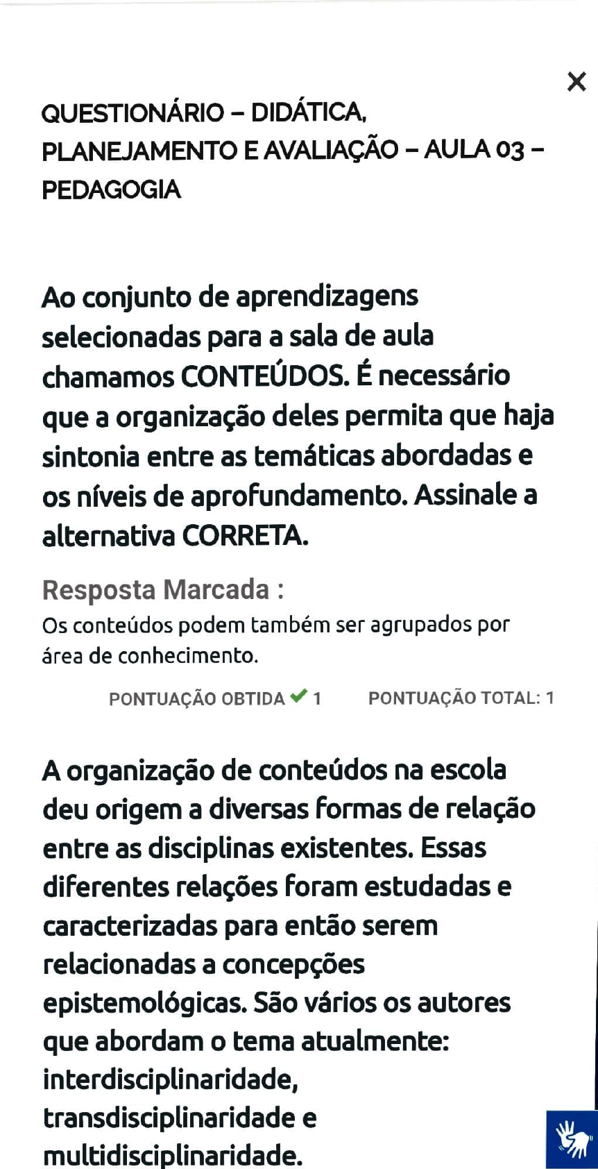 X QUESTIONÁRIO - DIDÁTICA, PLANEJAMENTO E AVALIAÇÃO -AULA 03- PEDAGOGIA Ao conjunto de aprendizagens selecionadas para a sala de aula chamamos CONTEÚDOs. É necessário que a organização deles permita que haja sintonia entre as temáticas abordadas e os níveis de aprofundamento. Assinalea alternativa CORRETA. Resposta Marcada Os conteúdos podem também ser agrupados por área de conhecimento. PONTUAÇÃO OBTIDA1 PONTUAÇÃO TOTAL:1 A organização de conteúdos na escola deu origem a diversas formas de relação entre as disciplinas existentes. Essas diferentes relações foram estudadas e caracterizadas para então serem relacionadas a concepçöes epistemológicas. São vários os autores que abordam o tema atualmente: interdisciplinaridade, transdisciplinaridade e multidisciplinaridade. Resposta Marcada: Optar por interdisciplinaridade, multidisciplinaridade e transdisciplinaridade não é tarefa somente da organização de conteúdos, cabe também à postura do professor. PONTUAÇÃO OBTIDA 1 PONTUAÇÃO TOTAL: 1 Segundo Zabala: "Os métodos globalizados nascem quando o aluno se transforma no protagonista do ensino; quer dizer, quando se produz um deslocamento do fio condutor da educação das matérias ou disciplinas como articuladoras do ensino parao aluno e, portanto, para suas capacidades, interesses e motivações." Essa definição parte do principio da relação do conteúdo no processo de aprendizagem. A partir da leitura da teoria apresentada por Zabala, assinale a alternativa CORRETA. Resposta Marcada Os métodos globais se caracterizam por projetos de centro de interesse. PONTUAÇÃO OBTIDA1 PONTUAÇÃO TOTAL: 1 E necessário que haja domínio do conteúdo para que a disciplina possa ser organizada com eficiência, uma vez que ela é vista como objeto de estudo. Esse papel cabe aos agentes pensadores da escola e principalmente aos professores, que devem propor constantes organizada com eficiência, uma vez que ela é vista como objeto de estudo. Esse papel cabe aos agentes pensadores da escola e principalmente aos professores, que devem propor constantes reorganização. Baseando-se na leitura indicada, marque a alternativa CORRETA: Resposta Marcada O método globalizado tem como finalidade a formação de cidadãos e cidad�s capazes de aprender a aprender. PONTUAÇÃO OBTIDA1 PONTUAÇÃO TOTAL: 1 O autor cita diversos métodos como globalizadores: os centros de interesse, estudo do meio, o método de projetos de Kilpatricke os projetos de trabalho globais. Assinale a afirmativa CORRETA de acordo com as informações apresentadas pelo texto. Resposta Marcada O método de projetos de Kilpatrick é centrado na experiência do aluno. PONTUAÇÃO OBTIDA 1 PONTUAÇÃO TOTAL: 1 Total 5/5 Resultado anterior do Questionário + Tentativas Iniciadas