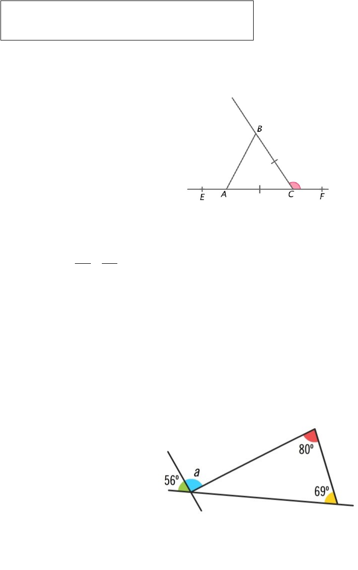 Nome da escola Aluno ___________________________ N.º ____ Turma _______ Data ________ Classificação: __________________________ Professor/a: ______________________________ Nível: ___________________ Enc. Educação: ______________________________ 1. Seleciona a resposta correta. Na figura está representado o triângulo isósceles . Sabe-se que . Se , a amplitude do ângulo é: (A) (B) (C) (D) 2. Observa a figura e completa a resposta à seguinte questão com o valor correto. Qual é o valor de a? A) O valor de a é _________________º. 3. Observa a figura e completa a resposta à seguinte questão, com o valor correto. Qual é, em graus, a amplitude do ângulo a? A) A amplitude do ângulo a é _________________º. 4. Seleciona a resposta correta. Na figura está representado o triângulo isósceles . Sabe-se que . Se , a amplitude do ângulo é: (A) . (B) . (C) . (D) . 5. Observa a figura e responde à questão. Qual é o valor de a, em graus? Nota: Indica apenas o valor numérico usando algarismos. 6. Observa a figura e responde à seguinte questão. Qual é o valor da soma das medidas das amplitudes dos ângulos a, b e c? Nota: Indica apenas o valor numérico usando algarismos. 7. Na figura está representado um triângulo a medida de dois dos seus ângulos internos. Qual é a amplitude, em graus, do ângulo externo com vértice em B? A) A amplitude do ângulo externo com vértice em B é _________________º. 8. Responde à questão. O João afirmou que todos os ângulos externos de um triângulo são sempre obtusos. O João tem razão? Nota: Indica a resposta usando apenas as palavras Sim ou Não. 9. Classifica as seguintes afirmações em verdadeiras ou falsas. (__) Não podem existir triângulos com dois ângulos retos. (__) Um triângulo com um ângulo agudo é sempre acutângulo. (__) Num triângulo apenas pode existir um ângulo obtuso. (__) Um triângulo pode ter um ângulo nulo. (__) O triângulo obtusângulo tem dois ângulos agudos. 10. Classifica as seguintes afirmações em verdadeiras ou falsas. Nota: Para responderes deves ter em conta as propriedades dos triângulos. (__) Qualquer triângulo tem, pelo menos, dois ângulos agudos. (__) Um triângulo isósceles pode ser retângulo. (__) Um triângulo equilátero pode ter um ângulo de amplitude 50º. (__) Um triângulo escaleno tem três ângulos com amplitudes diferentes. (__) Um triângulo retângulo pode ser equilátero. 11. Seleciona a resposta correta. As amplitudes dos ângulos internos de um triângulo são 45º, 85º e 50º. Como se classifica este triângulo quanto à amplitude dos seus ângulos? (A) Acutângulo. (B) Retângulo. (C) Escaleno. (D) Obtusângulo. 12. Seleciona a resposta correta. Num triângulo acutângulo, a amplitude de um dos ângulos é 55º. Quais podem ser as amplitudes dos outros ângulos? (A) 45º e 80º. (B) 35º e 80º. (C) 90º e 35º. (D) 25º e 100º. 13. Considera o triângulo que obedece às seguintes condições: Seleciona a opção que classifica corretamente o triângulo quanto aos lados e quanto aos ângulos. (A) Isósceles e acutângulo. (B) Isósceles e obtusângulo. (C) Escaleno e obtusângulo. (D) Escaleno e retângulo. 14. Observa a figura e responde à seguinte questão. Qual é, em graus, a amplitude do ângulo ? Nota: indica apenas o valor numérico usando algarismos. Grupo I 15. Seleciona a resposta correta. Sabendo que [ABCD] é um quadrado, como se classifica o triângulo [ABD] quanto ao comprimento dos seus lados? (A) Escaleno. (B) Equilátero. (C) Retângulo. (D) Isósceles. 16. Seleciona a resposta correta. Sabendo que [ABCD] é um quadrado, como se classifica o triângulo [ABD] quanto à amplitude dos seus ângulos internos? (A) Obtusângulo. (B) Retângulo. (C) Acutângulo. (D) Equilátero. 17. Seleciona a resposta correta. Como se classificam estes triângulos quanto ao comprimento dos seus lados? (A) Equiláteros. (B) Isósceles. (C) Obtusângulos. (D) Escalenos. 18. Seleciona a resposta correta. Como se classifica o triângulo da figura quantos aos lados e quanto aos ângulos? (A) Escaleno e retângulo. (B) Equilátero e obtusângulo (C) Escaleno e acutângulo. (D) Equilátero e retângulo. 19. Considera o triângulo da figura e completa as frases com as opções corretas. A amplitude do ângulo x é _________________ (10º | 100º | 35º | 130º) e a amplitude do ângulo y é _________________ (10º | 100º | 35º | 130º). O triângulo é _________________ (escaleno | acutângulo | equilátero | isósceles | retângulo | obtusângulo) quanto aos ângulos e _________________ (escaleno | equilátero | isósceles | acutângulo | retângulo | obtusângulo) quanto aos lados. Opções: 20. Seleciona a resposta correta. Como se classifica o triângulo da figura quanto aos lados e quanto aos ângulos? (A) Escaleno e acutângulo. (B) Isósceles e acutângulo. (C) Isósceles e obtusângulo. (D) Escaleno e obtusângulo. 21. Considera o triângulo representado na imagem e completa as frases com as opções corretas. A amplitude do ângulo x é _________________ (165º | 75º | 15º | 105º) e a amplitude do ângulo y é _________________ (165º | 75º | 15º | 105º). O triângulo é _________________ (acutângulo | obtusângulo | retângulo | escaleno | isósceles | equilátero) quanto aos ângulos e _________________ (escaleno | retângulo | acutângulo | isósceles | obtusângulo | equilátero) quanto aos lados. Opções: 22. Seleciona a resposta correta. Como se classifica o triângulo representado na figura quanto à amplitude dos seus ângulos internos? (A) Obtusângulo. (B) Retângulo. (C) Escaleno. (D) Acutângulo. 23. Seleciona a resposta correta. Como se classifica o triângulo da figura quanto aos lados e quanto aos ângulos? (A) Escaleno e retângulo. (B) Equilátero e acutângulo. (C) Isósceles e retângulo. (D) Escaleno e acutângulo. 24. Seleciona a resposta correta. Como se classificam estes triângulos quanto ao comprimento dos seus lados? (A) Escale