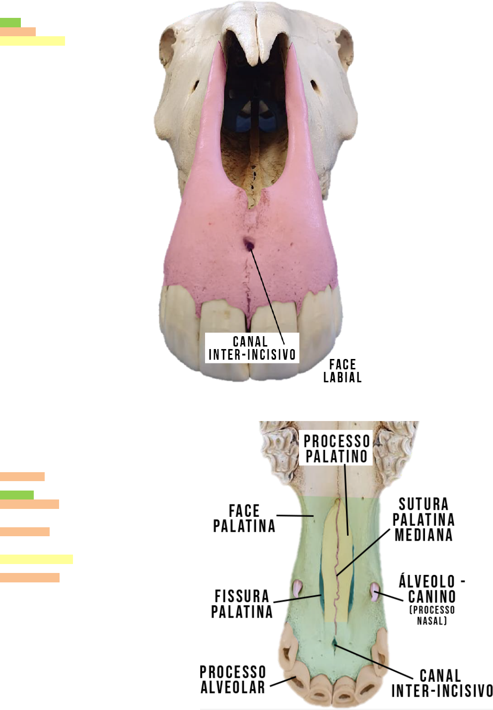 -sustenta dentes incisivos superiores; Corpo Face labial Canal inter-incisivo Face palatina Processos Processo alveolar -alvéolos para dentes incisivos superiores; Processo nasal -alvéolo para canino; Incisura naso-incisiva Processo palatino Fissura palatina INCISIVO/PRÉ-MAXILAR sábado, 2 de janeiro de 2021 18:28 Ruminantes -não possuem processo alveolar; Em vez de canal inter-incisivo;➢ -incisura inter-incisiva; -larga fissura palatina; Canino -sem canal/incisura inter-incisiva; Suínos -incisura inter-incisiva; ➢ Em vez de canal inter-incisivo; -larga fissura palatina;
