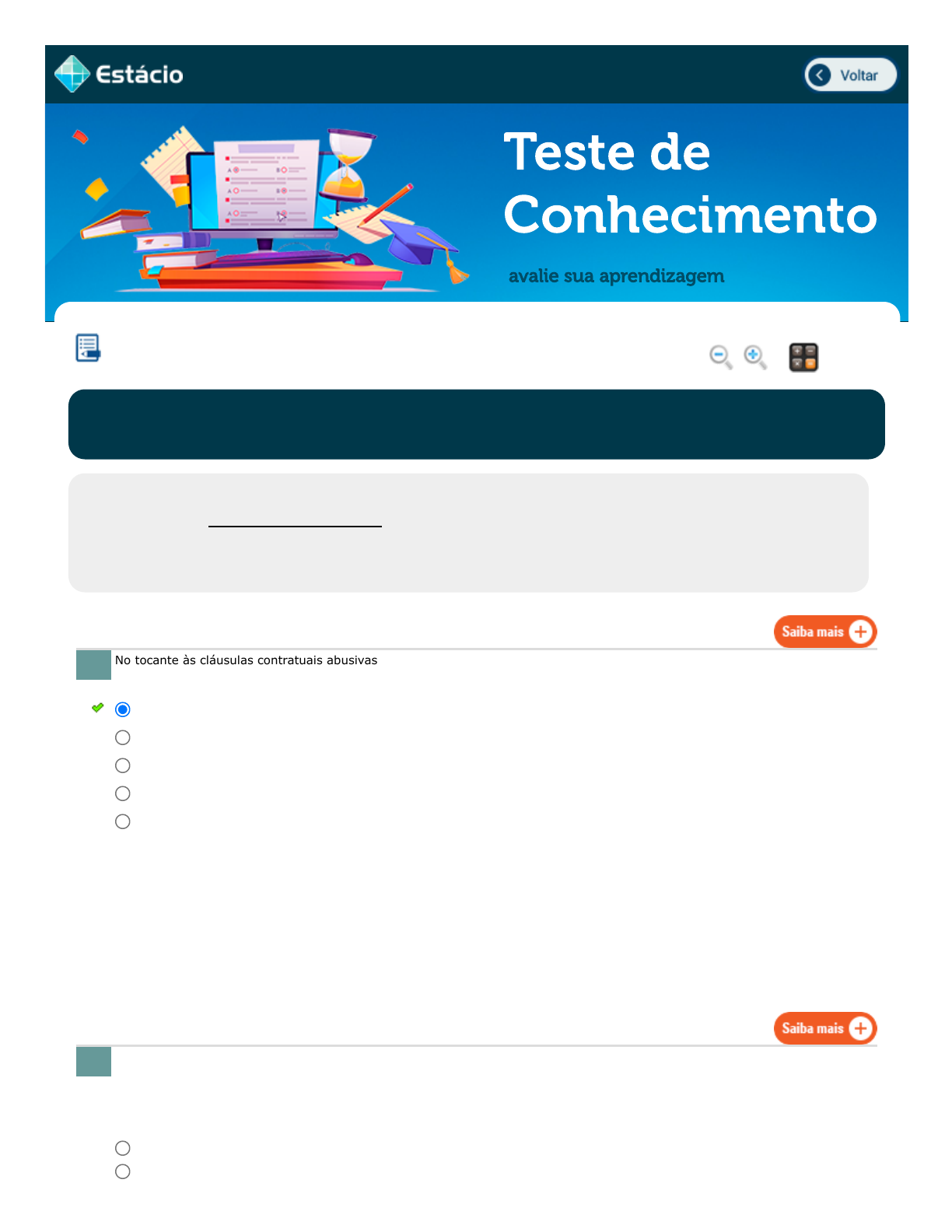 25/05/2021 Estácio: Alunos https://simulado.estacio.br/alunos/?p0=211551750&user_cod=2426417&matr_integracao=201907074449 1/4 Teste de Conhecimento avalie sua aprendizagem No tocante às cláusulas contratuais abusivas no âmbito do sistema jurídico de proteção ao consumidor, é correto afirmar que: (JUS BRASIL- SIMULADO AOB) O art. 8º do CDC dispõe que ¿os produtos e serviços colocados no mercado de consumo não acarretarão riscos à saúde ou segurança dos consumidores, exceto os considerados normais e previsíveis em decorrência de sua natureza e fruição, obrigando-se os fornecedores, em qualquer hipótese, a dar as informações necessárias e adequadas a seu respeito. Nesse sentido, assinale dentre as opções abaixo aquela que contém produtos que, por sua natureza, apresentam riscos inerentes à saúde ou segurança do consumidor: FUNDAMENTOS DE DIREITO DO CONSUMIDOR Lupa Calc. GST1792_A6_201907074449_V1 Aluno: SHIRLANE MEDEIROS LEITE Matr.: 201907074449 Disc.: FUND. DIR. CONSUM. 2021.1 EAD (GT) / EX Prezado (a) Aluno(a), Você fará agora seu TESTE DE CONHECIMENTO! Lembre-se que este exercício é opcional, mas não valerá ponto para sua avaliação. O mesmo será composto de questões de múltipla escolha. Após responde cada questão, você terá acesso ao gabarito comentado e/ou à explicação da mesma. Aproveite para se familiarizar com este modelo de questões que será usado na sua AV e AVS. 1. a nulidade de uma cláusula contratual abusiva não invalida o contrato, exceto quando de sua ausência, apesar dos esforços de integração, decorrer ônus excessivo a qualquer das partes. o rol do art. 51 do CDC é taxativo. o Ministério Público pode ajuizar ação civil coletiva para buscar a nulidade de cláusula contratual abusiva inserida em pacto de adesão de locação utilizado por determinada administradora de imóveis residenciais. o rol do art. 51 do CDC não é taxativo. as cláusulas contratuais abusivas que implicarem limitação de direito do consumidor caso redigidas com destaque, permitindo sua imediata e fácil compreensão, passam a ser válidas. Explicação: a nulidade de uma cláusula contratual abusiva não invalida o contrato, exceto quando de sua ausência, apesar dos esforços de integração, decorrer ônus excessivo a qualquer das partes. 2. Produto de limpeza que, ao ser usado, causa queimaduras no consumidor Brinquedo com elevado potencial de sufocação da criança que o utilize javascript:voltar(); javascript:voltar(); javascript:duvidas('234564','7413','1','3734470','1'); javascript:duvidas('692417','7413','2','3734470','2'); javascript:diminui(); javascript:aumenta(); javascript:calculadora_on(); 25/05/2021 Estácio: Alunos https://simulado.estacio.br/alunos/?p0=211551750&user_cod=2426417&matr_integracao=201907074449 2/4 Sobre a oferta marque a alternativa correta. A relação de consumo tem sempre enquadrado em pólos distintos dois sujeitos: (JUSBRASIL - adaptada) São direitos básicos do consumidor, EXCETO: Garrafa de refrigerante que não informa sobre o risco de explosão ao ser aberta. Todas alternativas corretas. Fogos de artifício, remédios, faca de cozinha, agrotóxicos e bebidas alcoólicas. Explicação: Fogos de artifício, remédios, faca de cozinha, agrotóxicos e bebidas alcoólicas. 3. Caso o fornecedor se recuse a cumprir a oferta, o consumidor poderá única e exclusivamente rescindir o contrato, com direito à restituição de quantia eventualmente antecipada. O fornecedor não é responsável pelas informações erradas passadas pelos seus empregados. O fornecedor é solidariamente responsável pelos atos de seus empregados, prepostos, agentes ou representantes. A oferta, no direito do consumidor, é direcionada a pessoas determinadas. A oferta, nas relações de consumo, vincula apenas os contratantes. Explicação: O fornecedor é solidariamente responsável pelos atos de seus empregados, prepostos, agentes ou representantes. 4. O empresário e a pessoa física. O empresário e o consumidor. O consumidor e a pessoa física. Duas pessoas jurídicas. O fornecedor e o consumidor. Explicação: O fornecedor e o consumidor. 5. A certeza que o consumidor sempre terá razão nas suas demandas. A informação adequada e clara sobre os diferentes produtos e serviços, com especificação correta de quantidade, características, composição, qualidade e preço, bem como sobre os riscos que apresentem. A manutenção de assistência jurídica, integral e gratuita para o consumidor carente. A proteção da vida, saúde e segurança contra os riscos provocados por práticas no fornecimento de produtos e serviços considerados perigosos ou nocivos. javascript:duvidas('1165881','7413','3','3734470','3'); javascript:duvidas('164688','7413','4','3734470','4'); javascript:duvidas('1118074','7413','5','3734470','5'); 25/05/2021 Estácio: Alunos https://simulado.estacio.br/alunos/?p0=211551750&user_cod=2426417&matr_integracao=201907074449 3/4 Alguns autores renomados conceituam consumidor com base em diferentes pontos de vista. Assim, também pode ser conceituado consumidor, EXCETO: Em relação ao sujeito de direitos consumidor, marque a alternativa correta dentre as abaixo: As partes na relação de consumo devem atuar com boa-fé, isto é, com lealdade, sinceridade e transparência. Essa definição se refere ao princípio da: A facilitação da defesa de seus direitos, inclusive com a inversão do ônus da prova, a seu favor, no processo civil, quando, a critério do juiz, for verossímil a alegação ou quando for ele hipossuficiente, segundo as regras ordinárias de experiências. Explicação: A manutenção de assistência jurídica, integral e gratuita para o consumidor carente. 6. Todo aquele que, para revender, adquire ou utiliza produtos, serviços ou quaisquer outros bens ou informação colocados à sua disposição por comerciantes ou por qualquer outra pessoa natural ou jurídica, no curso de sua atividade ou 