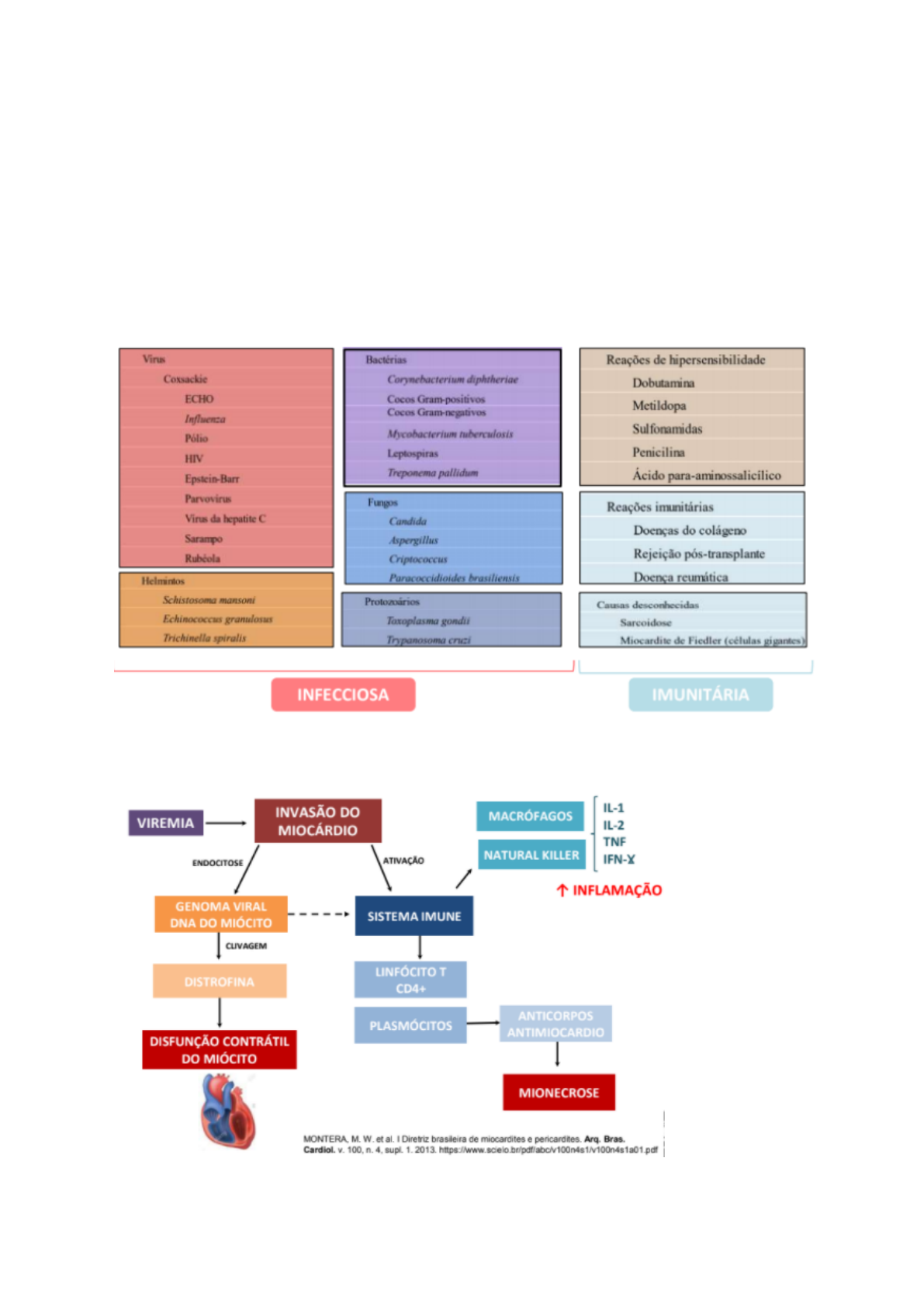 Miocardit� → Processo inflamatório cardíaco, multifatorial, que atua como causa de lesão a cardiomiócitos (lesão inflamatória a cardiomiócitos com necrose e/ou degeneração dos miócitos adjacentes), com fases evolutivas de atividade e remissão; → Fatores etiológicos: → Fisiopatologia: → Fase aguda (1°- 4° dia): - Alta viremia; - Invasão dos miócitos pelo vírus; - Ação direta e ativação dos sistema imune; → Fase subaguda (4°- 14° dia): - Desenvolvimento da resposta imune; - Agressão indireta ao miócito; - Lise e apoptose - disfunção contrátil; → Fase crônica (14°- 90°): - Cardiomiopatia dilatada com disfunção progressiva; - Cardiomiopatia dilatada estável (fibrose); - Recuperação total, sem sequelas ou com disfunção ventricular leve; → Características clínicas: - Assintomático → Insuficiência cardíaca de início súbito febre, dor, arritmias de início súbito → Critérios diagnósticos: - Anatomopatológico = Biópsia endomiocárdica (critério Dallas); - Imunohistoquímica = Caracterização e quantificação; - PCR = Agente etiológico; - Exames de imagem = Ressonância e tomo; - Ecocardiograma; → Base para o diagnóstico: - Biópsia endomiocárdica; - Critério Dallas: padrão do infiltrado inflamatório depende da etiologia; - Linfo-histiocitárias (mononucleares); Neutrofílicas; Granulomatosa; Eosinofílicas; Células gigantes; - Não contempla: formas brandas; estado pró-inflamatório; aumento de citocinas e antígenos de histocompatibilidade; ausência de infiltrado inflamatório; ● PCR positividade para agentes infecciosos e ausência de infiltrado inflamatório; → Diagnóstico: definitivo de miocardite - “gold standard”; Critérios de Dallas (1986): Miocardite activa: infiltrado inflamatório + necrose miócitos; Miocardite borderline: infiltrado inflamatório sem necrose; Infiltrado (linfocítico, eosinófilo, granulomatoso, cél. gigantes); → Aspectos morfológicos: - Macroscópico: Pode parecer normal ou dilatado; Pode haver algum grau de hipertrofia, dependendo da duração da doença; Estágios avançados: flacidez muscular e com frequência mosqueado por focos pálidos ou diminutas lesões hemorrágicas; Trombos murais podem estar associados; - Microscópicos: Edema; Infiltrado inflamatório intersticial (infiltrado difuso, mononuclear, basicamente linfocitário); Necrose focal dos miócitos; Fibrose - dependendo do tempo da inflamação; → Miocardite Chagásica crônica - Contagioso: o mosquito barbeiro quando pousa na pele, deixa suas fezes, e quando o ser humano coça, elas entram na corrente sanguínea, se alojando no coração; - Fases da doença: Aguda - dura cerca de oito semanas. Na maioria das vezes não apresenta sintomas. Pode ser letal, especialmente em crianças menores de 3 anos. Sintomas: mal-estar, febre e dores no corpo; Indeterminada - dura por toda a vida. A pessoa é contaminada, mas a doença não tem manifestação clínica. No Brasil, 60% dos chagásicos encontram-se nesta fase. Sintomas: não existem; Crônica - cerca de 80% do total de infectados apresentam problemas cardíacos. A doença também afeta o encéfalo e o intestino grosso. Sintomas: dilatação do coração, enfraquecimento do músculo cardíaco (cardiopatia chagásica), arritmia, bloqueio cardiaco, dilatação do esofago e do intestino, constipação, dificuldade de engolir alimentos sólidos; Dilatação global de todas as câmaras tomando contorno arredondado (moringa); Afinamento do miocárdio na ponta do VE, acompanhado por fibrose; Hipocontratilidade do miocárdio gera lentificação de fluxo e favorece trombose; → Miocardite linfo-histiocitária: Microscopia: destruição direta de grande número de cardiomiócitos pelo T. cruzi → ICC; Forma aguda: presença da forma amastigota do parasita no interior do cardiomiócito, com infiltrado de neutrófilos; Forma crônica: linfócitos e eosinófilos, fibrose, SEM o parasita; → Miocardite necrotizante eosinofílica - Reação a fármacos: Penicilina; Sulfonamidas; Dobutamina; - Quadro histológico: Edema e infiltrado inflamatório misto: eosinófilos, macrófagos e linfócitos; → Miocardite neutrofílica/Miocardite granulomatosa → Miocardite células gigantes: - Sarcoidose ou idiopáticas; - Microscopia: Miocardite de fiedler; Granulomas epitelióides sem necrose; Células gigantes multinucleadas; - Infiltrado inflamatório: Macrófagos, linfócitos e plasmócitos; Extensa área de necrose; Revisão: → Viral - Aguda: células NK e macrófagos; - Subaguda: linfócitos; - Crônica: fibrose; → Bacteriana - Macrófagos e células NK; → Farmácos - Infiltrado eosinofílico; → Células gigantes - Forma autoimune: infiltrado de células gigantes, multinucleadas, células T, eosinófilos e histiócitos;