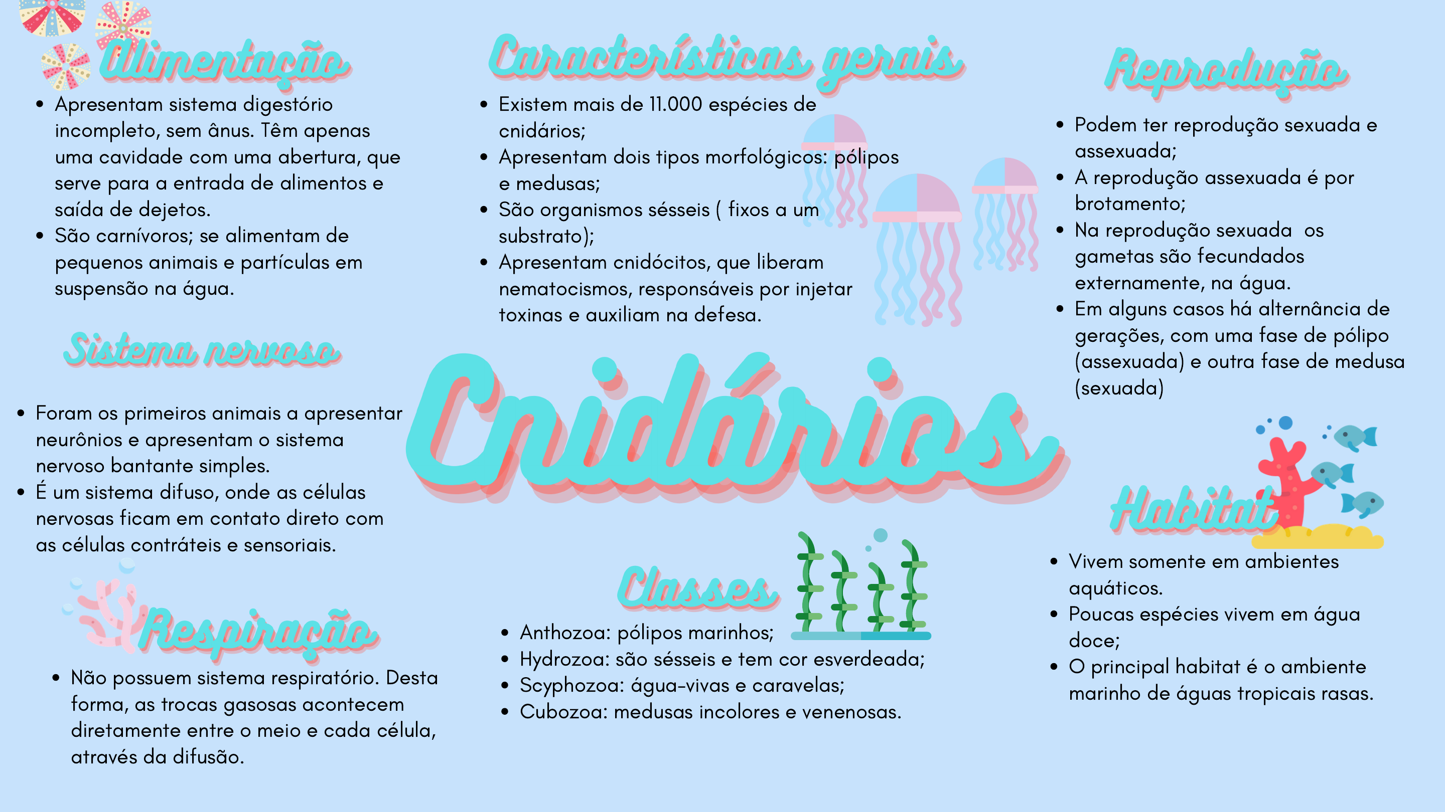 Podem ter reprodução sexuada e assexuada; A reprodução assexuada é por brotamento; Na reprodução sexuada os gametas são fecundados externamente, na água. Em alguns casos há alternância de gerações, com uma fase de pólipo (assexuada) e outra fase de medusa (sexuada) Existem mais de 11.000 espécies de cnidários; Apresentam dois tipos morfológicos: pólipos e medusas; São organismos sésseis ( fixos a um substrato); Apresentam cnidócitos, que liberam nematocismos, responsáveis por injetar toxinas e auxiliam na defesa. Apresentam sistema digestório incompleto, sem ânus. Têm apenas uma cavidade com uma abertura, que serve para a entrada de alimentos e saída de dejetos. São carnívoros; se alimentam de pequenos animais e partículas em suspensão na água. Foram os primeiros animais a apresentar neurônios e apresentam o sistema nervoso bantante simples. É um sistema difuso, onde as células nervosas ficam em contato direto com as células contráteis e sensoriais. Anthozoa: pólipos marinhos; Hydrozoa: são sésseis e tem cor esverdeada; Scyphozoa: água-vivas e caravelas; Cubozoa: medusas incolores e venenosas. Não possuem sistema respiratório. Desta forma, as trocas gasosas acontecem diretamente entre o meio e cada célula, através da difusão. Vivem somente em ambientes aquáticos. Poucas espécies vivem em água doce; O principal habitat é o ambiente marinho de águas tropicais rasas.