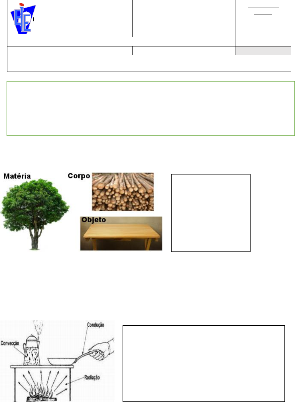 1. Matéria é tudo aquilo que possui massa e ocupa um lugar no espaço (A). Um corpo é uma porção de matéria definida, por vezes associado ao conceito de matéria-prima (B) porque auxiliam na fabricação de objetos (C). Observe a imagens e associe as colunas. Coluna II (___) Composta por partículas providas de massa e volume. (___) Transformações físicas e químicas em meio industrial para modificação de um corpo. (___) Uma porção de matéria arranjada em moléculas de uma estrutura física. 2. A imagem abaixo diz respeito a propagação do calor, do meio de maior temperatura par ao meio de menor temperatura. Com base nisso podemos afirmar que, marque (V) para verdadeiro e (F) para falso. 3. As transformações físicas alteram a propriedade das substancias, mas não resultam na formação de novas moléculas, já as transformações químicas como mudança de cor, liberação de um gás, formação de um sólido, variação da temperatura, aparecimento de um cheiro característico, aparecimento de chama e INSTITUTO ESTADUAL DE EDUCAÇÃO Disciplina: CIÊNCIAS Marque sua turma: ( ) 906 ( ) 914 ( ) 915 ( ) 916 Professor: Rafael B. Alcântara Aluno (a): Data de envio: Data de entrega: 9CIEMI01 Tipo de atividade: ( X ) Material de Estudo ( X ) Tarefas/exercícios ( ) Avaliação ( )Recuperação Esta atividade deve ser devolvida? ( ) SIM ( x ) NÃO Coluna I (A) Matéria. (B) Corpo. (C) Objeto. (___) Na condução corre o contato direto entre dois corpos para que o calor seja propagado. (___) Na radiação o calor se propaga por ondas, ou seja, não possuí partículas de condutoras. (___) Na convecção o calor se propaga por meio de um fluido (água ou ar). (___) O calor só se propaga entre os materiais metálicos Olá, me chamo Rafael sou seu professor de Ciências neste ano letivo de 2021. Neste material exercitaremos as seguintes habilidades: Investigar as mudanças de estado físico da matéria e explicar essas transformações com base no modelo de constituição submicroscópica; comparar quantidades de reagentes e produtos envolvidos em transformações químicas, estabelecendo a proporção entre as suas massas; identificar modelos que descrevem a estrutura da matéria (constituição do átomo e composição de moléculas simples) e reconhecer sua evolução histórica. Deste modo, solicito que leiam com bastante atenção, interpretem as imagens e textos e exercitem a capacidade de elaborar respostas. desaparecimento das substancias iniciais. O observe as imagens e esquemas abaixo e marque se é uma transformação química ou uma transformação física. 4. A matéria é feita por átomos e os átomos são feitos de partículas. Na questão dois vimos sobre como o calor se propaga e na questão três percebemos que o calor influencia na movimentação das partículas da matéria e consecutivamente influencia na mudança do seu estado físico. Quando o calor entra no sistema fechado temos uma reação chamada endotérmica (endo= dentro) e quando o calor esta sendo liberado por uma reação química, chamamos esta reação de exotérmica (exo = fora). Observe as imagens abaixo e responda: no estado físico gasoso, o sistema está: (___) Liberando energia. (___) Absorvendo energia. (___) Transformação Física (___) Transformação Química (___) Transformação Física (___) Transformação Química (___) Transformação Física (___) Transformação Química 5. Na natureza nada se cria, nada se perde, tudo se transforma. Esta frase representa o enunciado geral da Lei da Conservação das Massas postulada por Lavoisier e Proust. Estes cientistas comprovaram experimentalmente que a massa das substancias envolvidas antes de uma reação química (reagentes) era a mesma das substâncias após uma reação química (produtos). Observe as imagens abaixo: Isto quer dizer que em uma reação química tal como: 6. As características cientificas e tecnológicas de cada época influenciam nas concepções humanas sobre a REALIDADE que nos cerca. O modelo atômico por exemplo é um reflexo de como o conhecimento cientifico se acumula e se transforma ao longo do tempo. (___) A massa do CH4 é igual a massa do CO2. (___) a massa do oxigênio é igual nos dois lados da equação. Dentre as principais características de cada modelo atômico podemos destacar: A compreensão sobre os modelos atômicos levou a ciência a reconhecer e descrever como ocorrem a formação dos materiais e substancias. Na verdade, a maioria dos elementos químicos (conjunto de átomos com o mesmo número de prótons [partícula de carga positiva do núcleo atômico]) formam ligações químicas para dar origem a substâncias simples e compostas. De modo geral, substâncias simples são aquelas formadas por um único elemento químico e substâncias compostas dois ou mais. Para facilitar a compreensão sobre as ligações químicas, os elementos químicos foram classificados de acordo com suas propriedades físicas e químicas em: hidrogênio (atípico), ametais, gases nobres e metais. Veja a figura abaixo: A tabela periódica dos elementos químicos esta organizada em períodos (vertical) e famílias (horizontal). Os períodos correspondem as camadas orbitais detectadas pelo modelo atômico de Bohr. Enquanto as famílias se referem as características em comum entre estes elementos químicos. E por fim, os elementos químicos estão organizando por ordem crescente de acordo com sua identidade de origem (o número de prótons). Normalmente os elementos químicos se combinam através da camada de valência (camada mais distante do núcleo atômico). Por exemplo: Na distribuição eletrônica abaixo temos uma boa noção sobre o que são elementos eletropositivos e eletronegativos. Elementos químicos com cargas elétricas são chamados de íons, os íons podem ser classificados em cátions (perde elétrons) ou ânions (ganha elétrons). Isto ocorre pois, segundo a regra do Octeto os elementos químicos (