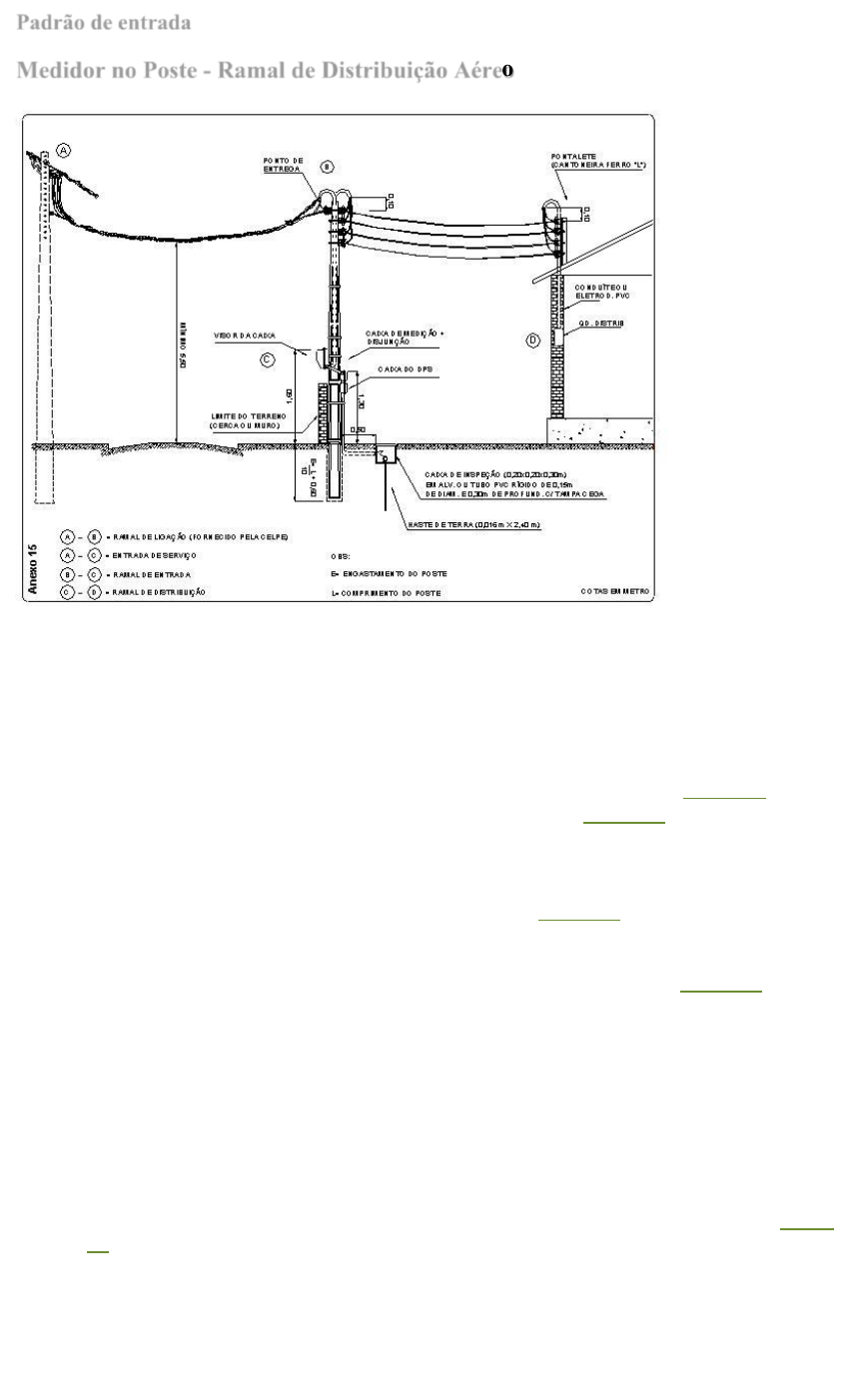 Padrão de entrada Medidor no Poste - Ramal de Distribuição Aéreo • Um parafuso olhal galvanizado de 12 x 200mm ou uma armação vertical de um estribo, em ferro galvanizado, com isolador roldana de 76x79mm e um parafuso de máquina de 12 x 200mm com porcas e arruelas de furo Ø14mm, para fixação do ponto de entrega, e quatro armações de dois estribos com oito isoladores roldana de 76 x 79mm e sete parafusos de máquina, sendo três de 12 x 200mm e quatro de 12 x 50mm com porcas e arruelas de furo Ø14mm, para fixação do ramal de distribuição. • Um poste particular duplo T, T ou circular, dimensionado conforme tabela 03. • Três bengalas para eletroduto, dimensionado conforme tabela 03. • Curva 90º (*). • Luvas para eletroduto (*). • Buchas e arruelas de alumínio para eletroduto (*). • Eletroduto de PVC rígido, dimensionado conforme tabela 03. • Uma cantoneira de ferro galvanizado de 38 x 38 x 2000mm com dois parafusos de 12 x 150mm para fixação na parede (**). • Um disjuntor termomagnético tripolar (3f), dimensionado conforme tabela 03. • Uma caixa plástica para medidor trifásico padrão CELPE, com buchas plásticas e parafusos para instalação no poste. • Uma caixa plástica para disjuntor trifásico padrão CELPE, com buchas plásticas e parafusos para instalação no poste. • Uma haste de aterramento de dimensões mínimas 16 x 2400mm, com conector apropriado. • Conduite flexível ou eletroduto de PVC, para interligação entre caixa de medidor, caixa de disjuntor e caixas de inspeção (*). • Três cintas com grampos de fixação, ou braçadeiras para fixar o eletroduto no poste. • Condutores com isolamento termoplástico de 750V, dimensionados conforme tabela 03 (*). • Quadro de distribuição. • Uma caixa para DPS trifásico (opcional). • Nota: • A quantidade depende do seu projeto. • ** Esse item se torna desnecessário caso o ramal de distribuição entre direto na fachada. Obs. A profundidade do poste será de 10% da sua altura + 0,60m. https://servicos.celpe.com.br/residencial-rural/PublishingImages/padrao%20de%20entrada/tabela03.jpg https://servicos.celpe.com.br/residencial-rural/PublishingImages/padrao%20de%20entrada/tabela03.jpg https://servicos.celpe.com.br/residencial-rural/PublishingImages/padrao%20de%20entrada/tabela03.jpg https://servicos.celpe.com.br/residencial-rural/PublishingImages/padrao%20de%20entrada/tabela03.jpg https://servicos.celpe.com.br/residencial-rural/PublishingImages/padrao%20de%20entrada/tabela03.jpg https://servicos.celpe.com.br/residencial-rural/PublishingImages/padrao%20de%20entrada/tabela03.jpg