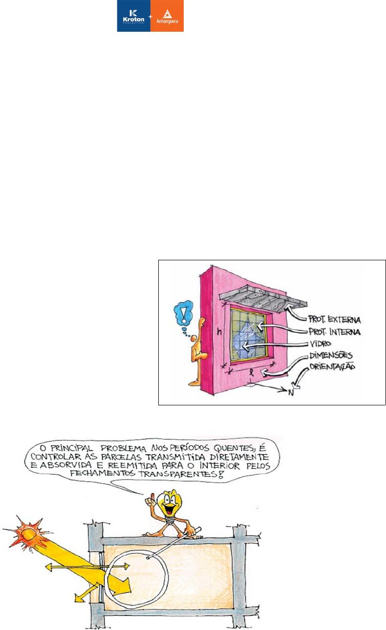 Anhanguera Educacional CURSO: ARQUITETURA E URBANISMO Disciplina: CONFORTO AMBIENTAL TÉRMICO Profª: Ana Lúcia de Góes IV - VARIÁVEIS ARQUITETÔNICAS: PROPRIEDADES TÉRMICAS DOS ELEMENTOS CONSTRUÍDOS 4.6 - FECHAMENTOS TRANSPARENTES As principais trocas térmicas em uma edificação acontecem geralmente nestes fechamentos, que compreendem janelas, clarabóias e qualquer outro elemento transparente na arquitetura. As trocas por condução e convecção, ocorrem de modo semelhante aos fechamentos opacos. Existe neste caso também a possibilidade da transmissão integral com a janela aberta, ou a transmissão por radiação através do vidro, que dependerá da transmissividade do vidro ( ). No projeto arquitetônico, as principais variáveis que podem alterar a entrada de calor pelas aberturas são: · Orientação e tamanho das aberturas · Tipo de vidro · Uso de proteções solares internas e externas ORIENTAÇÃO E TAMANHO DAS ABERTURAS Determinarão sua exposição ao sol. Deve-se pensar no calor e na luz de forma integrada. A trajetória do sol na abóbada celeste é diferente para cada orientação e para cada latitude. Normalmente se obtém os valores da radiação solar I ( W / m²) para a abertura em questão diretamente de tabelas com valores para céu claro. As cartas solares dão uma visão sobre a insolação de uma fachada em determinada latitude. Pode-se verificar o ângulo de incidência solar direta em uma fachada. Isto interferirá na quantidade de calor e de luz solar direta pela abertura. TIPOS DE VIDRO: Devido aos problemas desconforto térmico proveniente da alta transmissividade da radiação solar através dos vidros, ocorre a necessidade de desenvolvimento de novas tecnologias de produção de componentes translúcidos (vidros, policarbonatos, etc) que, basicamente, buscam o componente perfeito. · alta transmissão luminosa · baixa transmissão de calor - infra- vermelho; · baixa transmissão de ultra violeta. VIDRO SIMPLES (TRANSPARENTE) – São altamente transparentes a ondas curtas, e opacos a ondas longas (efeito estufa). Boa visibilidade, porém alta transmissividade da radiação solar para o interior. VIDRO VERDE – Absorvente. Levemente pigmentado para diminuir a transmissão de onda curta com somente um pequeno aumento na absorção da parte visível. PELÍCULAS E VIDROS ABSORVENTES (FUMÊS) – Objetiva diminuir a transmissão da onda curta, aumentando a absorção desta onda. Diminui a visibilidade, podendo implicar em gastos com iluminação artificial. São pouco reflexivos, absorvem também as ondas longas. PELÍCULAS E VIDROS REFLEXIVOS – São películas compostas por uma camada metálica em um substrato transparente, produzindo uma aparência de espelho. Os vidros reflexivos possuem esta película incorporada em sua constituição. As películas podem ser mais reflexivas a ondas curtas ou longas. Os reflexivos a ondas curtas reduzem o ingresso de calor ao interior. Os reflexivos a ondas longas reduzem as perdas para o exterior. As películas diminuem o grau de visibilidade. PLÁSTICOS – Incluem o policarbonato e o acrílico. São altamente transparentes a radiações de onda longa, reduzindo o efeito estufa. CAMADAS MÚLTIPLAS – Dependendo da colocação interna ou externa do material reflexivo, tem-se resultados diferentes. 4.7 - USO DE PROTEÇÕES SOLARES INTERNAS OU EXTERNAS Podem reduzir bastante os ganhos térmicos. As proteções internas não evitam o efeito estufa. Ex: cortinas, persianas. As proteções externas interferem na fachada arquitetônica e devem ser pensadas como elementos compositivos. Ex: Toldos, venezianas, brises, light shelf, treliças. 4.8 – FATOR SOLAR É a razão entre a quantidade de energia solar que atravessa a janela pelo que nela incide. Este valor é característico para cada tipo de abertura e varia com o ângulo de incidência da radiação solar. O vidro simples, por exemplo, com incidência direta da radiação solar normal à superfície proporciona um fator solar de aproximadamente 0,87, ou seja, 87% da radiação incidente sobre a janela com vidro simples penetrará no interior da construção. Como medida de controle do consumo energético em cidades de clima quente, devemos, sempre que possível, utilizar sistemas de aberturas com fatores solares baixos, reduzindo assim a entrada de calor para o interior do prédio. Na tabela abaixo estão os valores aproximados para tipos de vidros e proteções solares em geral. SUPERFÍCIES DAS ABERTURAS Fs VIDROS Transparente 3mm 6mm Transparente duplo 3mm Fumê 3mm 6mm Verde 3mm 6mm Reflexivo 3mm 0,87 0,83 0,75 0,72 0,60 0,72 0,60 0,26 a 0,37 PELÍCULAS Reflexiva Absorvente 0,25 a 0,50 0,40 a 0,50 ACRÍLICO Claro Cinza ou bronze Refletido 0,85 0,64 0,18 POLICARBONATO Claro Cinza ou bronze 0,85 0,64 DOMOS Claro Translúcido 0,70 0,40 TIJOLO DE VIDRO 0,56 PROTEÇÕES SOLARES Fs INTERNAS Cortina translúcida Cortina opaca Persiana inclinada 45° Persiana fechada 0,50 a 0,75 0,35 a 0,60 0,64 0,54 EXTERNAS Toldo 45° opaco Brise horizontal Light shef espelhada 0,20 0,25 0,58 O arquiteto deverá ter cuidado para não reduzir a entrada de luz natural na mesma proporção da entrada de calor. A luz natural pode ser aproveitada para iluminação do tipo zenital ou indireta. Torna-se importante o conhecimento dos materiais específicos como os vidros especiais, brises, etc. O uso de proteções solares em uma abertura é um recurso importante para reduzir os ganhos térmicos (...) as proteções internas (cortinas, persianas) não evitam o efeito estufa, pois o calor solar que as atinge se transforma em radiação de onda longa, permanecendo na sua maior parte no ambiente interior. (...) A proteção externa bloqueia a radiação direta antes de esta penetrar pelo vidro, evitando o efeito estufa. REFERÊNCIABIBLIOGRÁFICA: · LAMBERTS, Roberto; DUTRA, Luciano; PEREIRA, Oscar R. "Eficiência Energética na Arquitetura". Editora: ELETROBRAS/PROCEL. Arquitetura (3
