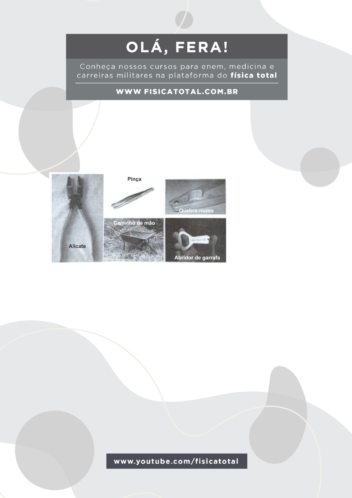 QUESTÃO 05. 2018 As pessoas que utilizam objetos cujo princípio de funcionamento é o mesmo do das alavancas aplicam uma força, chamada de força potente, em um dado ponto da barra, para superar ou equilibrar uma segunda força, chamada de resistente, em outro ponto da barra. Por causa das diferentes distâncias entre os pontos de aplicação das forças, potente e resistente, os seus efeitos também são diferentes. A figura mostra alguns exemplos desses objetos. Em qual dos objetos a força potente é maior que a força resistente? a) Pinça. b) Alicate. c) Quebra-nozes. d) Carrinho de mão. e) Abridor de garrafa. COMENTÁRIO DA QUESTÃO Analisando a situação problema: Dentre os objetos, a pinça é a única para a qual a força potente se sobressai (é maior) sobre a resistente. Isso acontece pois o ponto de aplicação da força feita é mais próximo da extremidade fixa da alavanca que o ponto onde é aplicada a força resistente. Para o restante dos instrumentos, a força necessária a ser feita (potente), é sempre menor ou igual à de uma segunda força a ser vencida (resistente). A partir do explicado acima, temos que o gabarito é a alternativa [a].