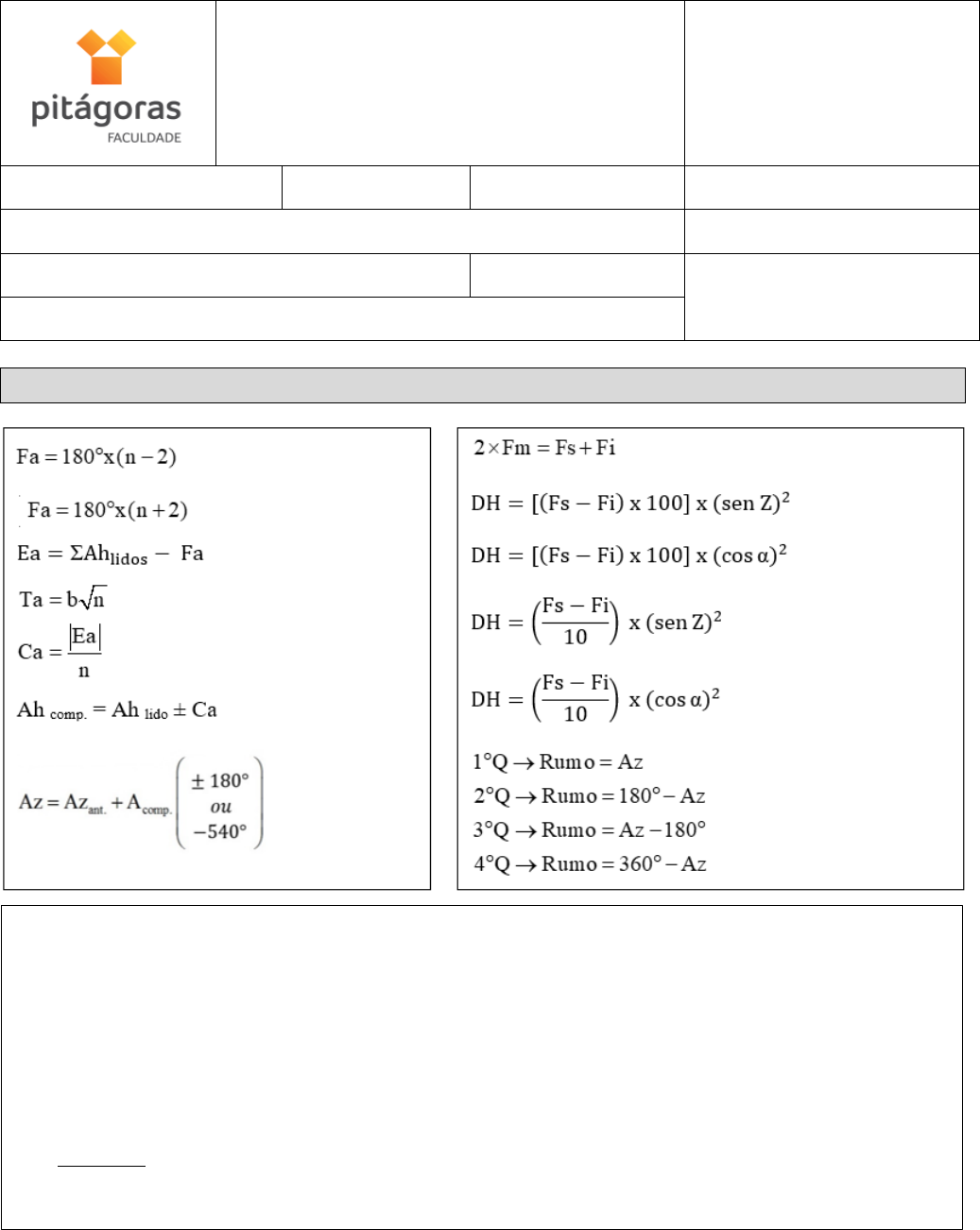 1 Trabalho de Topografia – Engenharia Civil – 2020/1 FACULDADE PITÁGORAS DE GOIÂNIA Rua S3, nº 692 – Setor Bela Vista, Goiânia/GO, CEP. 74.823-440 / (62) 36048300 TRABALHO N1 Curso: Engenharia Civil Período: Turma: Turno: Noturno Aluno (a): R.A. Disciplina: Topografia e Georreferenciamento Data: Nota: Professor: Me. Leomar Rufino Alves Júnior FORMULÁRIO AI = Cota + VR Cota = AI – VI ou Cota = AI – VM R M F IV V Cota Cota − = − F IE Cota Cota= − C = E nº de Rés 2 Trabalho de Topografia – Engenharia Civil – 2020/1 Considerando a poligonal fechada desenvolvida por ângulos horários internos e as coordenas cartesianas dos seus respectivos vértices calcule o que é pedido nas Questões 1 a 5. Questão 01 Verifique se existe erro de fechamento angular na poligonal e se este erro é tolerável. Adote a precisão angular do equipamento igual a 00°00’10”. (demonstre os cálculos) 3 Trabalho de Topografia – Engenharia Civil – 2020/1 Questão 02 Faça a distribuição do erro angular encontrado na questão anterior e calcule os ângulos horizontais corrigidos para cada um dos vértices da poligonal. Estação Vante Ângulo H. Ca Ângulo H. Comp. 1 2 62°35’20” 2 3 230°45’30” 3 4 65°15’40” 4 5 88°12’40” 5 6 126°10’30” 6 1 147°00’50” Questão 03 Com base nos ângulos horizontais corrigidos calculados na questão anterior e no azimute inicial fornecido do alinhamento 1-2, no croqui da poligonal, calcule os azimutes dos demais alinhamentos. Estação Vante Azimute 1 2 60°00’00” 2 3 3 4 4 5 5 6 6 1 Questão 04 Converta os azimutes calculados na questão anterior em rumos e informe seus quadrantes. Estação Vante Rumo Quadrante 1 2 2 3 3 4 4 5 5 6 6 1 4 Trabalho de Topografia – Engenharia Civil – 2020/1 Questão 05 Calcule área da poligonal em metros quadrados. Ponto X Y X.Y Y.X 1 121,021 90,305 2 477,252 295,975 3 794,464 175,750 4 766,087 583,263 5 238,447 529,913 6 110,699 312,172 1 121,021 90,305 Questão 06 Julgue as afirmações se VERDADEIRAS (V) ou FALSAS (F) a) ( ) Rumo é um ângulo horizontal com origem nos pontos cardeais Sul e Leste e varia de 0° a 90°, sendo medido no sentido horário nos primeiro e terceiro quadrantes e no sentido anti-horário nos segundo e quarto quadrantes; b) ( ) Azimute é um ângulo horizontal medido a partir do Norte no sentido anti-horário até o próximo alinhamento da Vante, variando de 0° a 360°; c) ( ) Goniologia é a parte da Topografia que estuda os processos e instrumentos utilizados para avaliar os ângulos; d) ( ) Nos processos de medição indiretas de distância utiliza-se, Medidores Eletrônicos de Distância (MED), tais como estações totais e trenas digitais. Questão 07 Cite e explique quais são os erros cometidos da medição direta de distância utilizando-se um diastímetro (trena) nas situações A e B. Situação A: Situação B ______________________________________ ___________________________________ ______________________________________ ___________________________________ ______________________________________ ___________________________________ ______________________________________ ___________________________________ ______________________________________ ___________________________________ 5 Trabalho de Topografia – Engenharia Civil – 2020/1 Questão 08 Identifique as partes indicadas do Teodolito eletrônico marca Topcon, modelo DT 200. Questão 09 Em um cálculo de distância de forma indireta, utilizando-se um teodolito, os fios estadimétricos incidiram na mira nas posições A e B. Faça a leitura dos fios (em milímetros ou metros) e calcule as distâncias horizontais nas duas posições com base nos ângulos verticais fornecidos. Posição A: (Valor: 50 pontos) Posição B: (Valor: 50 pontos) Z = 87°29’05” = 45°20’11” DH = DH = FS = FM = FI = FS = FM = FI = 6 Trabalho de Topografia – Engenharia Civil – 2020/1 Questão 10 Calcule a Planilha de Nivelamento Geométrico abaixo. APRESENTE OS CÁLCULOS. OBS.: Será aceito a correção da planilha pelo método tradicional (correção nos valores das Rés), ou pelo método acumulado (correção diretamente nos valores das Cotas). INT. MUD. INT. MUD. 1 1,296 8 1,359 9 1,331 7 1,235 5 0,750 6 2,740 4 1,386 2 0,421 3 1,503 1 610,649 PLANILHA CORRIGIDA PN RÉ VANTE ALT. INST. (AI) COTAS 1 1,296 9 1,226 1,331 8 1,359 7 1,532 1,235 6 1,921 2,740 5 0,750 1,503 4 1,781 1,386 610,649 610,649 2 0,421 RÉ VANTE ALT. INST. (AI) COTAS Cotas Corrigida 1 1,048 PN 3 CÁLCULOS: