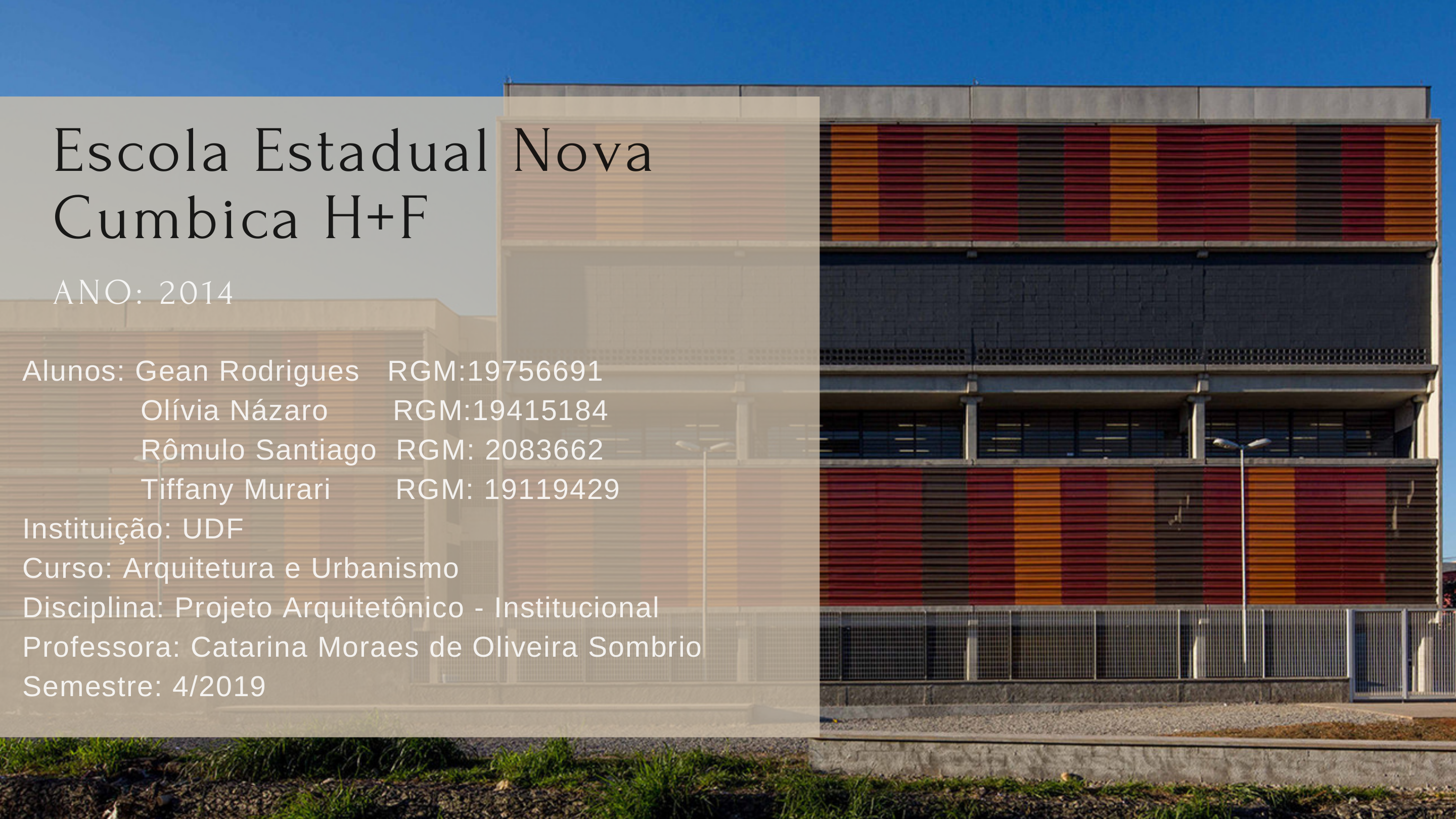 Escola Estadual Nova Cumbica H+F ANO: 2014 Alunos: Gean Rodrigues RGM:19756691 Olívia Názaro RGM:19415184 Rômulo Santiago RGM: 2083662 Tiffany Murari RGM: 19119429 Instituição: UDF Curso: Arquitetura e Urbanismo Disciplina: Projeto Arquitetônico - Institucional Professora: Catarina Moraes de Oliveira Sombrio Semestre: 4/2019 Implantação Localização: Rua Baixio - Vila Nova Cumbica, Guarulhos - SP, 07231-040 - Brasil Justificativa do Projeto Planta Térreo Planta Pav.1 Planta Pav.2 Planta Pav.3 Orientação Solar, Climatização Ventilação Setorização Setorização Perspectiva Externas Perspectivas Internas