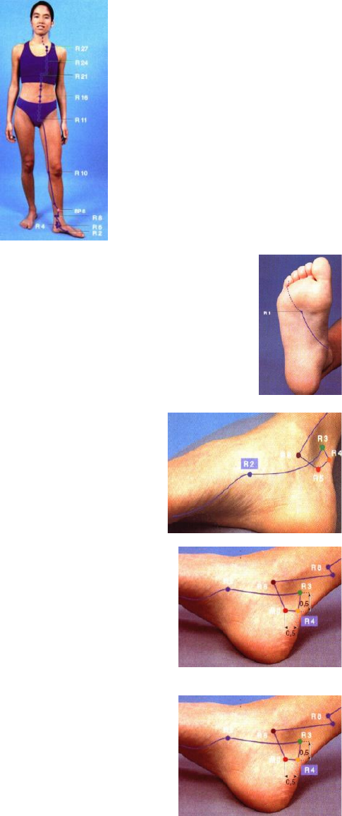 Meridiano do Rim • 27 pontos bilaterais. R1 – Ting e Sedação Localização: Na planta do pé, entre os ossos do 2 ° e 3 ° metatarso, cerca de um terço anterior do pé. R2 - Iong Localização: No anteroinferior osso navicular R3 – Iu e Fonte Localização: Na linha da proeminência do maléolo medial, numa depressão entre o maléolo e o tendão do calcâneo. R4 – Luo Localização: 0,5 cun abaixo do R3, frente ao tendão do calcâneo R5 - Xi Localização: 1 cun abaixo do R3, na depressão entre o tálus e o calcâneo R6 Localização: 1 cun abaixo da proeminência do maléolo medial. R7 – King e Tonificação Localização: 2 cun acima da proeminência do maléolo medial, frente ao tendão do calcâneo. R9 Localização: 5 cun acima da proeminência do maléolo medial, anterior ao tendão do gastrocnêmico. R10 – Ho Localização: No lado medial da linha poplítea, entre os tendões semitendinoso e semimembranoso Ação energética dos pontos R1: Tonifica o Yin, acalma o Yang e o Fogo do Fígado e do coração, acalma o shen e ativa os sentidos; R6: Tonifica o Yin do RIM e do organismo, elimina o calor, beneficia os olhos e a garganta, acalma a mente e esfria o sangue; R7: Tonifica o Yang do Rim e o QI, elimina umidade e junto com IG4 provoca sudorese; R9: Tonifica e harmoniza Yin do Rim, coração e acalma a mente.