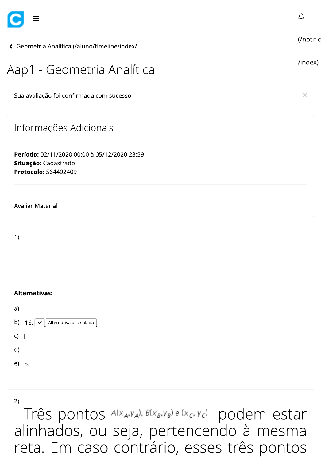 Pedro precisa construir um canteiro de forma triangular no quintal da sua casa. Para cercar o canteiro, ele irá utilizar arame de alumínio, e para isso precisa calcular o perímetro da área triangular e ver quanto de arame precisará.Esse triângulo possui vértices com as seguintes coordenadas: A (1,5) B (-2,1) e C (4,1). Assinale a alternativa que representa o perímetro do triângulo: 11. 5. 6. Colaborar - Aap1 - Geometria Analítica https://www.colaboraread.com.br/aluno/avaliacao/index/2437933303?a... 1 of 3 03/12/2020 23:25 Colaborar - Aap1 - Geometria Analítica https://www.colaboraread.com.br/aluno/avaliacao/index/2437933303?a... 2 of 3 03/12/2020 23:25 Colaborar - Aap1 - Geometria Analítica https://www.colaboraread.com.br/aluno/avaliacao/index/2437933303?a... 3 of 3 03/12/2020 23:25