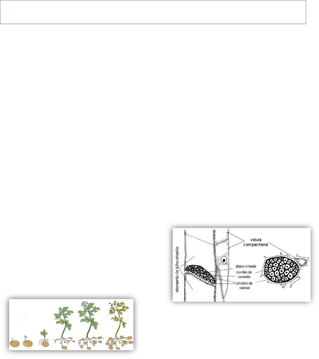 Translocação e distribuição de assimilados: Para que ocorra a translocação de solutos orgânicos é essencial que haja órgãos produtores ou de reservas, com disponibilidade de fotoassimilados no órgão produtor e órgãos consumidores com sistema eficiente de transporte, interligando órgãos produtores e consumidores. O Carbono fixado na fotossíntese pode ser utilizado para manutenção do metabolismo da planta, para armazenagem ou para transporte de substâncias. Fonte: qualquer órgão produtor (exportador), tipicamente folhas maduras, que produzem fotoassimilados. Fonte secundária: reservas hidrolisadas da batata se difundem até a gema, fornecendo substratos para desenvolvimento da planta em formação. Dreno: folhas jovens, meristemas, órgão reprodutor e raízes. Quando um tubérculo é utilizado como semente, o mesmo vai ser a fonte que desenvolve a gema, e a gema será o dreno que precisa importar substâncias que serão hidrolisadas, fornecendo moléculas menores até ter crescimento da parte aérea. À medida que a parte aérea se desenvolve, se torna plenamente ativa e a fonte principal, já as raízes e os tubérculos que estão crescendo, passam a ser os drenos. A translocação envolve dois sistemas: Xilema e floema, coma função de distribuir e redistribuir nutrientes, minerais e solutos na planta. O xilema é responsável apenas por entrada de água e de sais minerais. Já o floema é responsável por translocação e distribuição dos fotoassimilados. Floema é constituído por elementos de tubo crivado (típico das angiospermas), células altamente especializadas, com áreas crivadas, poros grandes e revestidos por calose (um polissacarídeo), dispostos verticalmente. Anatomicamente, no caule, o floema se localiza externamente ao xilema, estando então mais próximo da casca do caule. Proteínas P: uma das funções é selar os poros do tubo crivado (TC) que são danificados. Além disso, as proteínas P são importantes para que o conteúdo transportado no floema não extravase. Calose: beta-1,3-glucano é sintetizada por uma enzima na membrana plasmática e depositada entre a membrana e a parede celular. Também é sintetizada em resposta a lesão, estímulo mecânico, altas temperaturas e dormência. E é degradada, caso haja necessidade. Translocação de Solutos Células crivadas (gimnospermas): células alongadas, com parede primárias, pouco espessas e geralmente não lignificadas. Fibras e esclereídeos: confere sustentação e exerce ocasionalmente função de reserva. Células companheiras ou parenquimáticas: células de contorno triangular ou pentagonal, com protoplasma e núcleo. Cada tubo crivado está associado a uma ou mais células companheiras, interligadas pelos plasmodesmas ou plasmodesmata. Com a importância de síntese de proteínas, produção de ATP e fluxo de fotoassimilados para os tubos crivados. Velocidade de translocação dos assimilados: É bastante variável, com fatores como espécie, variabilidade genética dentro de uma mesma espécie, condições ambientais e força do dreno, que afetam a translocação. Via de translocação (direção): é determinado pela distância relativa entre as áreas de produção e consumo de assimilados. A via de translocação (fonte para dreno) segue regras anatômicas e de desenvolvimento, ou seja, as fontes não suprem igualmente todas as partes de uma planta, sendo que certas fontes suprem preferencialmente certos drenos. Isso significa que o dreno mais forte terá preferência. Fatores que definem a força do dreno: Proximidade: normalmente as fontes translocam nutrientes para os drenos que estão mais próximos delas. Como critério geral: as folhas da porção superior da planta costumam translocar nutrientes para as folhas novas e caules em crescimento e as folhas da porção basal tendem a exportar para o sistema radicular. Desenvolvimento: durante a fase vegetativa, os maiores drenos são raízes e ápices caulinares. Na fase reprodutiva, os frutos se tornam dominantes. Conexão vascular: as fontes translocam assimilados preferencialmente para drenos com os quais elas têm conexão vascular direta. Força da fonte e do dreno de assimilados: A força de um processo é determinada por um fator de magnitude e outro de intensidade (ou atividade). Assim tem-se: Fonte é medida da produção de assimilados, tem caráter de magnitude; Dreno é medida da utilização de assimilados, tem caráter de intensidade. Não basta a presença da Fonte ou Dreno, tem que ser funcional, pois qualquer fator adverso à fotossíntese, afeta a força da fonte, por afetar a sua atividade. Maior tamanho significa maior força? Não, pois se ocorrer o autossombreamento, as folhas superiores sombreiam as inferiores, menos radiação solar vai chegar, diminuindo a eficiência da fotossíntese. No caso de excesso de frutos, diminui a força do dreno, variando também com o desenvolvimento da planta. Durante o crescimento vegetativo a preferência dos drenos é pelo ápice da parte aérea e pelas raízes. Já durante o crescimento reprodutivo, os drenos preferenciais são os frutos. Transporte de açúcar do cloroplasto para os tubos crivados Transporte a curta distância Etapa 1. Produtos saem dos cloroplastos para o citosol. Etapa 2. Sacarose move-se das células do mesofilo (fonte) para as células vizinhas do elemento crivado. Pode ocorrer totalmente pelo simplasto, via plasmodesmas, ou pode ocorrer parte via simplasto e parte via apoplasto (depende da espécie). Etapa 3. Transporte dos açúcares para dentro dos elementos do tubo crivado e células companheiras, onde eles se tornam mais concentrados do que no mesofilo. Esta absorção pode ocorrer via plasmodesma (simplasto) ou, no caso da via apoplástica, através de um simporte sacarose-H+ na membrana plasmática. Mecanismo de translocação no floema Transporte a longa distância Uma característica do transporte no floema é que ele, ao contrário do