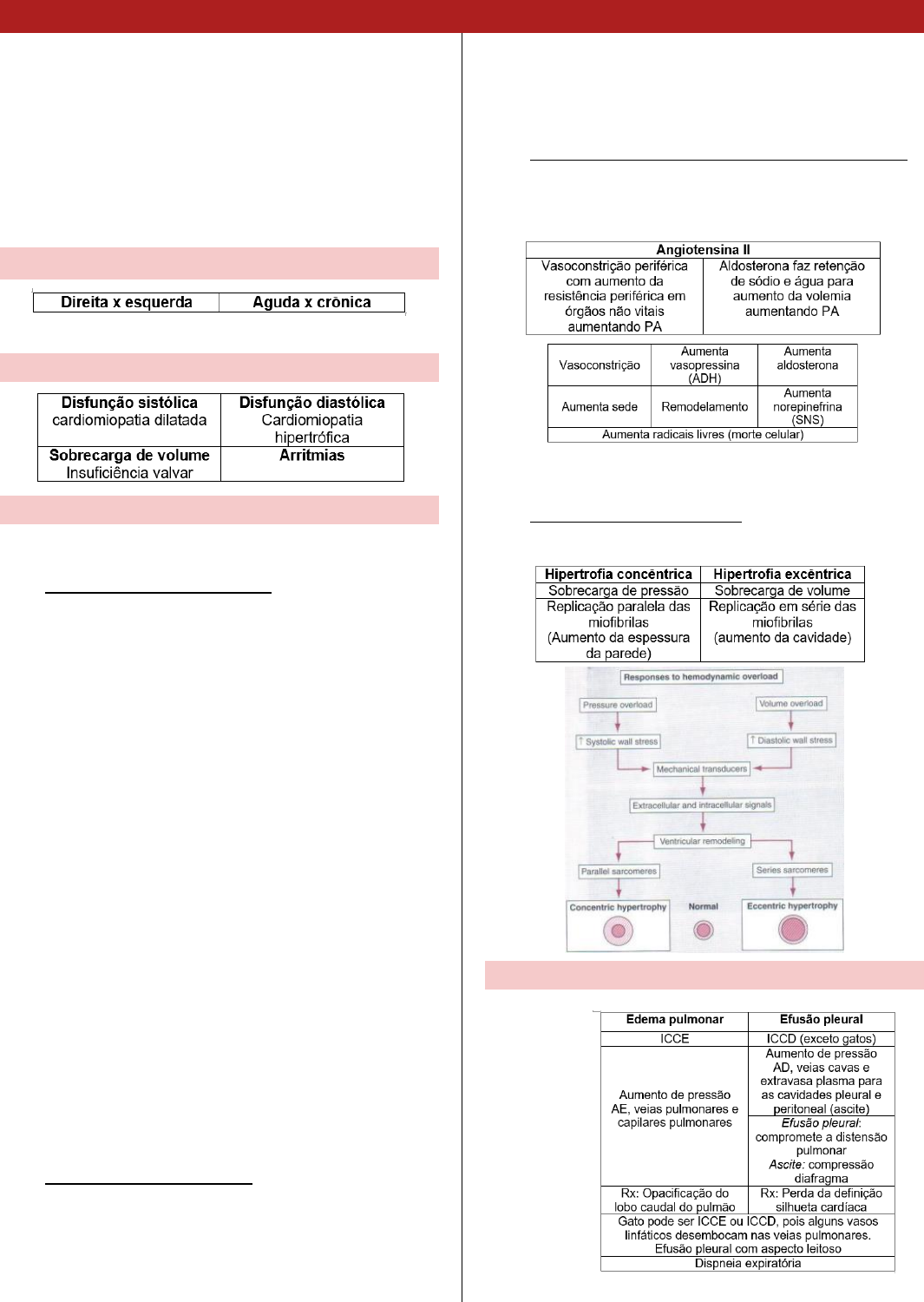 Clínica de Pequenos Animais 2 Camilla Teotonio Pereira INSUFICIÊNCIA CARDÍACA CONGESTIVA Insuficiência cardíaca é o estado patofisiológico no qual o coração é incapaz de bombear sangue de forma a atender as necessidades metabólicas do organismo, ou faz isso sob altas pressões de enchimento. É originada por anomalias da pré, pós carga e contratilidade. Insuficiência cardíaca seca: DC muito baixo que causa hipotensão. Sintomas sincope, fraqueza. FORMAS DE IC Forma aguda: infarto é raro na veterinária. CAUSAS MECANISMOS COMPENSATÓRIOS CURTO PRAZO 1. Mecanismo de Frank-Starling A energia de contração é proporcional ao comprimento inicial da fibra cardíaca. O aumento da pré carga (volume), que leva ao aumento da pressão diastólica final, provoca melhora da performance ventricular. Imagine que o ventrículo vai se enchendo, fazendo com que os músculos cardíacos se estirem e queiram voltar ao seu estado de repouso. Com isso, quanto mais cheio o ventrículo, maior é a disposição muscular de voltar a esse estado, aumentando a intensidade da força de contração. O enchimento do ventrículo é o gatilho para todo o processo de aumento da força de contração cardíaca. Primeiro, por causa da tensão passiva do músculo cardíaco, depois, pela maior entrada de cálcio nas células musculares devido ao aumento da sensibilidade ao íon Ca++. Por fim, ainda eleva a possibilidade de interações entre actina e miosina no espaço interfibrilar, reduzido pelo estiramento. Com isso, o coração não precisa de um controle nervoso nem hormonal constante para bombear o sangue. Todo esse processo fisiológico do mecanismo de Frank-Starling resulta na ampliação do volume sistólico em resposta ao aumento do volume diastólico final. ECO aumento da contratilidade. 2. Sistema nervoso simpático Os barorreceptores presentes na carótida e seio aórtico são receptores de pressão. Em caso de baixa pressão arterial devido à má perfusão, baixo debito cardíaco, os barorreceptores manda informação para centro cardio vascular localizado no encéfalo pelos nervosos aferentes (glossofaríngeo e vago). A resposta do centro cardio vascular é aumentar o SNS que tem como função de aumentar retenção de liquido pela aldosterona e vasoconstrição periférica. 3. Sistema renina angiotensina aldosterona (SRAA) Quando o DC e pressão arterial estão reduzidos ocorre ativação do SRAA para restabelecer a perfusão. LONGO PRAZO 1. Remodelamento ventricular Resposta a sobrecarga crônica MANIFESTAÇÕES CLÍNICAS DISPNÉIA Aspecto da efusão pleural. cão gato ASCITE EDEMA PERIFÉRICO Somente quando animal apresenta primeiro ascite e depois edema periférico. Se o edema for primeiro a causa não deve ser por problemas cardíacos. CLASSIFICAÇÃO 1. Classe I Paciente assintomático. 2. Classe II Insuficiência cardíaca de discreta a moderada (sintomático). Presença de sinais clínicos de insuficiência cardíaca, em repouso ou exercício de intensidade leve. 3. Classe III Insuficiência cardíaca avançada. Sinais clínicos muito evidentes de insuficiência cardíaca. TRATAMENTO Maioria das cardiomiopatias não tem cura e o TTM é sintomático. DIURÉTICOS Tratamento do edema pulmonar cardiogênico é a remoção do líquido em excesso que se encontra no interstício e/ou nos alvéolos pulmonares, como consequência de uma cardiopatia. A ativação neuro-hormonal pode ser uma consequência desagradável do uso crônico de diuréticos, porém pode ser minimizado com o uso de doses mais baixas ou em associação a inibidores da ECA. 1. Furosemida Fármaco de efeito rápido quando administrado por IV, com início de ação em 5 minutos e pico de ação em 30 minutos. Bem tolerado tanto para cães, quanto por gatos. Diuréticos de alça ascendente de Henle que inibe a bomba de Co transporte Na/K/Cl. Diversas vias de administração. Dose depende da manifestação clínica entre 1mg/kg EDA (dias alternados) a 4mg/Kg, TID. Em casos menos graves, deve-se iniciar com a menor dose e manter aquela com a qual o animal apresente mínimos sinais de ICC. A administração da furosemida em infusão contínua pode fornecer diurese melhor quando comparada à injeção em bolus, pois o débito urinário é maior e a perda de potássio de menor. Ela pode ser diluída na concentração de 5 a 10 mg/mℓ em glicose 5%, solução fisiológica, RL ou água estéril. Uma vez que a diurese tenha iniciado e a respiração melhore, a dosagem é reduzida para prevenir contração excessiva de volume e depleção de eletrólitos. Edema pulmonar: 2 a 8mg/Kg cada 1-2 horas. Nos gatos, a dose deve ser menor do que a preconizada para os cães, pois os felinos apresentam maior sensibilidade ao fármaco e, consequentemente, resposta terapêutica efetiva com menores doses de furosemida, porém com piores efeitos colaterais. Diurese excessiva associada à administração de inibidores da ECA pode induzir insuficiência renal funcional. Os diuréticos também devem ser utilizados com cuidado nos casos de sinais de baixo DC (fraqueza, síncope, pulso hipocinético, membranas mucosas hipocoradas) ou nos estados de baixo enchimento ventricular como tamponamento cardíaco. Diurético + inibidor da ECA: 1 a 2mg/Kg, BID. Eliminação: 65% urina / 35% fezes. Efeitos colaterais: letargia, desidratação, hipocalemia raramente hipotensão. Mensurar constante dosagem sérica de sódio, potássio, ureia e creatinina a cada 2 ou 3 meses com terapia prolongada. Torasemida (Torsemin) droga nova e mais potente que furosemida, porém é cara e uso quando tem resistência de furosemida. A continuidade do uso da furosemida ou da frequência de administração no tratamento do edema pulmonar cardiogênico depende da resposta clínica do paciente, ou seja, deve-se diminuir a dose e a frequência, conforme a melhora clínica do paciente e do padrão respiratório. 2. Hidroclorotiazida Diurético tiazidico de túbulo distal e em menor int