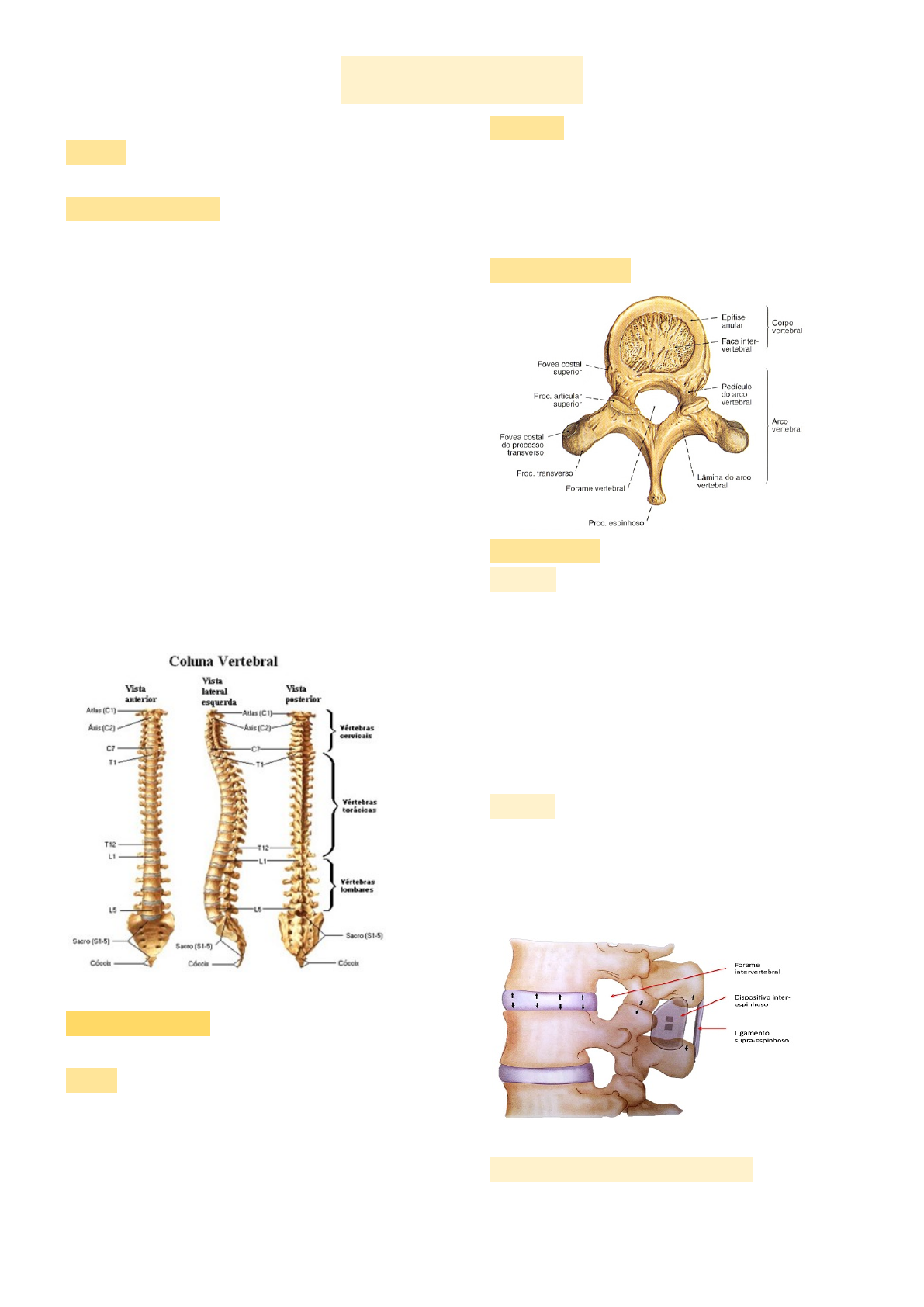 Coluna Verte�al DORSO-> face posterior do tronco. COLUNA VERTEBRAL-> 33 VÉRTEBRAS; ● 7 CERVICAIS ● 12 TORÁCICAS ● 5 LOMBARES ● 5 SACRAIS ● 4 COCCÍGEAS Movimento significativo: 24 superiores; das 9 inferiores- 5 sacrais fundidas e 4 coccígeas formando cóccix. Vértebras- torna- se maior gradualmente à medida que a coluna desce até o sacro depois menores. C.V - elástica-. vértebras + disco iv elástico. VÉRTEBRA COMUM: corpo+arco 7 processos CORPO: anterior, redondo, resistência a cv. Tamanho varia, de T4 para baixo aumenta, sustentando um peso cada vez maior. DENTRO- osso trabecular - tecido com muita atividade hematopoiética. Entre as vértebras: discos de cartilagem hialina VÉRTEBRA COMUM Arco vertebral: 2 pedículos e lâminas. Pedículos: pontas cilíndricas que projeta posteriormente do corpo encontrando as lâminas (placas de ossos, planas)- ``ponte de saída do corpò ` Arco vertebral + superfície posterior do corpo = forame vertebral. Incisuras: fendas vistos lateralmente. Incisuras vertebrais superiores e inferiores das vértebras adjacentes e os discos IV que as unem formam os forames intervertebrais. 7 PROCESSOS ORIGINAM DO ARCO 1. PROCESSO ESPINHOSO 2. PROCESSOS TRANSVERSO: posterolateral, nas juntas de pedículo + lâmina 3. 4 PROCESSOS ARTICULARES: 2 superiores 2 inferiores #Cada um apresentando uma face articular, parte da junta dos pedículos e lâminas também. CARACTERÍSTICAS REGIONAIS DAS VÉRTEBRAS: 5 regiões -> faces articulares orientadas para permitir melhor tipo de movimento. ● VÉRTEBRAS CERVICAIS Pescoço. Menores- de C1 a C7 -tem o FORAME TRANSVERSÁRIO OVAL NO PROCESSO TRANSVERSO. Processos transversos: terminam em 2 pontas tubérculo anterior e posterior - dão fixação a grupo de músculos cervicais laterais. *sulco do nervo espinhal entre os tubérculos. *tubérculos anteriores da vértebra C6=- caroticos. DIVISÃO DA VERT. CERVICAIS: TÍPICAS: C3-C7- características: ● Grandes forames vertebrais (devido a intumescência da medula- inervação dos membros superiores) ● De c3-c6: processos espinhosos curtos e geralmente bifidus. *C7, processo espinhoso longo- vértebra proeminente, palpável. ATÍPICAS: C1 E C2 ● C1- atlas: não tem corpo, nem processo espinhoso. Tem um par de massas laterais- sustentação do crânio- de onde originam os processos transversos= vértebra mais larga. -Faces articulares superiores das massas- articulam com 2 relevos cranianos: côndilos occipitais nas laterais do forame magno. -Arco anterior e posterior com 1 tubérculo = anel. *O arco posterior tem o sulco da artéria vertebral na face superior. ● C2- AXIS Mais forte das cervicais. -faz o nó do pescoço. TEM: 2 grandes superfícies planas de sustentação: faces articulares superiores. Ponto forte: deste (processo odontóide) ● VÉRTEBRAS TORÁCICAS Parte superior do dorso- onde se fixam as costelas. principais características: FÓVEAS COSTAIS para articulação com as cabeças das costelas. 4 vértebras intermediarias: T5-T8-> típicas: -Processos articulares verticais com 2 faces articulares , definindo um arco cujo centro é o disco de rotação. Vértebras T1-T4-. algumas características em comum com as cervicais. ● T1- atípica: processo espinhoso longo, quase horizontal e tem uma fóvea costal completa na margem superior de seu corpo para a 1a costela, e uma hemi fóvea na inferior para contribuir para a costela. ● De T9 a T12- algumas características das vértebras lombares (ex; tubérculos parecidos com os acessórios) e processos mamilares. ● T12: metade superior- torácica (fóveas costais e processos articulares)- metade inferior- lombar (sem fóveas e com processos articulares- permitindo o movimento de flexao e extensao)- vértebra sujeita a estresse de transição- muito fraturada. ● VÉRTEBRAS LOMBARES Corpos espessos. Tendo corpo, forame vertebral, processos transversos, articulares e processos espinhosos (curtos, fortes e espessos). Em especial: -Na superfície posterior de cada processo transverso há um processo acessório (fixação de músculos intertransversários) -Na superfície posterior dos processos articulares; processos mamilares. *L5: responsável pelo ângulo lombossacral. ● SACRO 5 vértebras sacrais fundidas. Triangular. Resistência e estabilidade pelve. -Dentro dele-> canal sacral (continuação do canal vertebral- passagem a cauda equina) Nele há 4 pares de forame sacral para sair os ramos posteriores e anteriores dos nervos espinais- os anteriores (pélvicos) são os dorsais. BASE DO SACRO-> superfície superior da vértebra S1, processos articulares superiores articulam-se com os processos articulares inferiores da vértebra L5. Margem projetada anteriormente do corpo da vértebra-> promontório sacral- importante ponto de ref. obstétrica. ÁPICE DO SACRO: extremidade inferior afilada, face oval para articulação com o cóccix. *O sacro sustenta a CV e forma a parte posterior da pelve óssea. FACES DO SACRO: -Pélvica: lisa e côncava, com 4 linhas transversas (= fusão das vértebras sacrais) *na infância-> separadas por cartilagem hialina e pelo disco iv- depois se fundem e ossifica. FACE DORSAL: rugosa, convexa, com 5 cristas longitudinais proeminentes 1. SACRAL MEDIANA: central (processos espinhosos fundidos das 3 ou 4 vértebras sacrais superiores) 2. SACRAIS MEDIAIS: processos articulares fundidos. 3. CRISTAS SACRAIS LATERAIS: extremidades dos processos transversos das vértebras sacrais fundidas. CARACTERÍSTICAS IMPORTANTES: -hiato sacral: em U- leva ao canal sacral. -cornos sacrais: guia para localização *parte superior da superfície lateral do sacro- face auricular-> parte sinovial da articulação sacroilíaca entre o sacro e o íleo. Coberta por cartilagem hialina. ● CÓCCIX Osso da cauda, fusão de 4 vértebras coccígeas. A 1a vértebra= Col-> pode ficar separada ou junta, maior e mais larga das vértebras. Cóccix: vestígio embrionário da eminência caudal. S