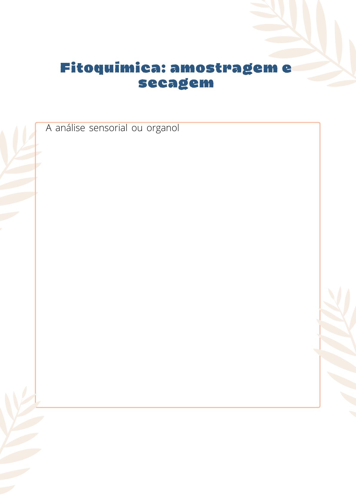 Fitoquímica: amostragem e secagem A análise sensorial ou organoléptica é aquela que utiliza os sentidos do indivíduo para chegar a conclusões sobre o material analisado. Nesse processo, são avaliadas características, como cor, textura, odor e sabor. As plantas possuem características bastante peculiares com relação a esses parâmetros, o que torna a análise sensorial uma ferramenta bastante válida em sua análise e identificação. Tanto a cor quanto o odor e o sabor das plantas podem ser alterados com facilidade, dependendo dos processos aos quais a matéria vegetal foi submetida, para tanto é importante observar algumas recomendações. Com relação à cor, é necessário lembrar que a matéria-prima deve ser examinada antes de qualquer tratamento, à luz do dia ou utilizando iluminação artificial que simule a luz do dia. A cor da amostra deve ser comparada com o material de referência. Para avaliação de textura, é indicado tocar o material, dobrá-lo e parti-lo para a obtenção de informações quanto à sua fragilidade e à aparência da fratura, para determinar se ela é fibrosa, lisa, rugosa, granulada, entre outras. É importante alertar que o odor deve ser verificado, mas antes disso é necessário certificar-se de que não existe risco. farmacognosia farmablogueira Para a avaliação de odor, a recomendação é colocar uma pequena amostra na palma da mão ou em recipiente de vidro e inalar o aroma devagar e repetidamente. Caso a amostra não possua um odor perceptível a esse procedimento, recomenda-se pressionar parte do material entre os dedos e inalar novamente. Caso a monografia da planta indique material tóxico, recomenda-se colocar um pouco de material esmagado em água quente para que a inalação não seja direta. É necessário, no caso do odor, determinar a sua intensidade: nenhum (odor ausente), fraco, distinto ou forte, e além da sensação causada por ele: aromático, frutoso, mofado ou rançoso. Ainda sob orientações da Farmacopeia, é recomendável que essa comparação de odor seja feita ainda com o odor de substância definida, exemplos são o odor do hortelã-pimenta, que deve ser similar ao mentol, e o odor do cravo-da-índia, que deve ser similar ao eugenol. O teste de sabor só deve ser adotado quando exigido na monografia, sendo expressamente garantida a segurança dessa ação. farmacognosia farmablogueira