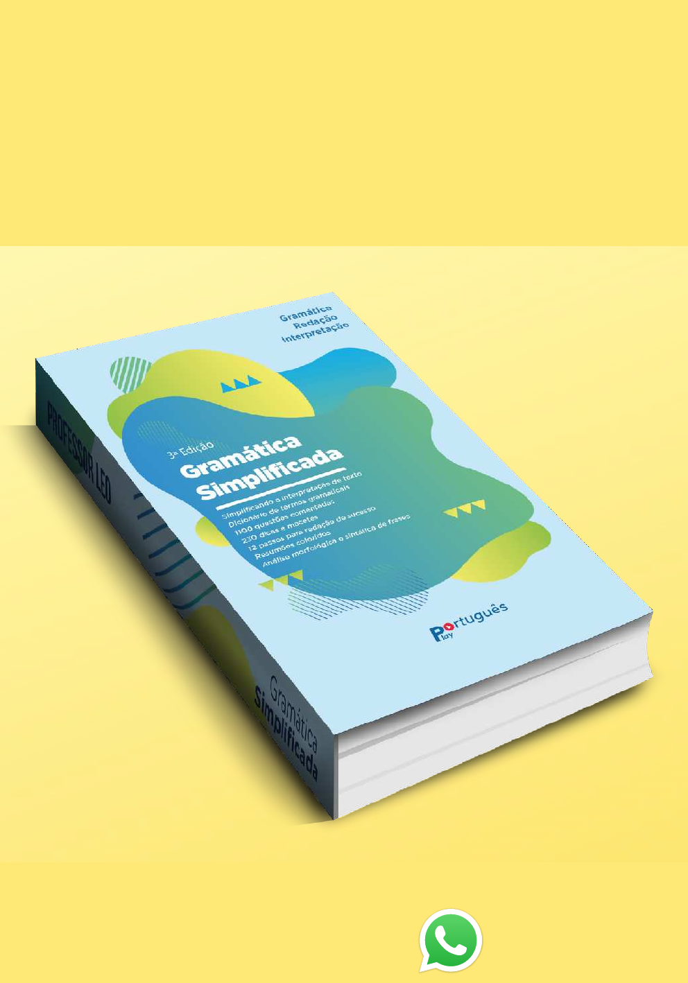 SIMPLIFIQUE SEUS ESTUDOS CASO TENHA DÚVIDAS, SÓ ME CHAMAR NO WHATSAPP GRAMÁTICA DEMONSTRATIVA CLIQUE NO ÍCONE https://api.whatsapp.com/send?phone=5537988063373 Gramática da Língua Portuguesa R E S U M Õ E S B E N E F Í C I O POR QUE VOCÊ APRENDERÁ PORTUGUÊS? Desenvolvido por alguém que já foi aprovado em mais de 10 concursos e tem mais de 17 anos de experiência. Você será capaz de entender de forma mais simples centenas de assuntos; o que muitos gastariam minutos, você faria em menos tempo. Você será capaz de revisar toda a matéria para concursos em poucos dias, ganhando tempo para fazer mais exercícios. Toda a gramática em forma de resumos para você aprender de forma objetiva; sintetizamos seus estudos para você não perder tempo. D I C A S E M A C E T E S B E N E F Í C I O Centenas de dicas separadas por assunto para tornar seus estudos mais fáceis, descomplique assuntos difíceis em menos tempo. Você fixará tudo que aprendeu por meio de cada comentário, pois eles trazem dicas, além de você revisar toda a matéria em pouco tempo. Mais de 1100 questões de provas anteriores separadas por assunto, todas as questões são comentadas e vêm com gabarito. Q U E S T Õ E S C O M E N T A D A S B E N E F Í C I O A N Á L I S E D E F R A S E S B E N E F Í C I O POR QUE VOCÊ APRENDERÁ PORTUGUÊS? Desenvolvido por alguém que já foi aprovado em mais de 10 concursos e tem mais de 17 anos de experiência. Você será capaz de compreender e interpretar melhor os textos, aprenderá como são cobradas as questões e o que fazer para atingir notas excelentes. Você será capaz de entender a diferença da morfologia e da sintaxe, saberá como que um termo morfológico é conhecido na parte sintática. Análise morfológica e sintática de frases, cada termo dentro da frase é identificado não só morfologicamente, mas também sintaticamente. INTERPRETAÇÃO DE TEXTO B E N E F Í C I O Teoria e exercícios de concursos anteriores e com gabarito. As matérias são separadas por assunto para melhor fixação e, abaixo delas, vêm as questões. Você será capaz de redigir excelentes redações, aprenderá a deixar seu texto mais claro, conciso, coerente. Será capaz de redigir textos mais rápidos. Teoria clara e objetiva e com exercícios práticos, conteúdo do básico ao avançado; cada matéria é separada por assunto. R E D A Ç Ã O B E N E F Í C I O O R D E M D E E S T U D O B E N E F Í C I O T U D O D E Q U E P R E C I S A PARA APRENDER PORTUGUÊS Se você sonha aprender português de forma objetiva, esta gramática é a sua solução. Você conseguirá sanar sua dúvida, pois o Professor Leo lhe explicará de forma simples por meio de um áudio sempre que precisar. Você terá um aprendizado mais sólido e mais rápido, dado que uma matéria está interligada com a outra. Você só tem que seguir a ordem do livro. Leia o resumão; Leia as dicas e macetes; Faça questões comentadas; Tire suas dúvidas com o Professor. Esquema com a ordem correta para você seguir seus estudos na parte gramatical. Só se aprende português estudando na ordem correta, por exemplo, antes de estudar crase, é necessário saber muito bem morfologia e depois sintaxe e regência. S U P O R T E C O M O P R O F E S S O R B E N E F Í C I O Você terá suporte por 6 meses para tirar suas dúvidas sobre quaisquer questões ou matéria dentro do livro. COMO É A GRAMÁTICA SIMPLIFICADA? Este livro tem o objetivo de preparar qualquer aluno para quaisquer provas de concursos públicos ou vestibulares, pois traz toda a matéria de língua portuguesa de forma bem objetiva e clara. Além disso está na ordem em que o aluno deve estudar para melhor domínio da matéria. Gramática Gramática do básico ao avançado para você se sair bem nas provas, a matéria é transmitida por meio de resumos coloridos, fazendo você aprender o que realmente é relevante nas provas. Dicas Seção para facilitar seus estudos por meio de dicas e macetes, tornando a matéria mais fácil. Com as dicas, você tirará aquelas dúvidas que tanto atrapalham você em seus estudos. Questões comentadas Revise toda a gramática por meio das questões comentadas; quanto mais você fizer, mais fixará o conteúdo e o dominará. A prática é o que levará você à perfeição; as questões foram separadas por matéria e por tópicos, também vêm com comentários e com gabarito no final de cada matéria. Questões comentadas Aprenda análise morfológica e sintática na prática por meio de frases; entenda dezenas de termos morfológicos e sintáticos. Interpretação Aprenda como interpretar e compreender os textos de forma mais objetiva; você aprenderá todos os conceitos para não errar mais questões nas provas; além disso você encontrará questões abaixo de cada tópico. Redação Você aprenderá 12 passos para dominar a arte de redigir excelentes redações; aprenderá os termos básicos e avançados para dominar a arte de escrever. Para melhor fixação do conteúdo, você ainda contará com exercícios de fixação a fim de colocar em prática o que aprendeu. Dicionário de termos gramaticais Aprenda todos os termos da gramática, redação e interpretação de texto de forma objetiva; é um dicionário que explica cada conceito e traz ainda exemplos. Para melhor entendimento, os termos foram separados por tópico. Análise morfológica e sintática Aprenda na prática morfologia e sintaxe por meio de análise de frases; você entenderá a função de cada palavra na frase. ISBN 978-65-00-02768-6 QUEM É O PROFESSOR LEO Aos 13 anos de idade, eu morava sozinho, passei muitas dificuldades na vida, porém sempre sonhava ser um homem bem sucedido. Embora não tivesse a menor chance, já que eu e meus irmãos de 12 e 14 anos vivíamos sós e éramos os mais pobres de toda a família. Perdi o contato com minha mãe quando eu ainda era criança, chorei muito pela ausência dela e também a falta de um pai presente 