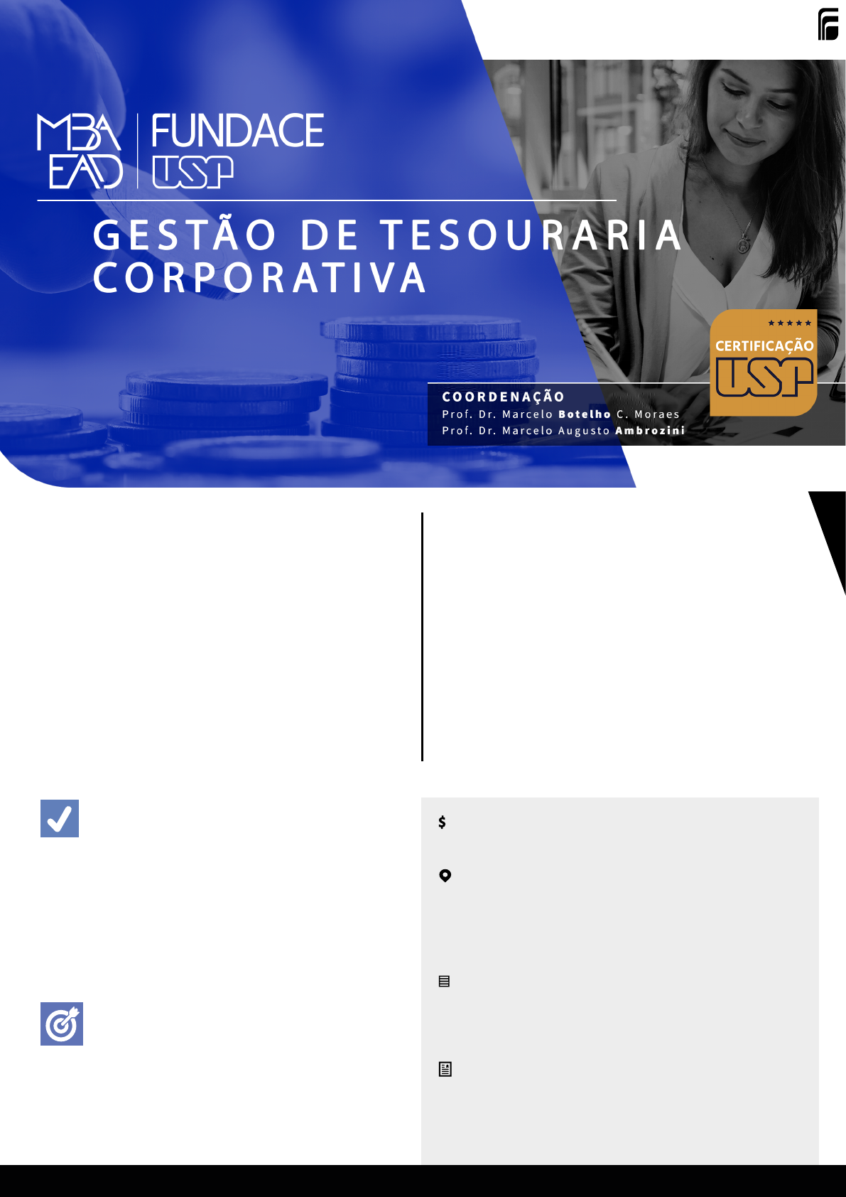 PROCESSO SELETIVO PÚBLICO-ALVO ▪ A inscrição pode ser feita pela internet (cursos.fundace.org.br); ▪ A seleção é feita através de análise curricular, entrevista e prova; ▪ A aprovação consiste no resultado conjunto de todas as etapas do processo. ▪ Os candidatos devem portar diploma de graduação de instituição reconhecida pelo MEC. O público alvo do curso é formado por graduados em diversas áreas, em franca ascensão, profissionais que atuam em áreas como Tesouraria, Finanças, Contabilidade, Controladoria, Planejamento Financeiro, Mercado Financeiro e de Capitais e afins. OBJETIVOS SO BR E O MBA Gestão de Tesourar ia Corporativa, apresenta o conteúdo para uma formação sólida, embasada nas diversas áreas que permeiam o entendimento de uma moderna gestão de tesouraria. Com uma grade moderna e estruturada para focar os principais tópicos relacionados a Gestão de Tesouraria Corporativa, o programa conta com um projeto pedagógico que fará com que o participante conheça desde os fundamentos financeiros, econômicos e contábeis até o uso de técnicas e ferramentas de análises avançadas de risco e investimentos. O programa MBA Gestão de Tesouraria Corporativa tem o objetivo de capacitar os profissionais da área, contadores, economistas, administradores, controllers e demais interessados na área que poderão incorporar as competências: ▪ Sólido embasamento teórico e prático na área de gerenciamento e gestão de tesouraria. ▪ Análises de investimentos em condições normais e de incertezas (riscos) para tesouraria corporativa. ▪ Entendimento e análise das demonstrações financeiras, com enfoque na interpretação e tomada de decisões a partir da leitura dos dados contábeis. ▪ Estruturação de operações avançadas nos mercados. www.fundace .org .br INVESTIMENTO Informações sobre investimento disponíveis no telefone: 0800 77 300 70 ou e-mail: atendimento@fundace.org.br POLOS As atividades presenciais do curso serão realizadas em polos distribuídos em TODAS* as capitais do país. * O MBA EAD FUNDACE | USP reserva-se o direito de alteração dos polos baseado na demanda de cada turma. A viabilização de cada polo está condicionada à quantidade mínima de 10 alunos por cidade. TRABALHO DE CONCLUSÃO DE CURSO Atividade individual, a ser desenvolvida durante o curso que deverá ser apresentada presencialmente e avaliada por banca examinadora. Para aprovação final a nota do trabalho de conclusão deverá ser igual ou superior a 7, numa escala de 0 a 10. CERTIFICADO DE CONCLUSÃO DE CURSO Para o recebimento do Certificado de Conclusão é necessário média maior ou igual a 7,0 nas avaliações de cada módulo, em uma escala de 0 a 10, e frequência mínima de 75% nas atividades. As provas presenciais respondem por 55% da nota dos alunos e acontecerão a cada seis meses. | CONTEÚDO PROGRAMÁTICO MÓDULO I - AMBIENTE DE NEGÓCIOS POLÍTICAS E CENÁRIOS ECONÔMICOS GOVERNANÇA CORPORATIVA EMPREENDEDORISMO E INOVAÇÃO COMPLIANCE REGULAÇÃO EM TESOURARIA TECNOLOGIAS, BLOCKCHAIN E SMART CONTRACTS MÓDULO II - FUNDAMENTOS DE CONTABILIDADE E RISCOS FUNDAMENTOS DE ESTATÍSTICA CONTABILIDADE FINANCEIRA ESCOLHAS CONTÁBEIS ANÁLISE DAS DEMONSTRAÇÕES FINANCEIRAS GESTÃO DE RISCOS ANÁLISE DE RETORNO E RISCOS DE ATIVOS D IS TR IB U IÇ Ã O D E H O R A S2 AULAS DAS 20H ÀS 22H TERÇA-FEIRA AULAS SEMANAIS 460 HORAS DE AULAS 72 HORAS DE TRABALHO DE CONCLUSÃO MÓDULO III - CAPITAL DE GIRO GESTÃO DE CAIXA RISCO DE CRÉDITO GESTÃO DE CRÉDITO E COBRANÇA GESTÃO DE ESTOQUES ADMINISTRAÇÃO FINANCEIRA DE CURTO PRAZO (CAPITAL DE GIRO) MÓDULO IV - INVESTIMENTOS DE CAPITAL MATEMÁTICA FINANCEIRA I MATEMÁTICA FINANCEIRA II ANÁLISE DE PROJETOS ADMINISTRAÇÃO FINANCEIRA DE LONGO PRAZO (ESTRUTURA DE CAPITAL) FUSÕES E AQUISIÇÕES (M&A) H O R Á R IO S1 4 SEMESTRE 532 TOTAL DE HORAS CARGA HORÁRIA OBRIGATÓRIA 1 A periodicidade das aulas poderá sofrer alteração decorrente da disponibilidade dos docentes. 2 As horas mencionadas são equivalentes à horas/aula com duração de 50 minutos cada. * A Fundace reserva-se o direito de não oferecer o curso caso 60% das vagas ofertadas não sejam preenchidas. ** O programa do curso está sujeito a aprovação do COCEX e eventuais alterações. www.fundace .org .br | R ibei rão Preto | 0800 77 300 70 M B A E A D G E S T Ã O D E T E S O U R A R I A C O R P O R A T I V A MÓDULO V - MERCADO FINANCEIRO MERCADO MONETÁRIO MERCADO CAMBIAL E DE CRÉDITO MERCADO DE CAPITAIS MERCADO DE DERIVATIVOS RISCO DE MERCADO MÓDULO VI - AVALIAÇÃO DE INVESTIMENTOS PRODUTOS FINANCEIROS AVALIAÇÃO DE TÍTULOS DE RENDA FIXA PRECIFICAÇÃO DE ATIVOS TEORIA DAS CARTEIRAS VALUATION METODOLOGIA Nas aulas online os alunos interagem diretamente com professores especialistas em sua área de conhecimento. Neste curso, os módulos serão compostos por um conjunto de aulas. Cada uma das aulas será concluída em um ciclo de 14 dias. A primeira semana de cada ciclo de aula compreenderá atividades como aula ao vivo, que permi- te a interação aluno/professor por meio de perguntas e dúvidas, leitura de materiais e fórum de discussões. Neste último, a turma deverá interagir entre si, pois este será o fator determinante para a cons- trução do conhecimento compartilhado e do relacionamento entre a turma, porém, sempre com a mediação de um Professor Tutor. A segunda semana do ciclo será marcada pela transmissão da segunda parte da aula ao vivo, desta vez envolvendo estudos de caso e exercícios práticos. Ao final do ciclo, o aluno terá um feedback do desempenho da turma e também do resultado compreendido a cada atividade desenvolvida, o que consolidará o aprendizado da aula. Haverá interação presencial nas provas e na apresentação do Trabalho de Conclusão de Curso (TCC). Elas terão suas datas previamente divulgadas no cronograma e serão realizadas nos res- pectivos polos de cada aluno. A realização do MBA