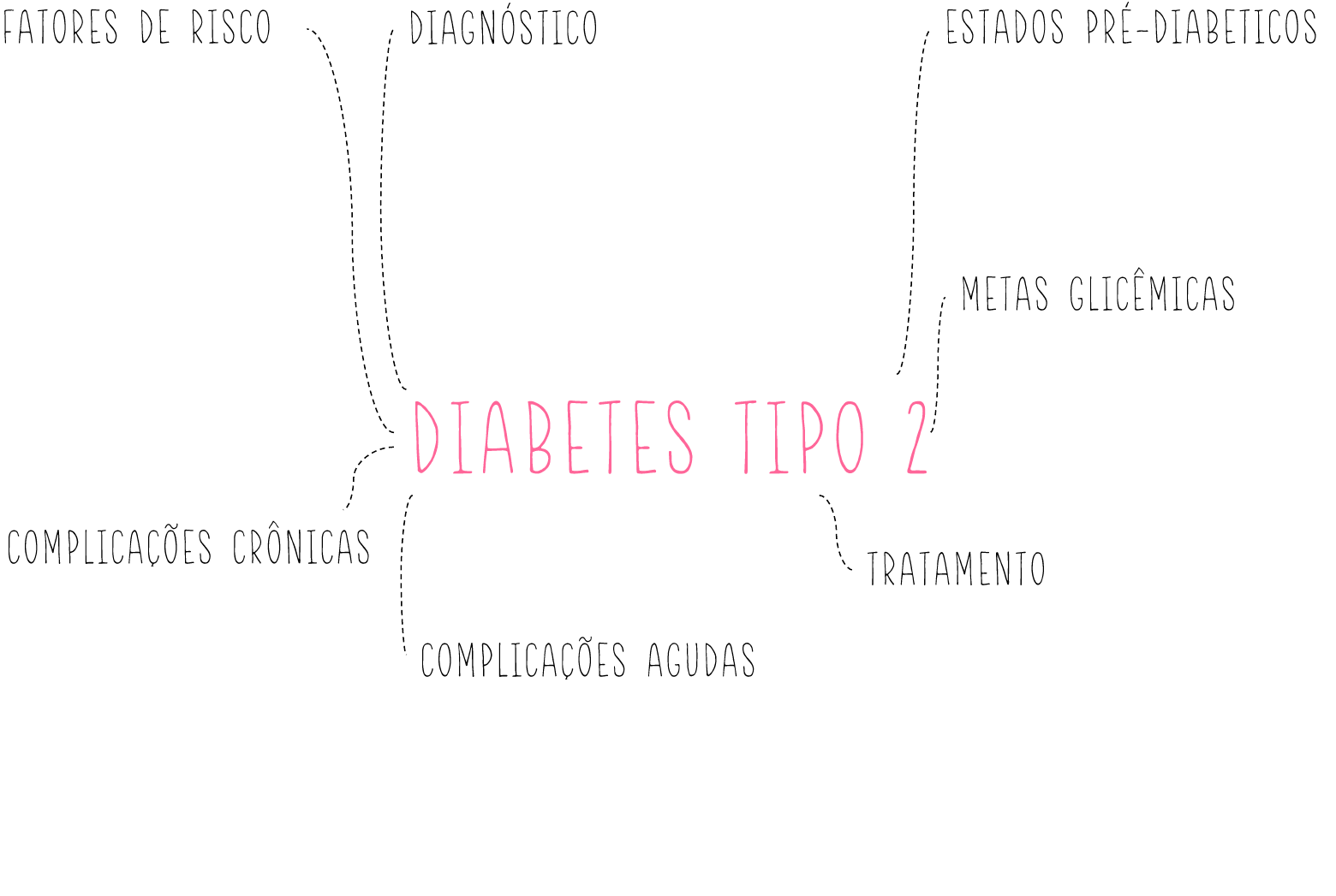 → Obesidade → Sedentarismo → HAS → HDL < 35 → Triglicerídeos > 250 → História de diabetes gestacional → Parente de 1º grau acometido → Etnia (negros, índios) → Estados pré-diabéticos → Síndrome dos ovários policísticos → Acantose nigricans → Glicemia de jejum ≥ 126 ou → Hemoglobina glicada ≥ 6,5% ou → Glicemia ocasional ≥ 200 com sintomas de hiperglicemia (poliuria, polidipsia) ou → Glicemia 2 horas após TOTG ≥ 200 → Glicemia de jejum entre 100 e 125 → Hb glicada entre 5,7 e 6,4% → Glicemia 2 h após TOTG entre 140 e 199 (intolerância à glicose) → Hb glicada < 7% → Glicemia capilar jejum entre 80- 130 → Glicemia pós-prandial < 180 → A meta varia de acordo com cada paciente → Retinopatia diabética: RD não proliferativa, RD, proliferativa e maculopatia diabética. Realizar fundoscopia no diagnóstico. Com retinopatia: repetir semestralmente. Sem retinopatia: anualmente. → Nefropatia → Neuropatia → → Pé diabético = vasculopatia + neuropatia com ou sem infecção. → Hipoglicemia: complicação mais frequente do tratamento. Bioquimicamente, a hipoglicemia corresponde a valores < 50 -54. Mas pode haver sintomas com valores < 70. Pode ser grave, sintomática, assintomática, relativa ou provável. → Cetoacidose diabética: complicação mais grave mas rara. Marcada por 3 achados: hiperglicemia, cetonemia e acidose metabólica com ânion-gap elevado. → Dieta + exercício físico + fármacos