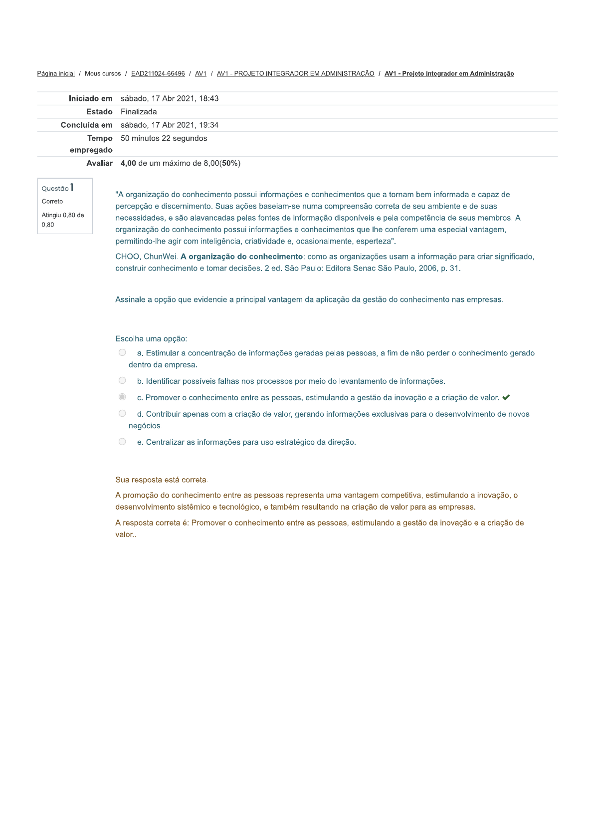 18/04/2021 AV1 - Projeto Integrador em Administração https://ava.unicarioca.edu.br/ead/mod/quiz/review.php?attempt=1184960&cmid=141719 1/7 Página inicial / Meus cursos / EAD211024-66496 / AV1 / AV1 - PROJETO INTEGRADOR EM ADMINISTRAÇÃO / AV1 - Projeto Integrador em Administração Questão 1 Correto Atingiu 0,80 de 0,80 Iniciado em sábado, 17 Abr 2021, 14:36 Estado Finalizada Concluída em sábado, 17 Abr 2021, 15:03 Tempo empregado 27 minutos 34 segundos Avaliar 5,60 de um máximo de 8,00(70%) As empresas buscam utilizar os modelos de gestão mais adequados às suas realidades, onde o profissional responsável pela área – enquadrado diante da sua legitimidade como chefe – deve exercer poder perante os que estão abaixo da hierarquia. Cabe aos subordinados aceitarem as diretrizes e indicações do gestor e realizarem as atividades de modo a buscar os resultados esperados. Considerando as diferentes posições de hierarquia, qual dos tipos existentes é identificado por este conceito? Escolha uma opção: a. Representação. b. Verticalização. c. Formalização. d. Estrutura organizacional. e. Horizontalização. Sua resposta está correta. A resposta correta é: Verticalização.. https://ava.unicarioca.edu.br/ead/ https://ava.unicarioca.edu.br/ead/course/view.php?id=1036 https://ava.unicarioca.edu.br/ead/course/view.php?id=1036§ionid=37534#section-14 https://ava.unicarioca.edu.br/ead/course/view.php?id=1036§ionid=37534#section-15 https://ava.unicarioca.edu.br/ead/mod/quiz/view.php?id=141719 18/04/2021 AV1 - Projeto Integrador em Administração https://ava.unicarioca.edu.br/ead/mod/quiz/review.php?attempt=1184960&cmid=141719 2/7 Questão 2 Correto Atingiu 0,80 de 0,80 A departamentalização forma os setores, ou divisões de trabalho e funções especializadas dentro da estrutura organizacional. Existem diversos departamentos na empresa e todos têm sua importância, além de se integrarem para a realização dos processos. Um exemplo de departamento é o financeiro, responsável pela análise e disponibilização dos recursos financeiros da empresa. De acordo com os tipos de departamentalização, relacione os tipos apresentados a seguir com suas principais características. I. Processos ( ) É formado de acordo com o tipo de cliente. II. Funcional ( ) Estão espalhados em regiões. III. Clientes ( ) Condução por duas ou mais linhas de comando. IV. Matricial ( ) Se constituem perante as etapas de um processo. V. Territorial ( ) É determinada pelas funções exercidas. Agora, assinale a opção que apresenta a sequência correta. Escolha uma opção: a. V – IV – III - II – I. b. III – IV - I - V – II. c. I – III - IV - II – V. d. III – V – IV – I – II. e. V – I – IV - III –II. Sua resposta está correta. A departamentalização por processos considera que os departamentos se constituam perante as etapas de um processo; o tipo funcional é determinado pelas funções exercidas que compõem uma área; por clientes representa a área que condiz com o perfil dos clientes, o matricial consiste na condução de setores por duas ou mais linhas de comando; e no tipo territorial os departamentos podem estar presentes em regiões diferentes, como uma empresa que possui matriz em um estado e a filial se encontra em outro. A resposta correta é: III – V – IV – I – II.. 18/04/2021 AV1 - Projeto Integrador em Administração https://ava.unicarioca.edu.br/ead/mod/quiz/review.php?attempt=1184960&cmid=141719 3/7 Questão 3 Incorreto Atingiu 0,00 de 0,80 Questão 4 Correto Atingiu 0,80 de 0,80 As empresas buscam adaptar-se ao mercado de forma cada vez mais eficiente, mas para isso, é necessário se moldar a um modelo de processo que represente adequadamente seus objetivos. Não existe um único modelo a ser implantado, e por isso, as organizações preferem não ter uma única opção, mas desenvolver várias estratégias e flexibilizar suas atividades para atender às expectativas. FONTANA, Rafaela Mantovani; IAROZINSKI Neto, Alfredo. Uma abordagem sistêmica da mudança organizacional gerada na implantação de sistemas integrados de gestão da produção. In: XIII SIMPEP, 6/8 nov. 2006, Bauru (SP). Anais... Bauru: Unesp, 2006. Considerando as teorias existentes na área, qual delas é identificada diante deste conceito? Escolha a opção que responde corretamente à questão. Escolha uma opção: a. Teoria da Contingência. b. Teoria da Organização. c. Teoria da Flexibilidade. d. Teoria da Mudança. e. Teoria dos Processos. Sua resposta está incorreta. A resposta correta é: Teoria da Contingência.. A cultura de uma empresa serve como base para sua sobrevivência no mercado, já que provém um fortalecimento em suas ações com o ambiente estratégico e a organização de seus procedimentos, mas depende antes de tudo da gestão e do comportamento de seus líderes e liderados. Se a empresa tiver uma cultura fraca, consequentemente os indícios de perdas e até fracasso são mais incidentes. De acordo com os elementos da cultura organizacional, relacione os exemplos apresentados com suas principais características. I. Símbolos. ( ) A relação efetiva entre dois funcionários. II. Heróis. ( ) A realização de reuniões toda sexta-feira. III. Tabus. ( ) A imagem do logotipo da empresa. IV. Hábitos. ( ) A linguagem formal na interação dos membros. V. Comunicação. ( ) Um líder reconhecido por seus esforços. Agora, assinale a opção que apresenta a sequência correta. Escolha uma opção: a. V – IV – III - II – I. b. I – III - IV - II – V. c. V – I – IV - III –II. d. III – IV - I - V – II. e. III – IV – V – I – II. Sua resposta está correta. A resposta correta é: III – IV - I - V – II.. 18/04/2021 AV1 - Projeto Integrador em Administração https://ava.unicarioca.edu.br/ead/mod/quiz/review.php?attempt=1184960&cmid=141719 4/7 Questão 5 Correto Atingiu 0,80 de 0,80 Questão 6 Correto Atingiu 0,80 de 0,80 