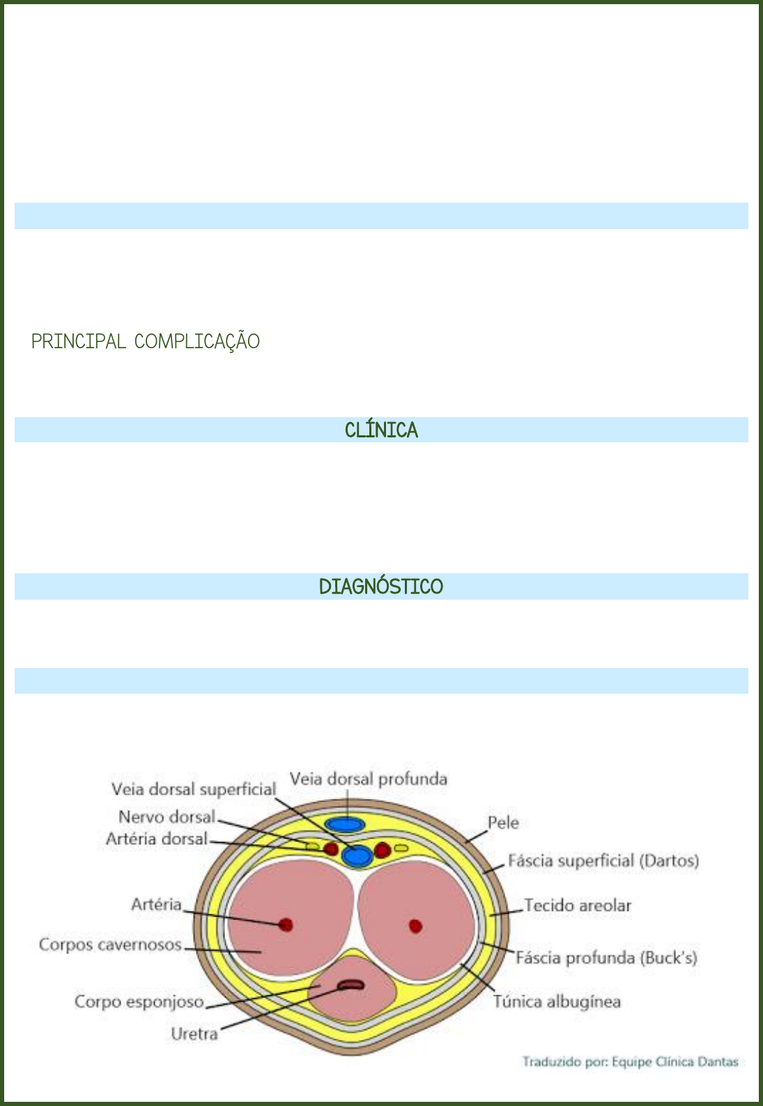 LUÍSA BOMBASSARO – MED UFR – T4 Trauma De Pênis ETIOLOGIA - Resulta da ruptura da túnica albugínea de 1 ou ambos corpos cavernosos - A principal causa é por intercurso sexual. - Mais raro: autopunição, ferimentos penetrantes e mordeduras de animais. - PRINCIPAL COMPLICAÇÃO: disfunção erétil, secundária à fibrose da túnica albugínea e perda do mecanismo veno-oclusivo. CLÍNICA - dor aguda seguida de perda súbita da ereção e edema/hematoma volumosos - muito comum: relato de “estalido” – rotura da túnica albugínea. - se tiver rotura da uretra: uretrorragia. DIAGNÓSTICO - clínico, não precisa de exame complementar TRATAMENTO - Cirúrgico – incisão subcoronal; desenluvamento peniano; rafia da túnica albugínea. User Comentário do texto penis em berinjela User Comentário do texto USG do pênis User Comentário do texto SEGUNDO O EDUARDO É DOENÇA DE PERONI - penis fica curvo