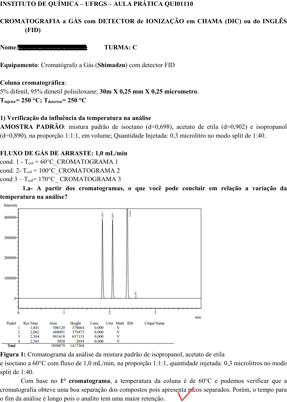 INSTITUTO DE QUÍMICA – UFRGS – AULA PRÁTICA QUI01110 CROMATOGRAFIA a GÁS com DETECTOR de IONIZAÇÃO em CHAMA (DIC) ou do INGLÊS (FID) Nome: Natiele Reis Packowski TURMA: C Equipamento: Cromatógrafo a Gás (Shimadzu) com detector FID Coluna cromatográfica: 5% difenil, 95% dimetil polisiloxane; 30m X 0,25 mm X 0,25 micrometro. Tinjetor= 250 °C; Tdetector= 250 °C 1) Verificação da influência da temperatura na análise AMOSTRA PADRÃO: mistura padrão de isoctano (d=0,698), acetato de etila (d=0,902) e isopropanol (d=0,890), na proporção 1:1:1, em volume; Quantidade Injetada: 0,3 microlitro no modo split de 1:40. FLUXO DE GÁS DE ARRASTE: 1,0 mL/min cond. 1 - Tcol = 60°C_CROMATOGRAMA 1 cond. 2- Tcol = 100°C_CROMATOGRAMA 2 cond 3 – Tcol= 170°C_ CROMATOGRAMA 3 1.a- A partir dos cromatogramas, o que você pode concluir em relação a variação da temperatura na análise? Figura 1: Cromatograma da análise da mistura padrão de isopropanol, acetato de etila e isoctano a 60°C com fluxo de 1,0 mL/min, na proporção 1:1:1, quantidade injetada: 0,3 microlitros no modo split de 1:40. Com base no 1° cromatograma, a temperatura da coluna é de 60°C e podemos verificar que a cromatografia obteve uma boa separação dos compostos pois apresenta picos separados. Porém, o tempo para o fim da análise é longo pois o analito tem uma maior retenção. Figura 2: Cromatograma da análise da mistura padrão de isopropanol, acetato de etila e isoctano a 100°C com fluxo de 1,0 mL/min, na proporção 1:1:1, quantidade injetada: 0,3 microlitros no modo split de 1:40. No 2° cromatograma, a temperatura da coluna é de 100°C e comparado com o 1° cromatograma possui uma melhor separação dos compostos e a retenção do analito foi menor, tornando a análise mais rápida. Figura 3: Cromatograma da análise da mistura padrão de isopropanol, acetato de etila e isoctano a 170°C com fluxo de 1,0 mL/min, na proporção 1:1:1, quantidade injetada: 0,3 microlitros no modo split de 1:40. O 3° cromatograma apresente a temperatura mais elevada, 170°C. Essa temperatura elevada gera como consequência uma dificil separação dos compostos (coeluição dos compostos), como pode ser observado, os picos do cromatograma saem juntos. Essa análise, apesar de ser mais rápida não é eficiente pois as amostras eluem juntas e como chegam ao detector no mesmo tempo, os picos gerados são sobrepostos. Quando a temperatura é elevada, o tempo de retenção dos compostos reduz pois ocorre um aumento na vibração das moléculas influenciada pelo aquecimento. Esse processo faz com que a interação com a fase estacionária diminua e a passagem do analito para fase gasosa seja favorecida. 2) Influência do gás de arraste a- utilizando a melhor condição de T do forno (100°C- CROMATOGRAMA 2) faça uma corrida com FLUXO =1,5 mL min-1 na coluna. – CROMATOGRAMA 4 2.a - A partir dos cromatogramas, qual a sua conclusão? Com um aumento do fluxo, na melhor condição de temperatura (100°C), o tempo de retenção dos compostos é menor e os picos se formam mais rapidamente e são melhor definidos e isso mostra que ocorreu uma boa separação dos compostos, não houve alteração da resolução da análise. Já era esperado um aumento na velocidade da analise pois os analitos irão interagir menos com a fase estacionária da coluna e irão passar mais rápido por ela, logo, o tempo da corrida da amostra será reduzido. Como não ocorreu a coeluição dos analitos, significa que aumentando o fluxo da análise a eficiência da cromatografia também aumentou. 3) determinação do tempo morto 3.a - a partir do cromatograma de melhor condição de T (100°C) e fluxo na coluna de 1,5 mL/min, determinar o tempo morto com o solvente metanol. CROMATOGRAMA 5 De acordo com o cromatograma 5, o ponto morto é 1,265min, pois esse ponto é o tempo em que ocorre a primeira detecção do solvente que não interage com a fase estacionária da coluna de cromatografia. 3.b- calcular o tempo de retenção corrigido para o composto isopropanol na melhor condição de análise. Melhor condição de análise: fluxo de gás de arraste de 1,5 mL/min numa temperatura de 100°C. Tr’ = Tr – Tm Tr’ = 1,283 - 1,265 Tr’ = 0, 018 min 4)A partir do cromatograma do padrão (CROMATOGRAMA 4) e da amostra problema (CROMATOGRAMA 6), bem como da informação sobre o padrão NO ITEM 1, construa uma tabela com os dados EXPERIMENTAIS. Calcule: 4.a – determine o fator de resposta para cada componente da amostra, na melhor condição de análise, utilizando como composto de referência o ACETATO DE ETILA. Massa = densidade x volume ------ densidade = massa fisopropanol = mi x fref x Aref mref x Ai fisopropanol = 0,890mg . 1 . 506867cm2 0,902mg . 520113cm2 fisopropanol = 0,96 fisoctano = mi x fref x Aref mref x Ai fisoctano = 0,698mg . 1 . 506867cm2 0,902mg . 952312cm2 fisoctano = 0,41 3.1 Analito Área Padrão (cm2) Massa Padrão (mg) Área da Amostra (cm2) Fi Área Corrigida %Analito Isopropanol 520113 0,890 397969 0,96 382050,24 cm2 28,71 Acetato de etila 506867 0,902 444313 1 444313 cm2 33,39 Isoctano 952312 0,698 1229803 0,41 504219,23 cm2 37,89 TOTAL 1330582,47 cm2 100 4.b - Determine a concentração em % em concentração pelo método quantitativo de Normalização Interna do isopropanol, do isoctano e do acetato de etila em uma amostra de concentração desconhecida, através do cromatograma na melhor condição de análise. Área corrigida = área da amostra cm2 x Fi Isopropanol: 397969 cm2 x 0,96 = 382050,24 cm2 Acetato de etila = 444313 cm2 x 1 = 444313 cm2 Isoctano = 1229803 cm2 x 0,41 = 504219,23 cm2 Soma total das áreas corrigidas = 1330582,47 cm2 % Analito = Acorrigida x 100 ATOTAL % isopropanol = 382050,24/1330582,47 x 100 = 28,71% % acetato de etila = 444313/1330582,47 x 100 = 33,39% % isoctano = 504219,23/1330582,47 x 100 = 37,89% 5.0 Responda as questões 5.1 – Um analista estabeleceu as seguintes condições para a análi