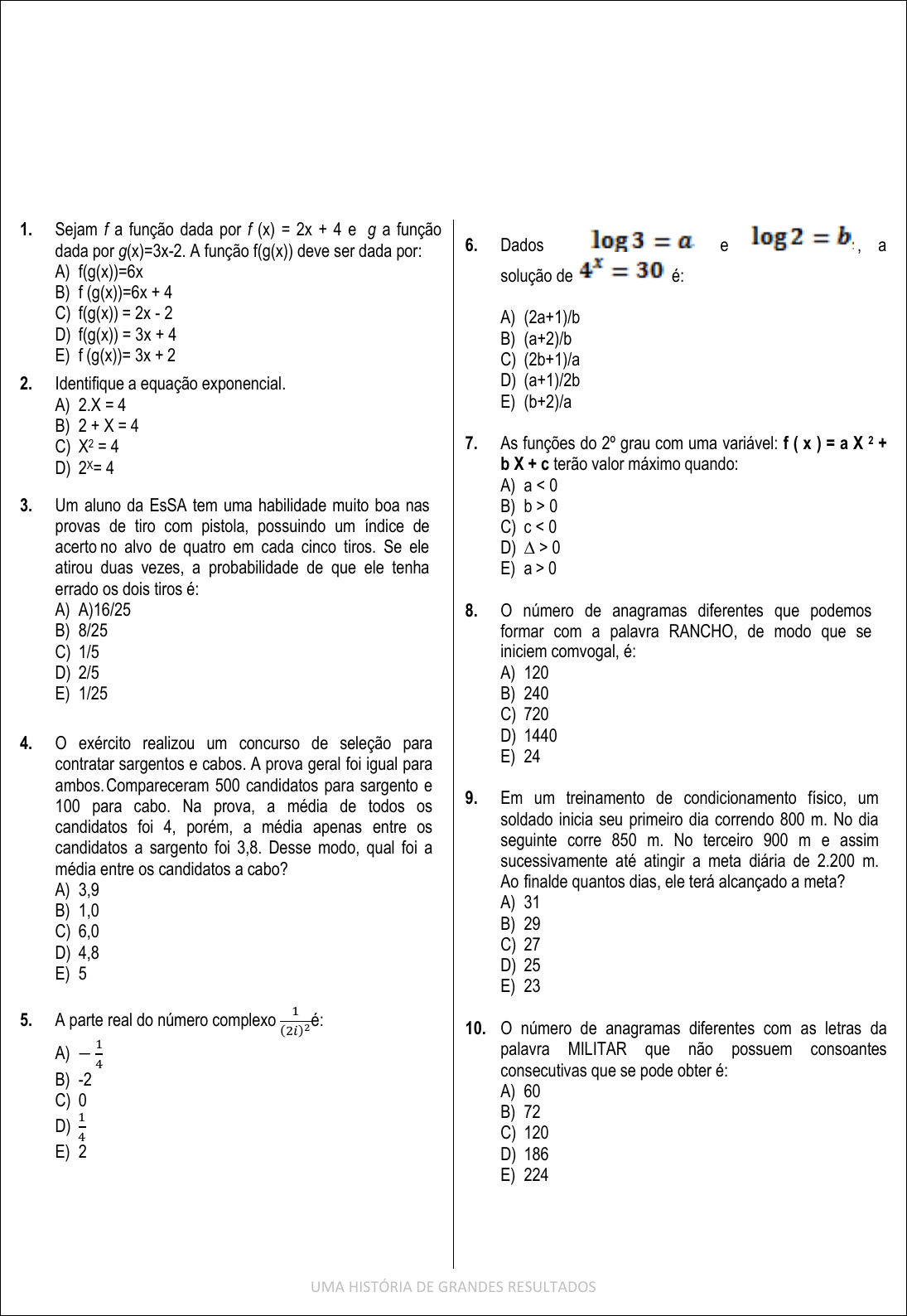 UMA HISTÓRIA DE GRANDES RESULTADOS Limoeiro, ............ de ................ de 2021 FICHA - PRÉ-MILITAR AFA – EFOMM – EsPCEx | Paulo Bitu Aluno(a): TD 1. Sejam f a função dada por f (x) = 2x + 4 e g a função dada por g(x)=3x-2. A função f(g(x)) deve ser dada por: A) f(g(x))=6x B) f (g(x))=6x + 4 C) f(g(x)) = 2x - 2 D) f(g(x)) = 3x + 4 E) f (g(x))= 3x + 2 2. Identifique a equação exponencial. A) 2.X = 4 B) 2 + X = 4 C) X2 = 4 D) 2X= 4 3. Um aluno da EsSA tem uma habilidade muito boa nas provas de tiro com pistola, possuindo um índice de acerto no alvo de quatro em cada cinco tiros. Se ele atirou duas vezes, a probabilidade de que ele tenha errado os dois tiros é: A) A)16/25 B) 8/25 C) 1/5 D) 2/5 E) 1/25 4. O exército realizou um concurso de seleção para contratar sargentos e cabos. A prova geral foi igual para ambos. Compareceram 500 candidatos para sargento e 100 para cabo. Na prova, a média de todos os candidatos foi 4, porém, a média apenas entre os candidatos a sargento foi 3,8. Desse modo, qual foi a média entre os candidatos a cabo? A) 3,9 B) 1,0 C) 6,0 D) 4,8 E) 5 5. A parte real do número complexo 1 (2𝑖)2 é: A) − 1 4 B) -2 C) 0 D) 1 4 E) 2 6. Dados e , a solução de é: A) (2a+1)/b B) (a+2)/b C) (2b+1)/a D) (a+1)/2b E) (b+2)/a 7. As funções do 2º grau com uma variável: f ( x ) = a X 2 + b X + c terão valor máximo quando : A) a < 0 B) b > 0 C) c < 0 D) ∆ > 0 E) a > 0 8. O número de anagramas diferentes que podemos formar com a palavra RANCHO, de modo que se iniciem com vogal, é: A) 120 B) 240 C) 720 D) 1440 E) 24 9. Em um treinamento de condicionamento físico, um soldado inicia seu primeiro dia correndo 800 m. No dia seguinte corre 850 m. No terceiro 900 m e assim sucessivamente até atingir a meta diária de 2.200 m. Ao final de quantos dias, ele terá alcançado a meta? A) 31 B) 29 C) 27 D) 25 E) 23 10. O número de anagramas diferentes com as letras da palavra MILITAR que não possuem consoantes consecutivas que se pode obter é: A) 60 B) 72 C) 120 D) 186 E) 224 Ficha de Exercícios Militar Revisão Esa EEAr 11. A probabilidade de um jogador de futebol marcar o gol ao cobrar um pênalti, é de 80%. Se esse jogador cobrar dois pênaltis consecutivos, a probabilidade dele fazer o gol, em ambas as cobranças, é igual a: A) 16% B) 20% C) 32% D) 64% E) 80% 12. O número complexo i102, onde i representa a unidade imaginária, A) É positivo B) É imaginário puro C) Está na forma trigonométrica D) Está na forma algébrica E) É real 13. O capital, em reais, que deve ser aplicado à taxa mensal de juros simples de 5%, por 4 meses, para se obter juros de R$ 400,00 é igual a, A) 1.600,00 B) 1.800,00 C) 2.000,00 D) 2.400,00 E) 2.500,00