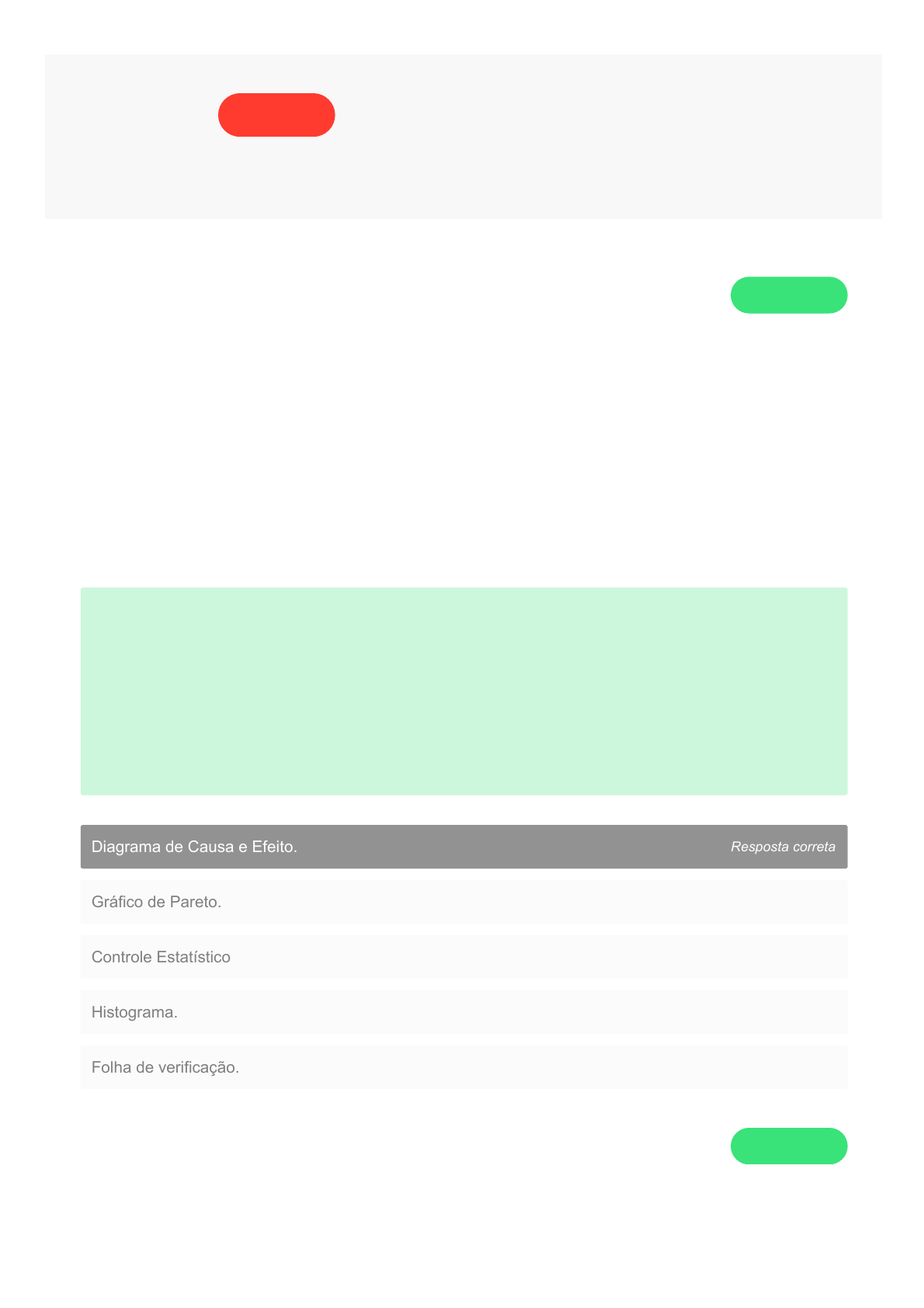 23/05/2020 Ultra https://sereduc.blackboard.com/ultra/courses/_27829_1/grades/assessment/_2147292_1/overview/attempt/_7520928_1/review?courseId=_2782… 1/8 Correta (A) Diagrama de Causa e ... Ocultar outras opções Pergunta 1 -- /0,6 No meio automotivo muitas empresas lançam novos carros que se sobrepõem aos modelos antigos. Esses novos modelos representam uma concorrência direta, estimulada pela própria empresa para os antigos. Em muitas situações esses novos produtos ganham grande parte das vendas dos produtos já existentes da mesma empresa. A empresa opta por este caminho para tentar acabar com uma vantagem competitiva obsoleta e lançar uma nova, antes que a concorrência faça isto. Uma empresa X adotou esta estratégia, entretanto, não obteve os resultados esperados. Agora ela tenta compreender os motivos que levaram ao insucesso. Qual seria a ferramenta, muito utilizada pela área da qualidade, que poderia auxiliar a empresa neste processo? Resposta corretaDiagrama de Causa e Efeito. Gráfico de Pareto. Controle Estatístico Histograma. Folha de verificação. Pergunta 2 -- /0,6 3/6 Nota final Enviado: 23/05/20 18:55 (BRT) 23/05/2020 Ultra https://sereduc.blackboard.com/ultra/courses/_27829_1/grades/assessment/_2147292_1/overview/attempt/_7520928_1/review?courseId=_2782… 2/8 Correta (C) Significa uma liderança ... Ocultar outras opções Uma empresa a fim de conhecer seu estilo de liderança submeteu sua gerência à resolução de um questionário específico sobre ações e atitudes de liderança. Ao computar os resultados, foi utilizado o “modelo do caminho” para entender o estilo da liderança na organização. A figura abaixo ilustra o modelo. O resultado obtido mostrou que seus subordinados possuem uma maturidade classificada em E3 – M3_M4. Sobre este resultado, avalie as afirmações e marque a alternativa CORRETA. GESTÃO DA QUALIDADE - SUB - 2018.1B - Q 10_v1.PNG Significa uma liderança voltada para PARTICIPAÇÃO, em que as pessoas permitem serem orientadas por um líder sem julgamentos. Significa uma liderança voltada para PERSUADIR, em que as pessoas não são capacitadas, mas têm vontade de assumir responsabilidades, necessitam ser persuadidas a se desenvolver. Resposta correta Significa uma liderança voltada para COMPARTILHAR, já que as pessoas são capacitadas mas não dispostas a fazer o que se determina, exigindo do líder um processo especial de comunicação. Significa uma liderança voltada para DELEGAR, em que as pessoas são capacitadas e dispostas a assumir responsabilidades. Significa uma liderança voltada para DETERMINAR, em que as pessoas não têm vontade ou capacidade para assumir responsabilidades e necessitam que lhes sejam determinadas suas tarefas. Pergunta 3 -- /0,6 Muitas são as contribuições de Juran para o processo evolutivo da qualidade no mundo, destacando-se o conceito de cliente e fornecedor interno e externo. Na busca por melhoria contínua da qualidade, Juran propôs três pilares que fundamentam os trabalhos das equipes na resolução de problemas (Planejamento da qualidade; Controle da qualidade; e Aperfeiçoamento da qualidade). Quais ou qual das afirmativas a seguir dizem respeito a atividades do controle da qualidade? I.Identificar necessidades dos clientes II.Definir métodos e processos de fabricação III.Avaliar a qualidade real dos produtos 23/05/2020 Ultra https://sereduc.blackboard.com/ultra/courses/_27829_1/grades/assessment/_2147292_1/overview/attempt/_7520928_1/review?courseId=_2782… 3/8 Incorreta (B) II, apenas está correta Ocultar outras opções Incorreta (D) Requisitos e Política de ... está correta Ocultar outras opções IV.Melhorar continuamente e definir responsáveis pela melhoria I e IV, apenas. Resposta corretaII, apenas. I , apenas. III e IV ,apenas. II e IV, apenas. Pergunta 4 -- /0,6 Cada vez mais as empresas buscam melhorias contínuas nos seus produtos e processos. Neste contexto, muitas implantam sistemas de gestão de qualidade a partir de algumas premissas, que são, respectivamente: Diversificação de investimento e controle de qualidade Planejamento de requisitos materiais e planejamento mestre de produção. Planejamento de fluxo caixa e planejamento de capacidade. Resposta corretaRequisitos e Política de qualidade. 23/05/2020 Ultra https://sereduc.blackboard.com/ultra/courses/_27829_1/grades/assessment/_2147292_1/overview/attempt/_7520928_1/review?courseId=_2782… 4/8 Incorreta (B) Conformidade está correta Ocultar outras opções Correta (C) Para desenvolver o ... Ocultar outras opções Registros Informais e inflexíveis. Pergunta 5 -- /0,6 A. Garvin é um dos mais recentes gurus da Qualidade. Ph.D. em economia pelo M.I.T., foi professor de Administração Empresarial em Harvard, inspetor do Prêmio de Qualidade Malcolm Baldrige e serviu na Comissão de Estudos Industriais do Conselho de Pesquisa Nacional (EUA). Além disso, tudo, também foi consultor de grandes empresas no mundo. Ele também contribuiu para o estudo da qualidade com uma classificação de oito dimensões. Qual das dimensões diz respeito a comparação das características de um produto com suas especificações de projeto? Conformidade Resposta corretaConformidade Durabilidade Qualidade percebida Confiabilidade Pergunta 6 -- /0,6 Sobre o fluxograma, podemos afirmar vários aspectos, exceto: 23/05/2020 Ultra https://sereduc.blackboard.com/ultra/courses/_27829_1/grades/assessment/_2147292_1/overview/attempt/_7520928_1/review?courseId=_2782… 5/8 Correta (D) I, II e III, apenas. ... Ocultar outras opções O fluxograma como ferramenta da qualidade permite o entendimento das etapas do processo. O fluxograma como ferramenta da qualidade permite o monitoramento de processos e atividades. Resposta correta Para desenvolver o fluxograma não é necessário compreender os autores e informações envolvidos no processo. Pelo fluxograma é possível verificar o caminho lógico de um processo. O fluxograma