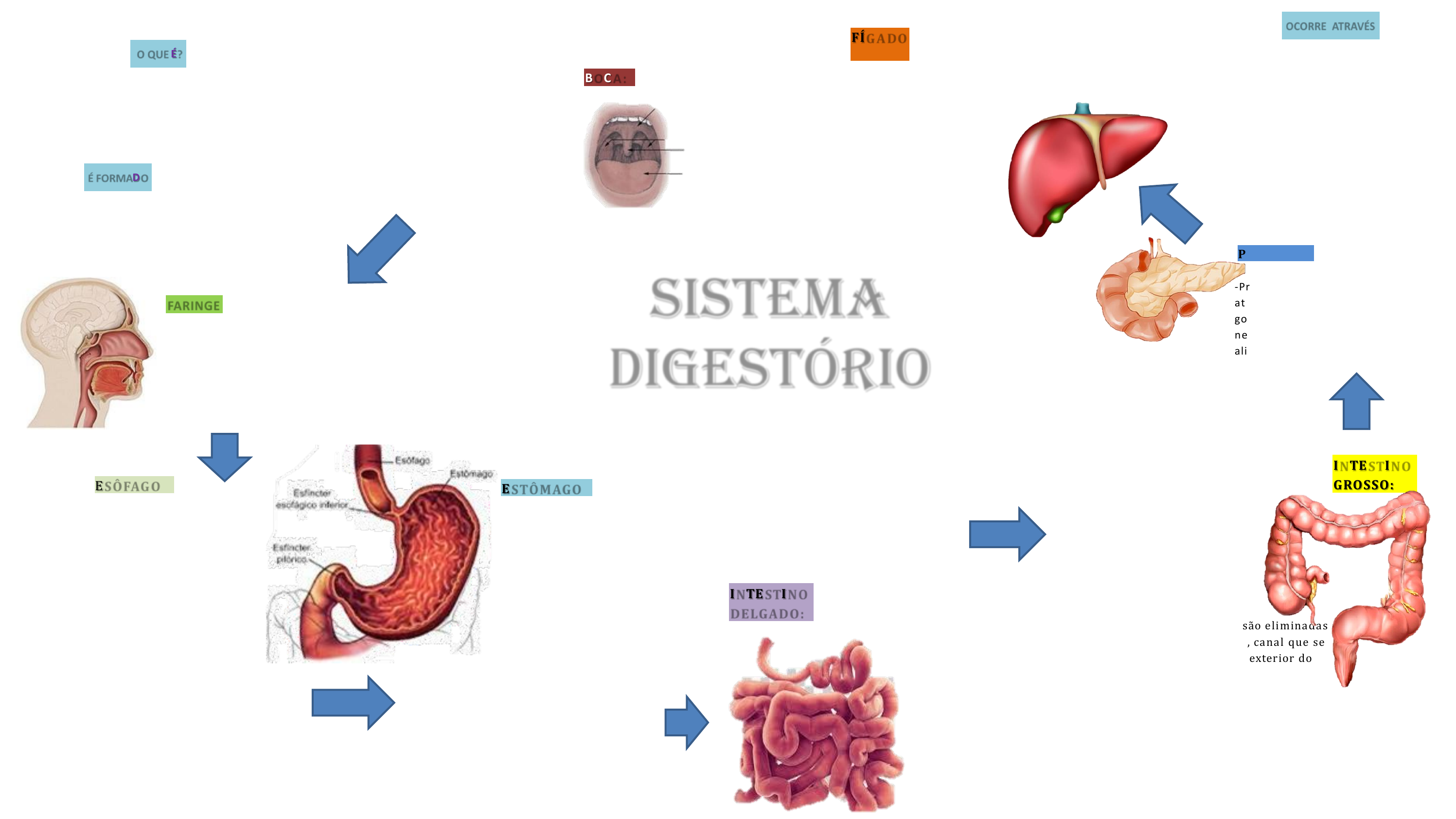 O QUE É? É o sistema responsável pela absorção dos nutrientes e pela eliminação dos excrementos. boca,faringe,esôfago,estômago ,intestino delgado, intestino grosso,glândulas anexas, fígado e pâncreas. É FORMADO Digestão mecânica: são os movimentos que reduzem as partículas de alimentos. Digestão química: são as reações químicas que alteram a composição dos alimentos. OCORRE ATRAVÉS FÍG A DO : -Produz a bile uma substância armazenada na vesícula biliar que trabalha na emulsificação da gordura. -Remove as substâncias tóxicas do sangue como o álcool. INTESTINO DELGADO: -Ao sair do estômago, após a digestão o bolo alimentar é chamado de quimo. -È responsável pelo fim da digestão química e pela absor- ção dos nutrientes. -É dividido entre: Duodeno: principal local, aonde ocorre 90% da absorção. nele é lançado as secreções do fígado e pâncreas. Jejuno e íleo: ao longo dessas duas regiões a digestão continua e grande parte dos nutrientes é absorvida pelo sangue. Sistema digestório INTESTINO GROSSO: -Sua principal função é a reabsorção da água e sais minerais, além da eliminação das fezes. -É dividida por três regiões: Ceco: encontra-se o apêndice , u m órgão vestigial Cólon: maior parte do intestino grosso, nela ocorre o processo de reabsorção e possui a microbiota intestinal (flora intestinal) estas bactérias protegem o corpo contra organismos causadores de doenças. Reto: as fezes são eliminadas através do reto, canal que se estende para o exterior do corpo (ânus) BOCA: -Na boca ocorre tanto o processo mecânico através da mastigação, quando o químico através da insalivação. -A partir da enzima amilase salivar ocorre o processo de transformação dos carboidratos em glicose. -Os dentes e a língua também nesse cesso. PÂN C REAS: -Produz o suco pancreático que atua na digestão de proteínas, gorduras e carboidratos, além de neutralizar a acidez do quimo (bolo alimentar). ESÔFAG O : -É u m tubo, por onde os alimentos são empurrados através de movimentos involuntários realizados pelos músculos não estriados. -Movimentos peristálticos: possibilitam a passagem do bolo alimentar para o estômago. ESTÔMAGO : -Armazena todo o bolo alimentar após a refeição. -Ao chegar no estômago, o bolo alimentar sofre ação do suco gástrico (ácido) iniciando a digestão das proteínas através da enzima pepsina. -Células da mucosa gástrica produzem uma espécie de muco que protege as paredes estomacais do efeito do ácido, entretanto algumas substancias podem romper essa proteção e causar feridas ou inflamações no estômago. -A faringe é u m órgão que fa tanto do sistema digestório q do sistema respiratório. -Tem a função de ligar a boca esôfago e permitir a passagem ar inalado. FARINGE L&A