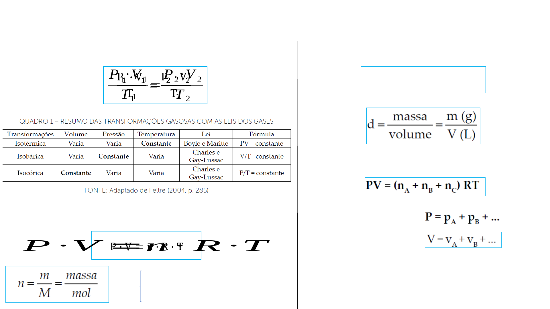 Equação Geral dos Gases Equação Clapeyron Revisão Geral e formulas Princípio de Avogadro Misturas Gasosas Lei de Dalton Lei de Amagat Lei de Graham As velocidades de efusão de dois gases serão inversamente proporcionais às raízes quadradas de suas densidades absolutas Vm = 22,4 L/mol (CNTP) 8,02574 x 10-2 L.atm.K-1.mol-1 8,31447 x 10-2 L.bar.K-1.mol-1 R= Trabalho Trabalho de Expansão 1 L.atm = 101,325 J Calor Revisão Geral e formulas Primeira Lei da Termodinâmica ΔU – será positivo, se a temperatura do sistema aumentar; ΔU – será negativo, se a temperatura do sistema diminuir; Q – será positivo, se o sistema absorver calor do meio externo; Q – será negativo, se o sistema ceder calor ao meio externo; Ƭ – será positivo, se o sistema se expandir, realizando trabalho sobre o meio externo; Ƭ – será negativo, se o sistema se contrair, recebendo trabalho do meio externo. Q - Ƭ A energia interna de um sistema isolado é constante Entalpia Lei de Hess Revisão Geral e formulas Entalpia de ligação ENTROPIA A entropia do universo tende a aumentar. (Segunda lei da termodinâmica) Terceira lei da termodinâmica A entropia de uma substância na forma de um cristal perfeito é igual a zero, quando a temperatura é igual a zero (T = 0). H = U + PV Equações das etapas intermediárias de uma reação podem ser combinadas para fornecer a equação termoquímica global. ΔS = n • R • ENERGIA LIVRE DE GIBBS Solução LEI DE RAOULT Revisão Geral e formulas LEI DE HENRY A pressão de vapor de um soluto volátil B é proporcional à sua fração molar na solução ΔG = ΔH – TΔS PROPRIEDADES COLIGATIVAS Tonoscopia ou tonometria; Abaixamento da pressão de vapor) Ebulioscopia ou ebuliometria; (Elevação da temperatura de ebulição) Crioscopia ou criometria; ( Diminuição da temperatura de congelamento) Osmose. (Mais diluído para o meio menos diluído) Muitos estudiosos analisaram experimentalmente as transformações físicas sofridas pelos gases e, através de suas observações formularam leis relacionadas às variáveis de estado. Considere o seguinte exemplo: um recipiente com êmbolo móvel, o qual desliza sem atrito, é capaz de armazenar 30 L de O2 sob pressão de 180 kPa a 298 K. Ao reduzir a pressão para 80 kPa, mantendo a mesma temperatura, ocorre um aumento no volume ocupado pelo gás. Com base neste exemplo, avalie as seguintes asserções e a relação proposta entre elas: I- O exemplo refere-se à Lei de Charles e Gay - Lussac. PORQUE II- A temperatura permanece constante, ocorrendo variação na pressão e no volume. Questão 1 Equação geral Resposta: II verdade O estado gasoso, estado termodinâmico mais simples da matéria, apresenta movimento desordenado colidindo entre si ou com as paredes do recipiente. Para caracterizar o estado de um gás, é necessário relacionar entre si grandezas físicas, chamadas de variáveis de estado. Considerando as variáveis de estado, classifique V para as sentenças verdadeiras e F para as falsas: ( ) O volume de um gás não será o volume do próprio recipiente em que está armazenado. ( ) A pressão de um gás é definida pelas colisões das moléculas gasosas com as paredes do recipiente em que está contido. ( ) A temperatura é inversamente proporcional à energia cinética de suas moléculas. ( ) o número de moles (n) é o quociente entre a massa (m) e a massa molar (M). Questão 2 Equação geral Resposta: F V F V A atividade de mergulho proporciona novas e belas experiências, pois as pessoas são capazes de explorar novos ambientes repletos de cores, texturas e diferentes criaturas, bem como se conectar com a natureza. Considere uma pessoa que ao nível do mar inala 4 L de ar por minuto a uma temperatura de 25 °C. Se ao mergulhar em uma profundidade de 32 m, onde a pressão é de 5 atm e mesma temperatura de 25 °C, qual será o volume de ar que será inalado por essa pessoa? Questão 3 Transformação isotérmica Resposta: 0,8L A teoria cinética e as leis dos gases consideram modelos de gases perfeitos ou ideais. Logo, para facilitar o estudo dos gases a partir da variação das grandezas físicas, surgiu a equação geral dos gases. Sendo assim, considere o exemplo: uma amostra de O2(g) armazenada em um recipiente de 20 mL a 127 °C e 600 mmHg. O que acontece com o volume ocupado pelo gás se a temperatura passar para 0 °C e 819 mmHg? I- O volume será menor, pois ocorre aumento na pressão e abaixamento da temperatura. II- O volume não sofrerá alteração, pois a variação na pressão e temperatura não alteram o volume de um gás. III- O volume será maior, pois ocorre aumento na pressão e abaixamento da temperatura. Questão 4 Equação geral Resposta:, 10mL. A determinada massa de gás. Considere que um mol de certo transformações isotérmicas, isobáricas e isocóricas são mudanças sofridas por uma gás sofre uma transformação cíclica, como é apresentado no gráfico anexo. Com base no gráfico e no exposto, analise as sentenças a seguir: I- A transformação A é isobárica. II- A transformação B é isotérmica. III- A transformação C é isocórica. Questão 5 Gráfico Resposta: I, II, III A equação de Claperyon é uma equação de estado que resume o comportamento de um gás ideal a mudanças de temperatura, pressão, volume e quantidade de matéria. Se um balão contém 44 gramas de gás hélio, em um dia com temperatura de 32 °C e apresenta uma pressão de 2,5 atm, qual seria o volume desse balão? Considerando a equação de Claperyon e o exemplo apresentado, classifique V para as sentenças verdadeiras e F para as falsas: ( ) O volume do balão será de 120 L. ( ) Deve-se utilizar a seguinte fórmula: V = mRT/MP. ( ) O volume do balão será 22,4 L. ( ) A constante dos gases a ser utilizada deve ser: 0,082 atm.L.mol-1.K-1. Questão 6 Equação de Claperyon Resposta: FVFV O gráfico do diagrama de fases mostra as fases mais estáveis em pressões e temperaturas