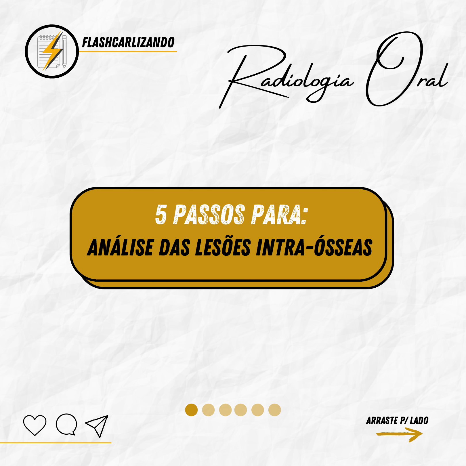 ARRASTE P/ LADO FLASHcarlizando Análise das Lesões Intra-ósseas 5 passos para: Radiologia Oral qual posição nos ossos maxilares? tem evolvimento com tecido mole? Se o epicentro da lesão é coronal ao dente, a lesão provavelmente é composta de epitélio odontogênico ARRASTE P/ LADO FLASHcarlizando localizar a anomalia 1° passo: É localizada ou generalizada? se sim...é uni ou bilateral?1 2 exemplo: única ou multifocal? 3 Uma lesão pode ter uma forma específica ou pode ser irregular. lesões com bordas definidas e periferia corticalizada, é observado nos odontomas e cistos periapicais ARRASTE P/ LADO FLASHcarlizando avalie periferia e forma 2° passo a periferia é bem definida ou mal definida?1 2 exemplo: é totalmente radiopaca? Um interior radiolucido é comum nos cistos e um interior totalmente radiopaco é observado nos osteomas. ARRASTE P/ LADO FLASHcarlizando avalie estrutura interna 3° passo é totalmente radiolucida?1 2 exemplo: ou é mista?3 tem reabsorção de raiz? qual o estado da lâmina dura? lesões malignas podem levar em um espessamento irregular e destruição da lâmina dura exsudato de uma lesão inflamatória pode estimular o periósteo a depositar osso neoformado em região de cortical. ARRASTE P/ LADO FLASHcarlizando efeitos em estruturas adjacentes 4° passo tem deslocamento dentário? 1 2 exemplo: 3 avaliar o estado da cortical óssea ARRASTE P/ LADO FLASHcarlizando fornecer a interpretação radiográfica 5° passo