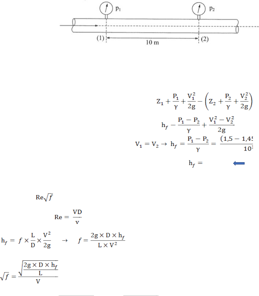 Planilha1 ALUNO: José Antônio Pinheiro Júnior MATRÍCULA: 01341238 CURSO: ENGENHARIA CIVIL - EAD Sendo assim, com base em todo o conteúdo estudado, considere um conduto de ferro fundido, sendo D = 10 cm e j = 0,7* 10⁻⁶m2/s, sabendo-se que há dois manômetros instalados a uma distância de 10 m, que indicam, respectivamente, 0,15 Mpa e 0,145 Mpa. Demonstre, através de cálculos em uma planilha de Excel, a vazão da água nesse conduto; o diagrama utilizado, comente como chegou ao resultado e cite exemplos práticos sobre perdas de carga. P1= 0,15 Mpa = 1,5 x 104 kgf/m2 Bernoulli: P2= 0,145 Mpa = 1,45 x 104 kgf/m2 H1 = H2 + HP1,2 → (HP1,2 = hf) g = 103 kgf/m3 K = 25,9 x 10-5 m. Logo: 0.50 m Clique no valor para ver a fórmula Cálculo de 0.000000045 =4,5x10⁴ Clique no valor para ver a fórmula Cálculo de 386.10 Clique no valor para ver a fórmula Cálculo de V e Q 1.96 m/s Clique no valor para ver a fórmula Ou 1.92 m/s Clique no valor para ver a fórmula 15.1 L/s Clique no valor para ver a fórmula REFERÊNCIA https://edisciplinas.usp.br/pluginfile.php/2089883/mod_resource/content/3/PME3230-RL-Escoamento_Turbulento-Medidores_Vazao.pdf