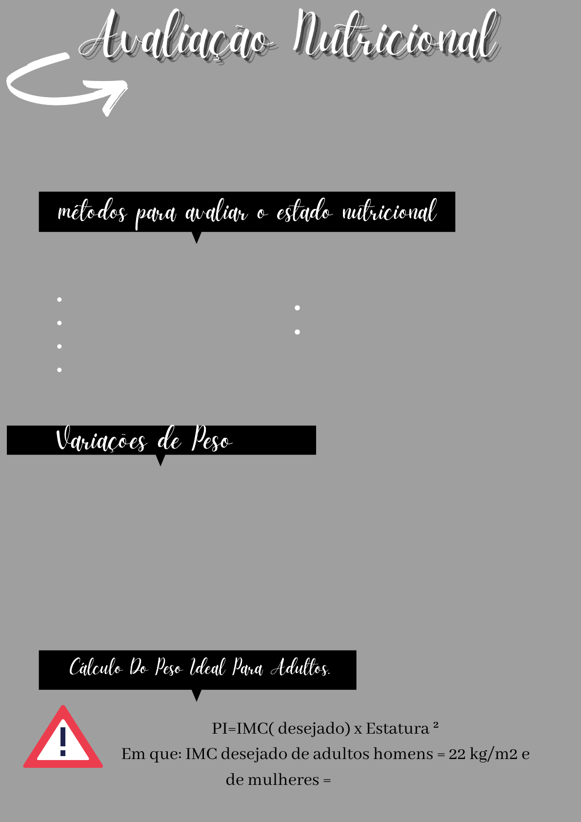 Resolução 63/00 Anvisa : Função do nutricionista ; Realizar avaliação do estado nutricional do paciente, utilizando indicadores nutricionais subjetivos e objetivos, com base no protocolo preestabelecido ,de modo de identificar o risco ou deficiência nutricional e adequar a prescrição dietética . Peso Atual : Reflete a medida de peso obtida no momento do exame . Peso Usual ou Habitual : Peso que o paciente costuma ter ou quando não é possível verificar utiliza o peso mais recente. Peso Ideal : Peso Adequado para o individuo em relação a sua estrutura, gênero e idade. Antropometria Composição Corporal Parâmetros Bioquímicos Consumo Alimentar métodos objetivos História Clínica Exame Físico Métodos Subjetivos métodos para avaliar o estado nutricional Variações de Peso Cálculo Do Peso Ideal Para Adultos. PI=IMC( desejado) x Estatura ² Em que: IMC desejado de adultos homens = 22 kg/m2 e de mulheres = 20,8kg/m2 . Cálculo do peso ideal para idosos Deve-se utilizar o percentil 50, conforme a Tabela , e multiplicar pela altura ao quadrado: PI = Percentil 50 × A2 Equação de estimativa de altura através da altura do joelho (25-60 anos) Altura (branco/homem) = 71,85 + (1,88 x AJ) Altura (negro/homem) = 73,42 + (1,79 x AJ) Altura (branca/mulher) = 70,25 + (1,87 x AJ) – (0,06 x idade em anos) Altura (negra/mulher) = 68,10 + (1,86 x AJ) – (0,06 x idade em anos) Fonte: LOHMAN, 1988. Classificação do IMC para adultos: IMC (kg/m²) Desnutrição grave:< 16,0 Desnutrição moderada; 16,0 – 16,9 Desnutrição leve: 17,0 – 18,4 Eutrofia:18,5 – 24,9 Sobrepeso: 25,0 – 29,9 Obesidade grau I: 30,0 – 34,9 Obesidade grau II : 35,0 – 39,9 Obesidade grau III:≥ 40,0 Estatura Estatura estimada: Na impossibilidade de aferição da estatura, no caso dos cadeirantes e acamados, pode-se estimar o valor da medida. Equação de estimativa de altura para adultos (18 a 59 anos) Altura (cm) = 2 x medida da extensão do braço até o meio do externo Fonte: LOHMAN, 1988. IMC Estatura Esta medida permite uma avaliação aproximada da massa de gordura intra-abdominal e da gordura total do corpo. É utilizada na avaliação da distribuição de gordura em adultos, visto que algumas complicações, como as doenças metabólicas crônicas, estão associadas à deposição da gordura abdominal. É utilizada como ferramenta para avaliação do risco cardiovascular. Circunferência da Cintura (CC) Circunferência do Braço (CB) Na avaliação da adequação das medidas de CB, devem ser considerados os percentis abaixo conforme idade e sexo. Adequação da CB (%)= CB aferida (cm) x100/ CB percentil 50 (tabela) Obesidade: > 100% Sobrepeso: 120 a 110% Eutrofia: 110 a 90% Depleção discreta : 90 a 80% Depleção moderada: 80 a60% Depleção grave :<60% Técnica para aferição: Posição sentada. Dobrar a perna esquerda formando 90º graus com o joelho. Manter a perna relaxada. Contornar a fita métrica no máximo diâmetro da panturrilha. Realizar a medida. Técnica para aferição: Posição sentada. Dobrar a perna esquerda formando 90º graus com o joelho. Manter a perna relaxada. Contornar a fita métrica no máximo diâmetro da panturrilha. Realizar a medida. Técnica para aferição: A dobra cutânea tricipital é medida na face dorsal do braço, sobre o tríceps, a meia distância entre o bordo externo do acrômio e o olécrano, no sentido do maior eixo do braço. O ponto médio deve ser determinado por fita métrica. O observador coloca-se atrás do observado, enquanto este mantém o braço esticado e descontraído e é feita a medida da dobra Percentual de adequação de DCT (BURR e PHILLIPS, 1984; FRISANCHO, 1990): Adequação da DCT (%)= DCT obtida (cm) x 100 DCT percentil 50 Classificação do estado nutricional segundo adequação da circunferência do braço e dobra cutânea tricipital (%): Classificação CB ou DCT (%) Depleção de massa grave < 70 Depleção de massa moderada 70 – 80 Depleção de massa leve 80 – 90 Massa adequada 90 – 110 Excesso de massa adiposa 110 – 120 Excesso elevado de massa adiposa > 120 • Circunferência da Panturrilha: Dobra Cutânea Tricipital: A CMB avalia a reserva de tecido muscular (sem correção da área óssea) e é obtida através da seguinte fórmula: CMB (cm) = CB (cm) – [0,314 x DCT (mm)] O cálculo de adequação da CMB é realizado por meio da fórmula abaixo e o estado nutricional classificado de acordo com a tabela a seguir. Adequação da CMB (%) = CMB obtida (cm) x 100 CMB percentil 50 Classificação do estado nutricional segundo adequação da CMB (%): Classificação CMB (%) Depleção Grave < 70% Depleção Moderada ≥ 70% a < 80% Depleção Leve ≥ 80% a < 90% Eutrofia ≥ 90% a <110 A AMB avalia a reserva de tecido muscular corrigindo a área óssea (reflete mais adequadamente a magnitude das mudanças do tecido muscular que a CMB) e é obtida através das seguintes fórmulas, de acordo com gênero: Homem: AMB (cm²) = CB (cm) – [0,314 x DCT (mm)]²- 10 4 x 3,14 Mulher: AMB (cm²) = CB (cm) – [0,314 x DCT (mm)]² - 6,5 4 x 3,14 Técnica para aferição: A dobra é determinada obliquamente ao eixo longitudinal do corpo, seguindo a orientação dos arcos costais, dois centímetros abaixo do ângulo inferior da escápula. Circunferência muscular do braço (CMB): • Área muscular do braço (AMB): • Dobra Cutânea Subescapular: Técnica para aferição: A dobra é determinada no sentido do eixo longitudinal no lado anterior do braço. Exatamente na altura do ponto médio localizado entre o acrômio e o olécrano. A aferição desta dobra deve ser feita no mesmo nível da DCT e CB, na parte da frente. Técnica para aferição: É obtida obliquamente em relação ao eixo longitudinal, na metade da distância entre o último arco costal e a crista ilíaca, sobre a linha axilar medial. É necessário que o avaliado afaste o braço para trás para permitir a execução da medida. • Dobra Cutânea Bicipita