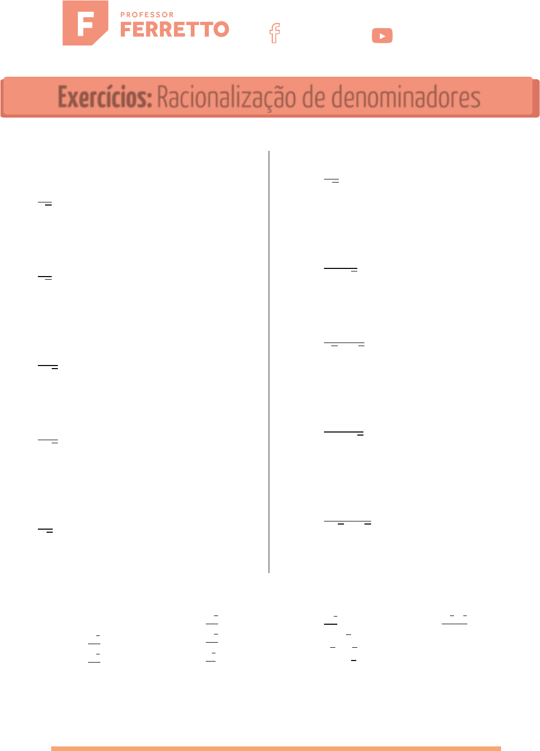 1 Racionalize o denominador de cada fração: 1. 3 √2 2. 4 √5 3. 10 3√5 4. 4 2√3 5. 1 √4 3 6. 3 √2 4 7. 1 2 + √3 8. 1 √3 − √2 9. 2 3 + 2√2 10. 1 3√2 − √3 GABARITO: 1. 3√2 2 2. 4√5 5 3. 2√5 3 4. 2√3 3 5. √2 3 2 6. 3 √8 4 2 7. 2 − √3 8. √3 + √2 9. 6 − 4√2 10. 3√2+√3 15 Exercícios: Racionalização de denominadores www.professorferretto.com.br ProfessorFerretto ProfessorFerretto http://www.professorferretto.com.br