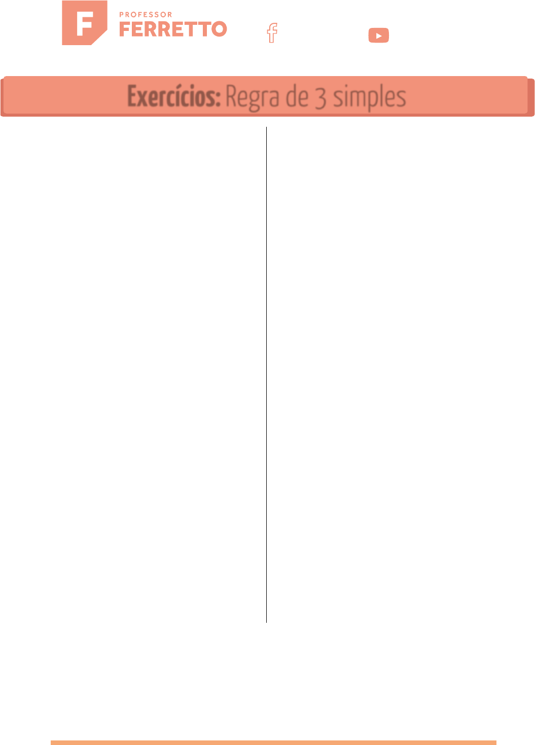 1 1. Uma fábrica produz 1.200 automóveis por dia, utilizando 6 máquinas. Se utilizar 13 máquinas nas mesmas condições, quantos automóveis produzirá por dia? 2. Quantos litros de leite são utilizados para fabricar 48 Kg de manteiga, se em 8 Kg de manteiga são utilizados 6 litros de leite? 3. Com 50 Kg de trigo, obtêm-se 35 Kg de farinha. Quantas sacas de 60 Kg de farinha podem ser obtidas com 1.200 Kg de trigo? 4. Uma torneira, despejando 5 litros de água por minuto, enche um tanque em 2 horas. Se a torneira despejasse 8 litros de água por minuto, quanto tempo levaria para encher o tanque? 5. Três máquinas cavam um túnel em 10 dias. Para cavá-lo em 2,5 dias quantas máquinas são necessárias? 6. Um avião, com velocidade de 800 quilômetros por hora, efetua uma viagem em 2 horas. Em quanto tempo efetuaria a mesma viagem, se sua velocidade fosse de 1.200 quilômetros por hora? 7. Um terreno retangular com 5 m de frente e 20 m de fundo custou R$ 800.000. Quanto custará outro terreno retangular com 10 m de frente e 30 m de fundo? 8. Uma máquina produz 20 peças em 25 min. Quantas peças produzirá em 35 min? 9. Uma vela de 36 cm de altura, diminui 1,8 mm por minuto, quanto tempo levará para se consumir? GABARITO: 1. 2600 2. 36 3. 14 4. 75 min 5. 12 6. 80 min 7. R$ 2.400.000 8. 28 9. 3h e 20 min Exercícios: Regra de 3 simples www.professorferretto.com.br ProfessorFerretto ProfessorFerretto http://www.professorferretto.com.br