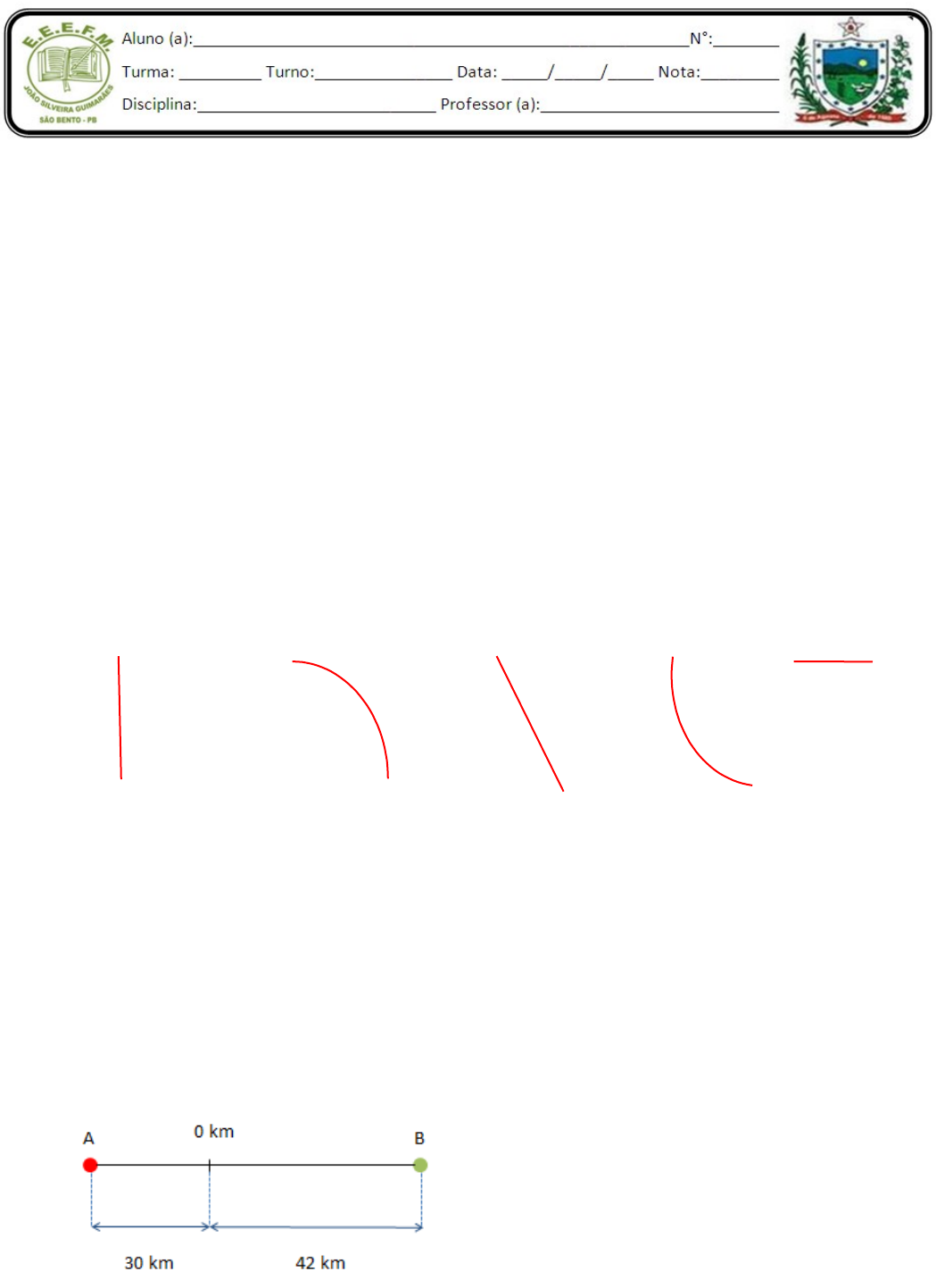 1) Das afirmações: I. Uma partícula em movimento em relação a um referencial pode estar em repouso em relação a outro referencial. II. A forma da trajetória de uma partícula depende do referencial adotado. III. Se a distância entre dois corpos permanece constante, então um está em repouso em relação ao outro. São corretas: a) apenas I e II. b) apenas III. c) apenas I e III. d) todas. e) apenas II e III. 2) Um objeto é solto de um aparelho ultraleve que se desloca, paralelamente ao solo, a baixa altura, com uma velocidade constante. Desprezando a resistência do ar, a representação gráfica da trajetória do objeto em relação ao solo é: a) b) c) d) e) 3) Você e um amigo resolvem ir ao último andar de um edifício. Vocês partem juntos do primeiro andar. Entretanto, você vai pelas escadas e seu amigo, pelo elevador. Depois de se encontrarem na porta do elevador, descem juntos pelo elevador até o primeiro andar. É correto afirmar que: a) o seu deslocamento foi maior que o de seu amigo. b) o deslocamento foi igual para você e seu amigo. c) o deslocamento de seu amigo do maior que o seu. d) a distância que seu amigo percorreu foi maior que a sua. e) n.d.a 4) O marco zero de uma estrada que une duas cidades, A e B, está localizado a 30 km de A e a 42 km de B. Considerando a trajetória orientada de A para B, qual o deslocamento de um veículo que vai do km 12 ao km 36? a) 12 km b) 24 km c) 36 km d) 48 km e) 60 km 5) Em certo instante, um automóvel encontra-se no km 120 de uma rodovia. Em outras palavras, o espaço do móvel nesse instante é igual a 120 km. Isso significa que: a) O automóvel já percorreu 120 km certamente. b) O automóvel está em movimento no referido instante, no sentido da trajetória. c) O automóvel, nesse instante, está em repouso. d) O automóvel encontra-se a 120 km do km 0, medidos ao longo da trajetória. e) n.d.a
