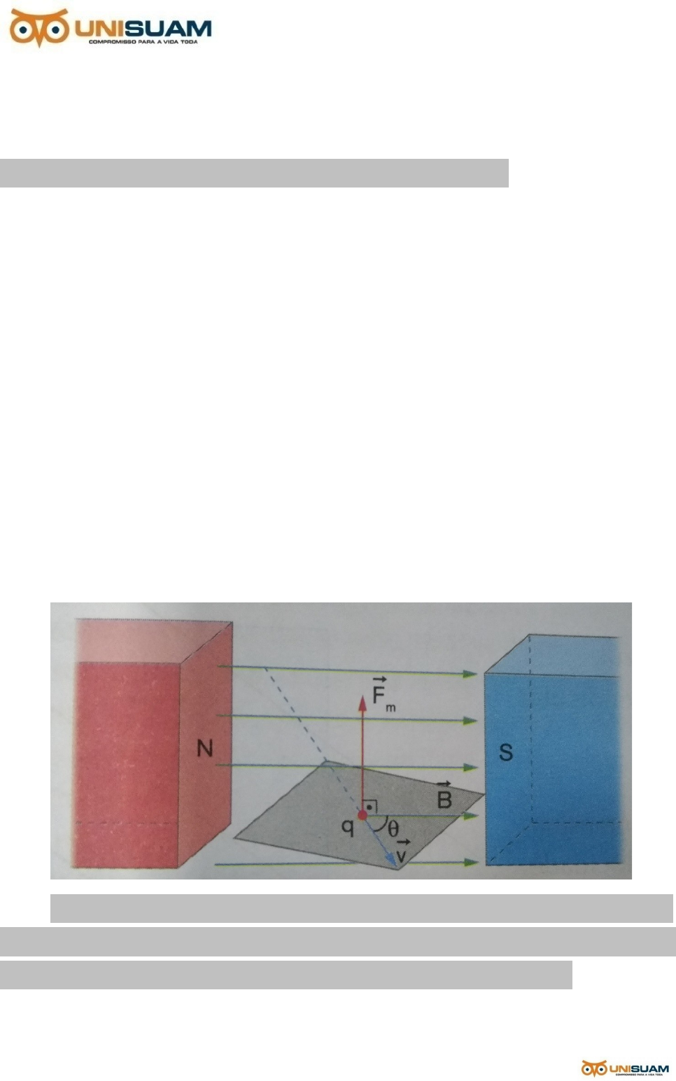 ELETROMAGNETISMO Força Magnética: Força Magnética sobre cargas elétricas móveis: A força magnética exercida sobre cargas elétricas em movimento submetidas a um campo magnético é chamado de, força de Lorentz. Em campos magnéticos uniformes, essa força de origem magnética, quando atua sobre uma carga em movimento, modifica apenas a direção da velocidade, e não o seu módulo, que permanece constante. Para determinar as características dessa força, considere uma carga elétrica q > 0 lançada dentro de um campo magnético uniforme, com velocidade vetorial v, formando um ângulo θ com o vetor indução magnética B. A carga positiva q, movendo-se com velocidade v em um campo magnético uniforme, fica sujeita à força magnética Fm perpendicular ao plano definido pelas direções de B e v. São características da força magnética Fm que age sobre a carga: · Direção: perpendicular ao plano formado pelos vetores B e v. · Sentido: dado pela regra da mão esquerda. Para isso, disponha os dedos polegar, indicador e médio, conforme a figura a seguir. O indicador representa o sentido de B; o dedo médio, o sentido de v; e o polegar, o sentido Fm . Se a carga for positiva, o sentido de Fm é o indicado pelo polegar na figura e, se a carga for negativa, o sentido de Fm é o contrário do dado pelo polegar. · Sentido: experimentalmente verificou-se que a intensidade da força magnética é dada pela expressão: Fm = q . v . B sem θ Unidade de medida do campo magnético no SI = Tesla (T) Cargas elétricas em campo magnético uniforme: · 1o Caso: carga em repouso (v = 0) Fm = q . v . B sen θ → Fm = 0 · 2o Caso: carga lançada na direção do campo (v paralelo a B). θ = 0o → sem θ = 0 (carga lançada no sentido do campo) θ = 180o → sem θ = 0 (carga lançada no sentido contrário ao do campo) Fm = q . v . B sen θ → Fm = 0 Como a força é nula, a carga, movendo-se na direção do campo, realiza movimento retilíneo uniforme. Para o 1o e 2o caso, podemos concluir: Cargas elétricas em repouso ou movendo-se na direção do campo magnético não sofrem a ação da força magnética. · 3o Caso: carga lançada perpendicularmente ao campo (v perpendicular a B). B é perpendicular ao plano da folha. θ = 90o → sem θ = 1 (velocidade perpendicular ao campo) Fm = q . v . B sen θ → Fm = q . v . B Nesses casos, a força magnética tem intensidade constante e é perpendicular ao vetor velocidade. Portanto, a força magnética atuante na partícula de carga q e massa m é centrípeta, e a partícula realiza movimento circular uniforme de raio R. Fm = Fcp q. v . B = m . v2 / R → R = m . v / q . B que é a expressão do raio R da trajetória descrita pela carga. Numa volta completa: s = 2 R e t = T. s = v . t 2 R = v. T Substituindo → R = m . v / q . B, obtemos a expressão para o cálculo do período. T = · 4o Caso: carga lançada obliquoamente ao campo magnético. Vamos considerar uma carga lançada com velocidade v formando um ângulo diferente de 0o, 90o e 180o. O movimento correspondente à componente v é retilíneo e uniforme (MRU), ao passo que o movimento devido à componente v é MCU. A composição desses dois movimentos é um movimento helicoidal simples e a trajetória descrita é uma hélice cilíndrica. EXERCÍCIOS: 1) Uma partícula com carga 5 C desloca-se com velocidade de 1.000 m/s, formando um ângulo de 30o com um campo magnético uniforme de intensidade 0,8 T, conforme representado na figura abaixo. Caracterize a força magnética que atua sobre a partícula. 2) Um elétron com velocidade de 3.106 m/s penetra perpendicularmente em um campo magnético uniforme de indução magnética 8.10-5 T, passando a descrever uma trajetória circular uniforme indicada na figura. A massa do elétron é 9,1.10-31 Kg e sua carga é 1,6.10-19 C. Calcule: A) O raio R da trajetória descrita pelo elétron entre os pontos M e N; B) O intervalo de tempo t decorrido entre a entrada e a saída do elétron do campo magnético uniforme. Eletromagnetismo - AJDS