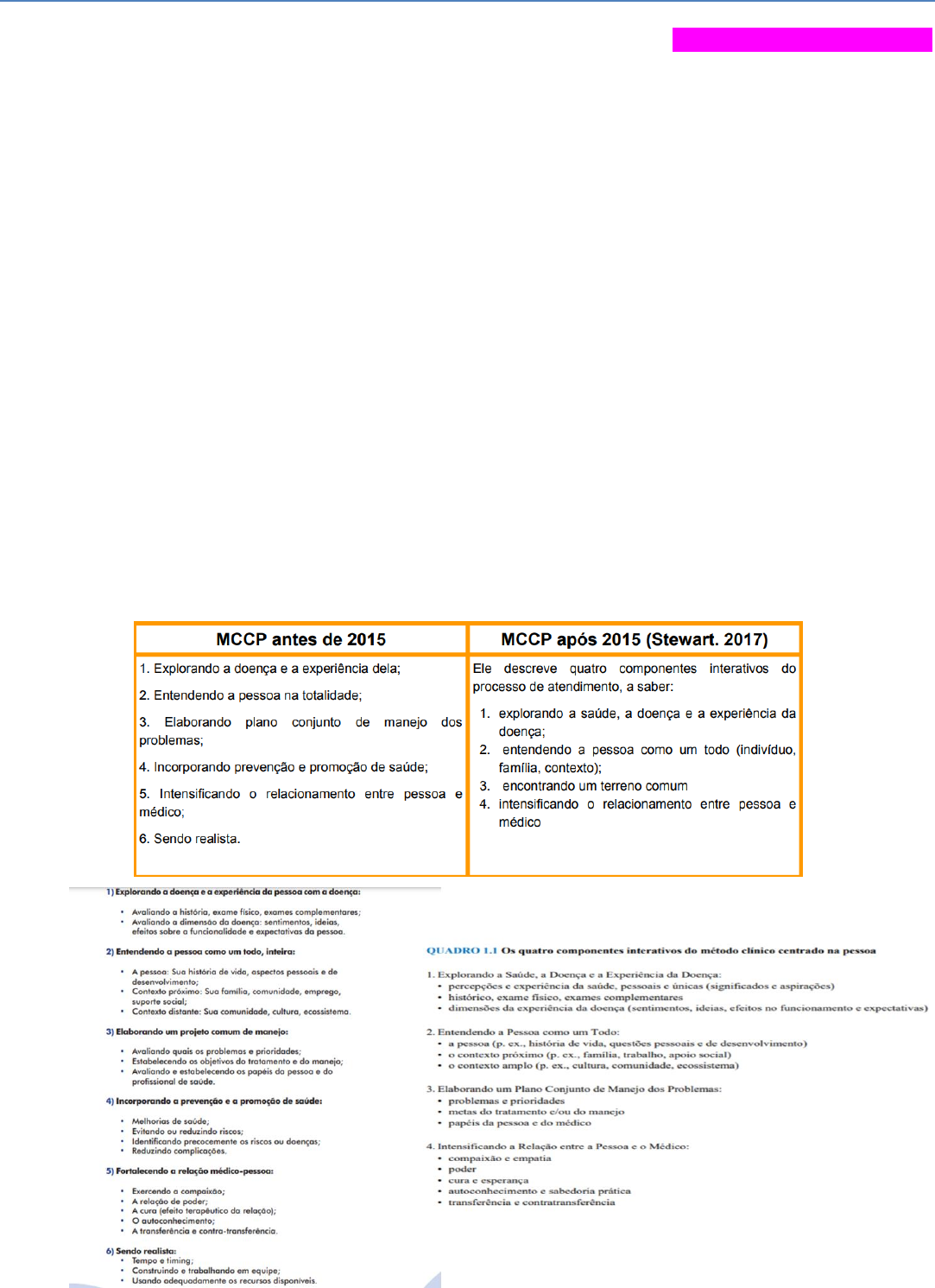 MÉTODO CLÍNICO CENTRADO NA PESSOA Vitória Correia Moura – T4C O Método Clínico Centrado na Pessoa (MCCP) surgiu da demanda das pessoas por um atendimento que contemplasse de maneira mais integral suas necessidades, preocupações e vivências relacionadas à saúde ou às doenças. A abordagem centrada na pessoa apresenta diversos resultados positivos, tais como: • maior satisfação das pessoas e médicos; • melhora na aderência aos tratamentos; • redução de preocupações e ansiedade; • redução de sintomas; • diminuição na utilização dos serviços de saúde; • diminuição das queixas por má-prática; • melhora na saúde mental; • melhora na situação fisiológica e na recuperação de problemas recorrentes. O Método propõe, em seus diversos componentes, um conjunto claro de orientações para que o profissional de saúde consiga uma abordagem mais centrada na pessoa. Ele está estruturado em seis componentes, que são complementares entre si. O profissional experiente é capaz de perceber o momento adequado para lançar mão de um ou outro dos componentes, de acordo com o fluir da sua interação com a pessoa que procura atendimento. Vitória Correia Moura – T4C Para entender melhor a experiência da pessoa em relação à doença, o profissional de saúde deve estar atento a sinais e indicações dadas pelas pessoas durante o atendimento. Deve-se indagar que fatores levaram uma determinada pessoa a buscar atendimento naquele momento específico. Muitas vezes, esses fatores poderão ser tão esclarecedores do processo que a pessoa vive quanto o próprio diagnóstico clínico. Torna-se importante o exercício da escuta ativa, como ferramenta para ajudar a desvendar aspectos eventualmente ocultos pelas manifestações físicas. O entendimento da pessoa como um todo melhora a interação do médico com a pessoa sendo cuidada e pode ser muito útil quando os sinais e sintomas não apontam uma doença claramente definida, ou quando a resposta a uma experiência de doença parece exagerada ou fora de propósito. Justamente no momento de maior vulnerabilidade, a pessoa pode ficar sozinha com dúvidas fundamentais e grandes preocupações, quando mais necessitaria de compartilhá-las. Mostrar abertura para que a pessoa manifeste essas questões, ouvir atentamente e sem julgamento é parte da abordagem centrada na pessoa. O Método Clínico Centrado na Pessoa propõe que se elabore um plano conjunto de manejo dos problemas. Nesse processo a pessoa atendida e o profissional de saúde procuram alcançar um entendimento mútuo e estabelecer uma concordância em três áreas-chave: a definição do(s) problema(s), o estabelecimento de prioridades e metas para o tratamento ou manejo da doença e a identificação dos papéis a serem assumidos por cada um. É importante que o profissional utilize uma linguagem que elas possam entender, evitando termos técnicos complicados. A elaboração de um plano comum de manejo parte da relação do profissional com a pessoa que busca atendimento. Essa relação ocorre a cada encontro e tende a se fortalecer ao longo do tempo. Vitória Correia Moura – T4C As estratégias de prevenção de doenças se dividem em: evitar riscos (prevenção primária), reduzir riscos (prevenção secundária) e identificar precocemente e reduzir complicações (prevenção terciária). Poderia ainda ser incluída a prevenção quaternária, voltada para reduzir ou evitar os danos causados pelo intervencionismo excessivo nos cuidados de saúde (iatrogenia). O profissional deve avaliar seis aspectos do mundo da pessoa: a experiência dos determinantes mais amplos de saúde ao longo da vida, a doença atual e as potenciais, a experiência de saúde e de doença, o potencial para a saúde, o contexto e o relacionamento entre a pessoa e o profissional. Certos atributos como a empatia, a compaixão e o cuidado, devem ser cultivados nos relacionamentos entre pessoas e profissionais de saúde, pois aumentam as chances de que a relação contribua para o projeto terapêutico acordado entre elas. O ser realista implica ainda em reconhecer que, para se obter um cuidado mais abrangente, em muitas situações é necessário o trabalho em equipe interdisciplinar.