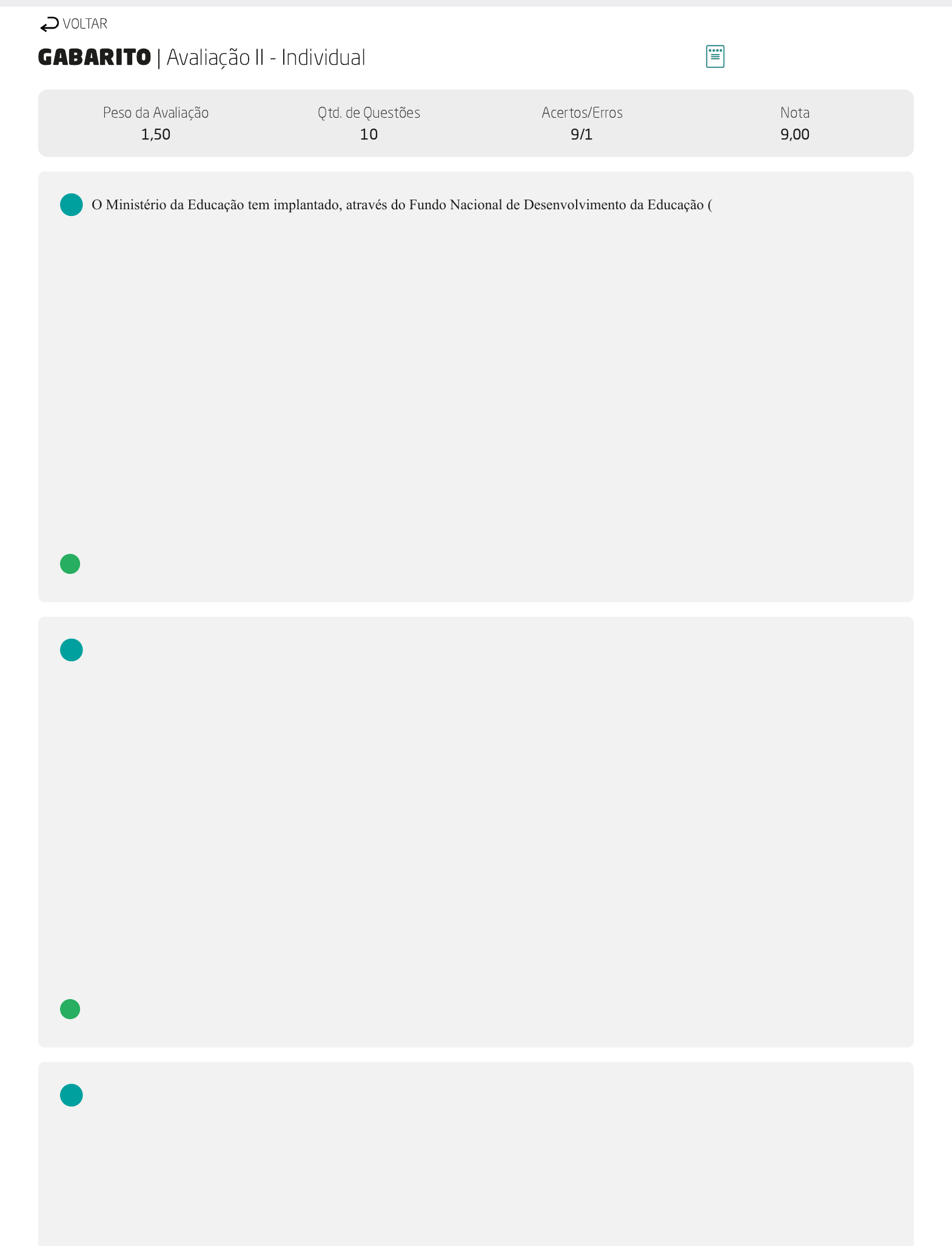 GABARITO | Avaliação II - Individual Peso da Avaliação 1,50 Qtd. de Questões 10 Acertos/Erros 9/1 Nota 9,00 O Ministério da Educação tem implantado, através do Fundo Nacional de Desenvolvimento da Educação (FNDE), inúmeros programas e projetos de desenvolvimento, com isso podemos afirmar que o Governo Federal se tornou parceiro dos 26 estados com seus respectivos municípios. É importante ressaltar que nesse contexto, os repasses financeiros são divididos em convênios constitucionais, automáticos e voluntários. Considerando o processo de formação continuada, analise as sentenças a seguir: I- Objetiva a capacitação de todos os profissionais da educação. II- Objetiva a capacitação de técnicos e gestores públicos, tanto municipais como estaduais. III- Objetiva a capacitação de representantes da comunidade escolar e sociedade organizada. IV- Objetiva a capacitação somente de professores das redes estaduais. Assinale a alternativa CORRETA: A Somente a sentença II está correta. B Somente a sentença IV está correta. C Somente a sentença I está correta. D As sentenças I, II e III estão corretas. O MEC (Ministério da Educação), através da Educação Integral no Ensino Fundamental, elaborou programas como o ProEMI (Programa Ensino Médio Inovador) e o Mais Educação. O ProEMI objetiva apoiar, aprimorar e fortalecer o desenvolvimento de propostas curriculares inovadoras em escolas com Ensino Médio. Quanto ao programa Mais Educação, criado a partir da Portaria Ministerial 17/2007, analise as sentenças a seguir: I- Sua aplicação ocorre no Ensino Médio e CEJA. II- Desenvolve-se, nesse programa, atividades de educação integral. III- Amplia as oportunidades educativas aos educandos do ensino fundamental. IV- Fomenta carga horária de cinco horas, no máximo. Assinale a alternativa CORRETA: A As sentenças I e II estão corretas. B As sentenças I, III e IV estão corretas. C As sentenças II e IV estão corretas. D As sentenças II e III estão corretas. Ao tratarmos dos níveis e modalidades de ensino, estamos nos deparando com a organização, com as diferentes maneiras de se fazer educação. Diante disso, são três as modalidades de educação. Sobre essas modalidades e sua funcionalidade, analise as sentenças a seguir: I- Educação intencional, voltada ao meio social, cultural em que o homem está exposto. Educação formal, que ocorre nas escolas de maneira organizada pelas leis. Educação não formal desenvolve-se fora das escolas. II- Educação informal ocorre nas escolas particulares e religiosas; Educação formal desenvolve-se a partir de objetivos ecológicos e raciais. Educação não formal não é intencional. VOLTAR Alterar modo de visualização 1 2 3 Marcos Vinicius Mosconi Ewerling Formação Pedagógica em Física 0 III- Educação não formal possui uma estrutura e sistematização escassa. Educação informal ocorre através da influência do meio em que o homem vive. Educação formal organiza-se de forma organizada e sistemática. IV- Educação formal é insuficiente e não possui organização. Educação não formal é voltada para educandos estrangeiros. Educação informal é desenvolvida por grupos minoritários. Assinale a alternativa CORRETA: A As sentenças II e IV estão corretas. B Somente a sentença III está correta. C Somente a sentença II está correta. D As sentenças I e III estão corretas. Segundo o portal do MEC, a Base Nacional Comum Curricular é um documento de caráter normativo que define o conjunto orgânico e progressivo de aprendizagens essenciais que todos os alunos devem desenvolver ao longo das etapas e modalidades da Educação Básica, conforme definido na Lei de Diretrizes e Bases da Educação Nacional (LDB, Lei nº 9.394/1996). Sobre os entendimentos da Base Nacional Comum Curricular, analise as sentenças a seguir: I- Entende-se a BNCC como um norteador dos currículos dos sistemas e redes de ensino das Unidades Federativas. II- Entende-se a BNCC como base comum de documentos elaborados a partir de informações relativas a tendências pedagógicas voltadas aos interesses do sistema governamental. III- Entende-se a BNCC como documento desenvolvido através de interesses da classe dominante, a qual determina o que, para que e o quanto deve ser apresentado aos educandos. IV- Entende-se por propostas pedagógicas de todas as escolas públicas e privadas da Educação Infantil, Ensino Fundamental e Médio em todo o país. Assinale a alternativa CORRETA: FONTE: BRASIL, Ministério da Educação. BNCC. Disponível em: <http://basenacionalcomum.mec.gov.br/>. Acesso em: 10 ago. 2018. A As sentenças I e II estão corretas. B As sentenças I e IV estão corretas. C As sentenças III e IV estão corretas. D As sentenças II e III estão corretas. Na Constituição Brasileira encontramos nomeados símbolos oficiais que determinam nossa filosofia, nossa maneira de ser, nossa referência patriótica. Estes símbolos devem ser trabalhados e respeitados pelos cidadãos em qualquer faixa etária. Nas escolas, estes símbolos são apresentados às crianças para que desenvolvam seu patriotismo. Quais são esses símbolos nacionais? A Bandeira Nacional, Hino à Bandeira, Brasão Imperial, Selo da Inconfidência Mineira. B Selo da Independência, Hino da Independência, Brasão da Monarquia, Bandeira Mineira. C Bandeira Nacional, Hino Nacional, Brasão da República, Selo da República. D Hino da Inconfidência, Brasão Nacional, Bandeira Nacional, Selo da Marinha nacional. O Brasil assinou um documento na Tailândia que determinava alguns objetivos e os trouxe na mala com a responsabilidade que colocá- los em práticas. Este documento foi assinado por todos os países que se fizeram presentes e que fazem parte da organização - Banco Mundial. Frente a isso, o Brasil retirou deste documento orientações para a elaboração de um plano. Sobre este plano, classifique V para as opções verdadeiras e F