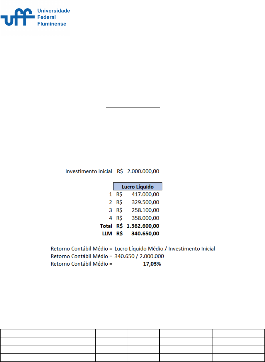 Universidade Federal Fluminense Pós-Graduação em Controladoria e Finanças Disciplina: Análise de Investimentos Prof.: Osiris Marques Grupo 6: Julliana Brasil, Larissa Vasconcelos, Luciana Lyrio. Exercícios: Lista 2 Questão 1 Você está decidindo se expande ou não sua empresa com a construção de uma nova fábrica. A fábrica possuir um custo de instalação de $ 2 milhões, que será depreciado em linha reta ao longo de sua vida de quatro anos. Sabendo que o projeto tem lucros líquidos estimados de $417.000, $ 329.500, $ 258.100 e $ 358.000 durante esses quatro anos, qual é o retorno contábil médio? Qual seria o critério de decisão desta empresa para este projeto? Questão 2 Um analista financeiro de um banco de investimetnos recebeu informações de quatro empresas. Analisando a lucratividade e rentabilidade, qual das quatro empresas abaixo apresentou melhor desempenho global? Empresa Alfa Beta Gama Delta Vendas $ 20.000,00 9.600,00 10.500,00 6.000,00 Lucro $ 200,00 240,00 300,00 600,00 Investimento ou ativo total 4.000,00 2.400,00 4.500,00 30.000,00 Questão 3 A Loja de Mochilas Ltda. Compra cada mercadoria incorrendo em um custo médio igual a $20,00. O preço médio praticado pela empresa é igual a $28,00. Fora o custo da mercadoria vendida, todos os demais gastos são fixos. Os gastos mensais desembolsáveis da empresa totalizam $3.200,00. Gastos com depreciação são iguais a $ 800,00 por mês. Os sócios investiram $ 40 mil na operação, desejando obter um retorno igual a 2% a.m. Com base nas informações, calcule o ponto de equilíbrio: a) Contábil b) Financeiro c) Econômico Questão 4 O grupo hoteleiro Praias do Norte pensa na possibilidade de construção de uma nova pousada em Pipa, no Rio Grande do Norte. Três alternativas estão sendo analisadas, denominadas Mares da Terra, Enseada da Lua e Morada do Sol. Os fluxos de caixa previstos estão apresentados na tabela seguinte: Ano Mares da Terra Enseada da Lua Morada do Sol 0 -300 -550,00 -700,00 1 80 200,00 250,00 2 100 250,00 300,00 3 120 300,00 350,00 4 140 350,00 400,00 5 150 550,00 6 160 Sabendo que a TMA da operação é igual a 22% a.a., pede-se: a. Calcular o payback simples e descontado dos três projetos; b. Se o projeto com menor payback fosse o escolhido, qual seria o projeto? a) b) O melhor projeto a ser escolhido, seria o Enseada da Lua, com menor Payback Simples e também, menor Payback Descontado. GABARITO 1. RCM = 17,03% 2. Uma empresa pode ser rentável mesmo sem ser lucrativa ou, ainda, ser lucrativa sem obter um retorno positivo com os investimentos. Em termos de desempenho global, a rentabilidade deve ser priorizada, já que o retorno dos investimentos. Neste caso, a empresa Beta é a que apresenta melhor desempenho global. 3. a) PEC = 500 unidades/R$14.000; b) PEF = 400 unidades/R$ 11.200,00; c) PEE = 600 unidades/R$ 16.800,00 4. a) • Payback simples: Mares da terra = 3 anos; Enseada da Lua = 2 anos e 4 meses; Morada do Sol = 2 anos e 5 meses • Payback descontado: Mares da terra = 4 anos e 8 meses; Enseada da Lua = 3 anos e 4 meses; Morada do Sol = 3 anos e 7 meses b) Tanto pelo critério do Payback Simples quanto pelo Descontado o projeto que apresentou menor tempo de recuperação foi a Enseada da Lua.