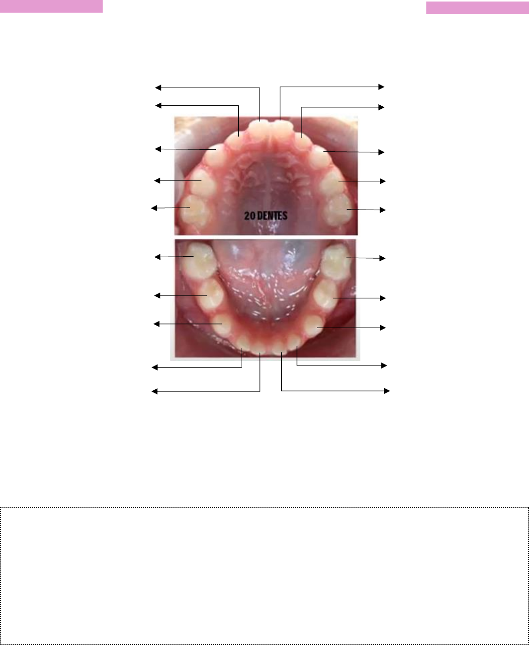 Dentição decídua Dentição decídua Incisivo central superior esquerdo decíduo Incisivo central superior direito decíduo Incisivo central inferior direito decíduo Incisivo central inferior esquerdo decíduo Incisivo lateral inferior esquerdo decíduo Incisivo lateral inferior direito decíduo Incisivo lateral superior direito decíduo Incisivo lateral superior esquerdo decíduo Canino superior esquerdo decíduo Canino inferior esquerdo decíduo Canino inferior direito decíduo Canino superior direito decíduo 1º molar superior esquerdo decíduo 1º molar superior direito decíduo 1º molar inferior direito decíduo 1º molar inferior esquerdo decíduo 2º molar superior esquerdo decíduo 2º molar superior direito decíduo 2º molar inferior direito decíduo 2º molar inferior esquerdo decíduo ✓ O incisivo central permanente vai erupcionar no lugar do incisivo central decíduo. ✓ O incisivo lateral permanente vai erupcionar no lugar do incisivo lateral decíduo. ✓ O canino permanente vai erupcionar no lugar do canino decíduo. ✓ No lugar do primeiro molar decíduo irá erupcionar o primeiro pré-molar. ✓ No lugar do segundo molar decíduo irá erupcionar o segundo pré-molar. ✓ Em crianças com 6 ou 7 anos, começa a erupcionar atrás do local do segundo molar decíduo, o primeiro molar permanente, sem que nenhum dente tenha caído. Kelen Turella Schneider 51 52 53 54 55 61 62 63 64 65 85 84 83 82 81 71 72 73 74 75