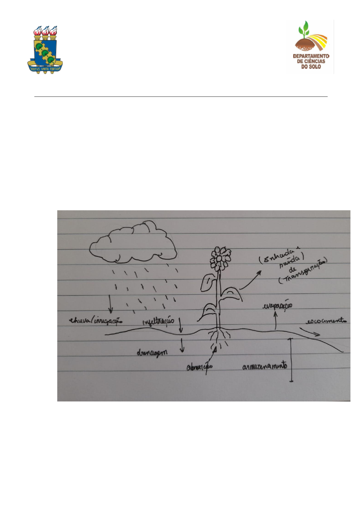 UNIVERSIDADE FEDERAL DO CEARÁ CENTRO DE CIÊNCIAS AGRÁRIAS DEPARTAMENTO DE CIÊNCIAS DO SOLO FÍSICA DO SOLO ESTUDO DIRIGIDO 5 1. “A água é uma substância de importância agronômica”. Apresente argumentos que justifiquem essa afirmação. R: Como principal componente e representante da fase líquida do sistema-solo, a água tem variadas funções relacionadas ao sistema agrícola e consequentemente às plantas/cultivo. A presença/falta de água no sistema influencia na densidade de espécies vegetais na área, no fechamento de estômatos e na taxa fotossintética, no murchamento pela diminuição da pressão de turgor, na desorganização do protoplasma pela desidratação em regimes escassos e também é o principal meio de veiculação de elementos e nutrientes para dentro da planta, permitindo a nutrição e consequentemente o seu desenvolvimento. 2. Faça um esquema (desenho) mostrando o balanço de água na agricultura, tecendo comentários sobre cada um de seus componentes. 3. Defina umidade do solo e apresente dois modos de obtê-la matematicamente. R: É a quantidade ou conteúdo de água armazenada no solo. Umidade com base em massa: u = (mu - ms)/ms Umidade com base em volume: θ = Va/Vt (da=Ma/Va e ds= Ms/Vt) Prof. Assis Júnior 20.01.2021 4. Uma amostra de solo de 1000 cm3 tem massa úmida de 1460 g e massa seca de 1200 g. Considerando a densidade das partículas igual a 2,65 g cm-3, calcule: 1.1 a umidade do solo em base massa; R: u = (1460 - 1200)/1200 = 0,217 g/g ou 21,70% 1.2 a umidade do solo em base volume R: θ = Va/Vt => Ma=1460-1200 = 260g (densidade da água = 1 g/cm³) Da = Ma/Va => 1= 260/Va = 260cm³ θ = 260/1000 = 0,260 cm³/cm-³ 1.3 a densidade do solo; R: ds = Ms/Vt => ds=1200/1000 => ds=1,2g.cm³ 1.4 a porosidade total do solo; R: n = 1 - ds/dp => 1- 1,2/2,65 = 0,547cm³/cm-³ ou 54,7% 1.5 a porosidade livre de água. R: E = (Vv - Va)/Vt ou (n - θ) E = 0,5477-0,260 = 0,287cm³/cm-³ 5. O teor de água de um solo, com base em volume é 32,8%. Qual o valor da umidade do solo com base em massa sabendo-se que a densidade do solo é 1,12 g cm-3? θ=32,8% = 0,3280 cm³/cm-³ ds= 1,12 g cm-3 θ = M x ds => 0,3280= M x 1,12 M = 0,293 g.g -¹ 6. Uma pergunta aparentemente simples: o que é água? R: Como definição básica: Uma molécula de geometria angular dipolo. Um recurso natural abundante, caracterizado por ser líquido, incolor e insípido. Além do estado líquido, pode ser encontrado também no estado sólido, constituindo as geleiras e neves, e também no estado de vapor, encontrado no ar e constituindo as nuvens e a neblina. No solo, é caracterizada por não ser pura, logo, solução do solo, por conter gases e sais dissolvidos em quantidades variáveis, susceptível de ionização, solubilização e suspensão. Prof. Assis Júnior 20.01.2021